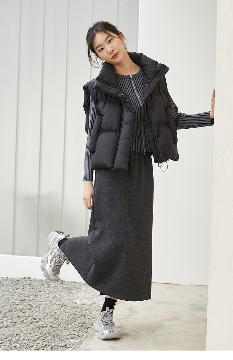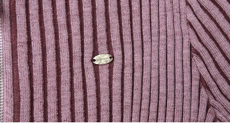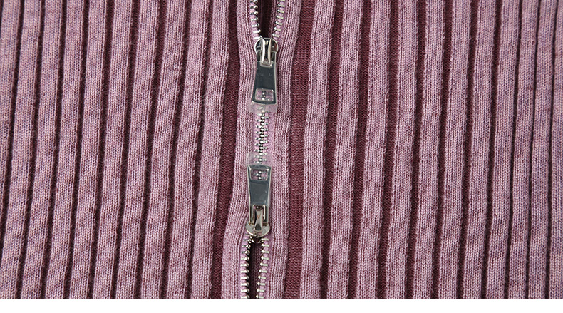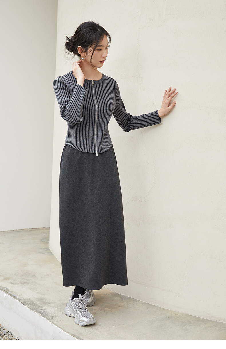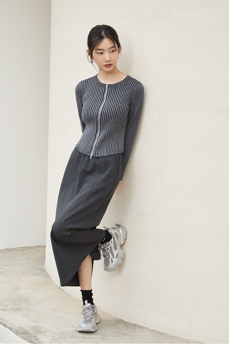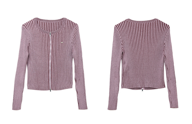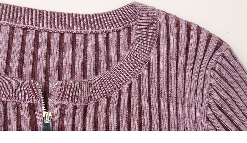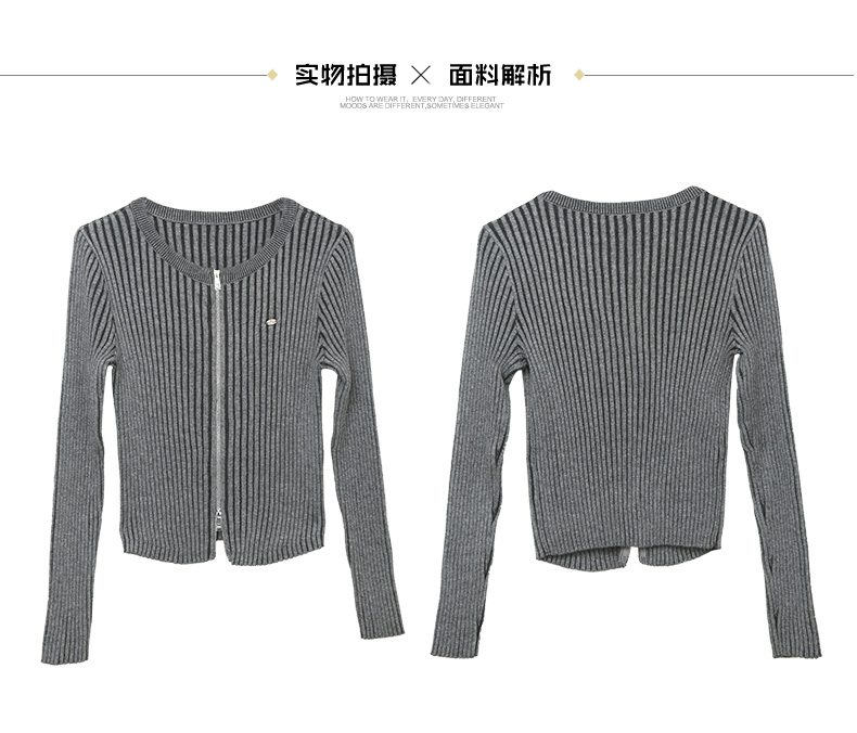 灰色坑条双拉链针织开衫 修身短款圆领长袖上衣 秋冬季辣妹风显瘦百搭叠穿毛衣外套