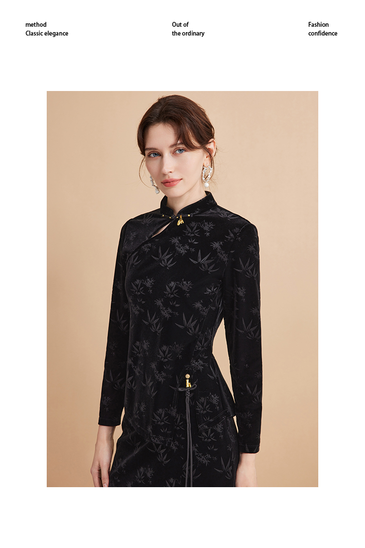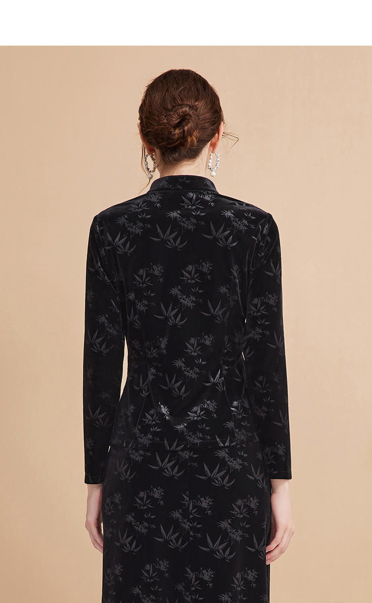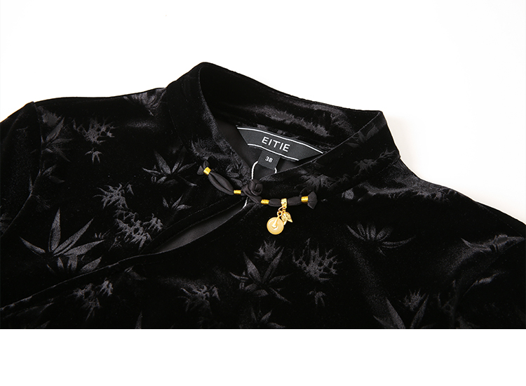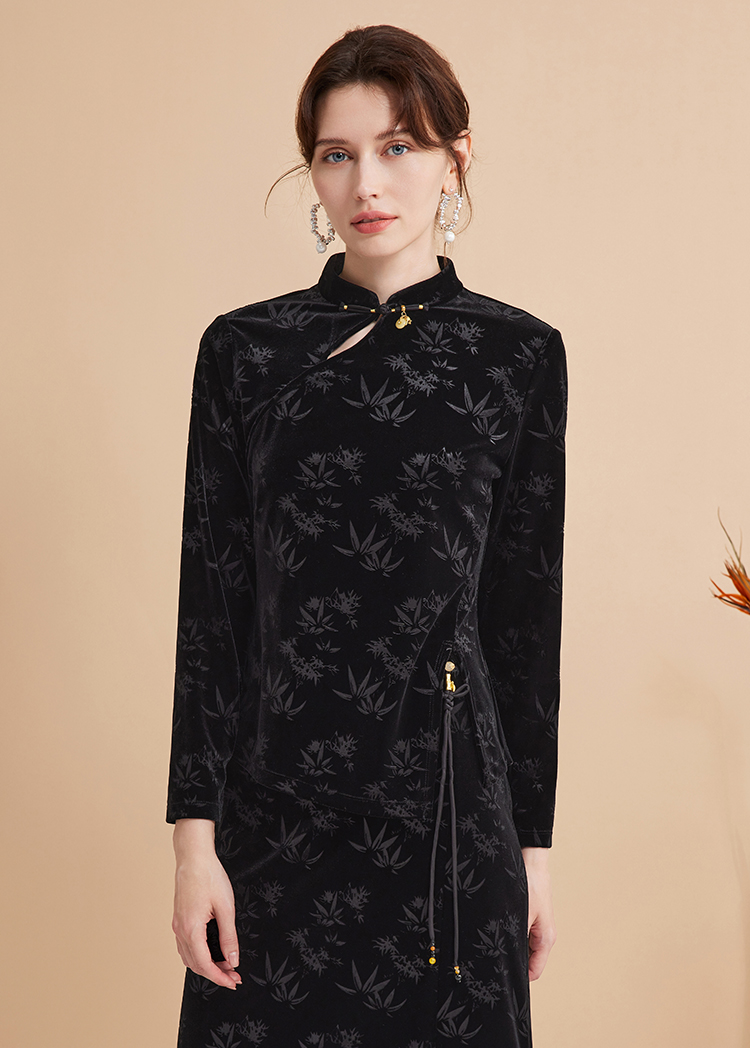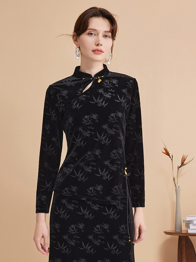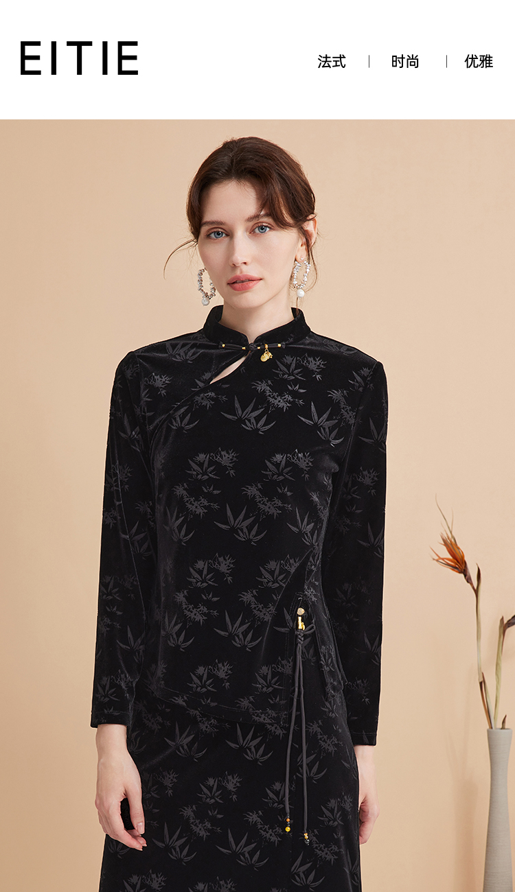 EITIE爱特爱秋季新款新中式盘扣印花暗纹气质显瘦黑色上衣C2413430