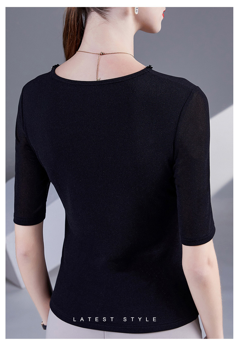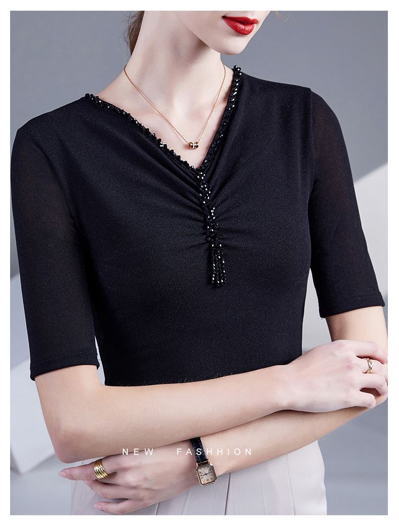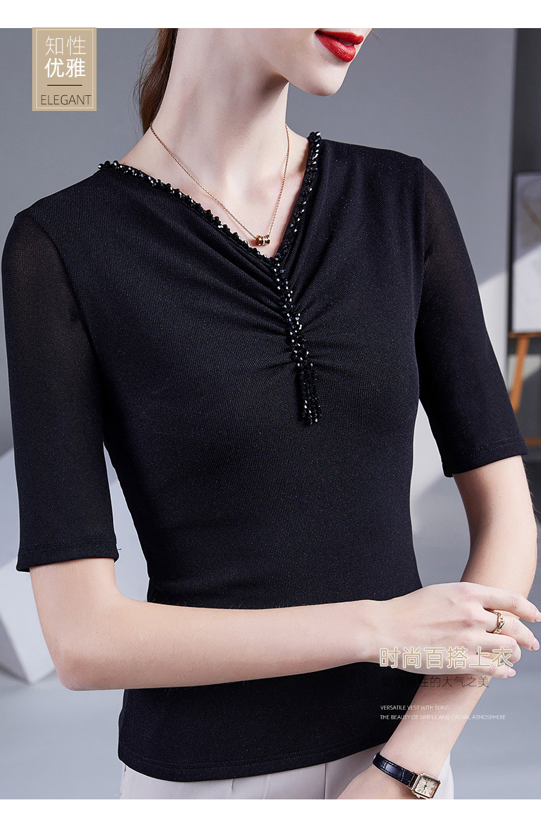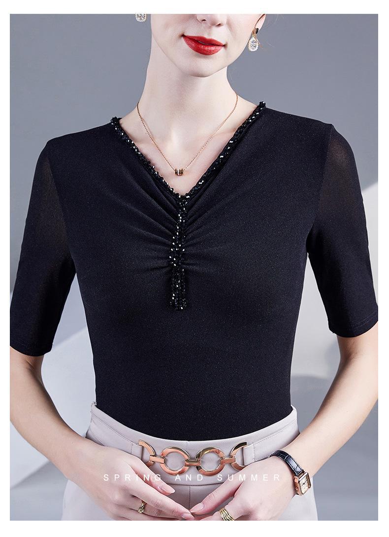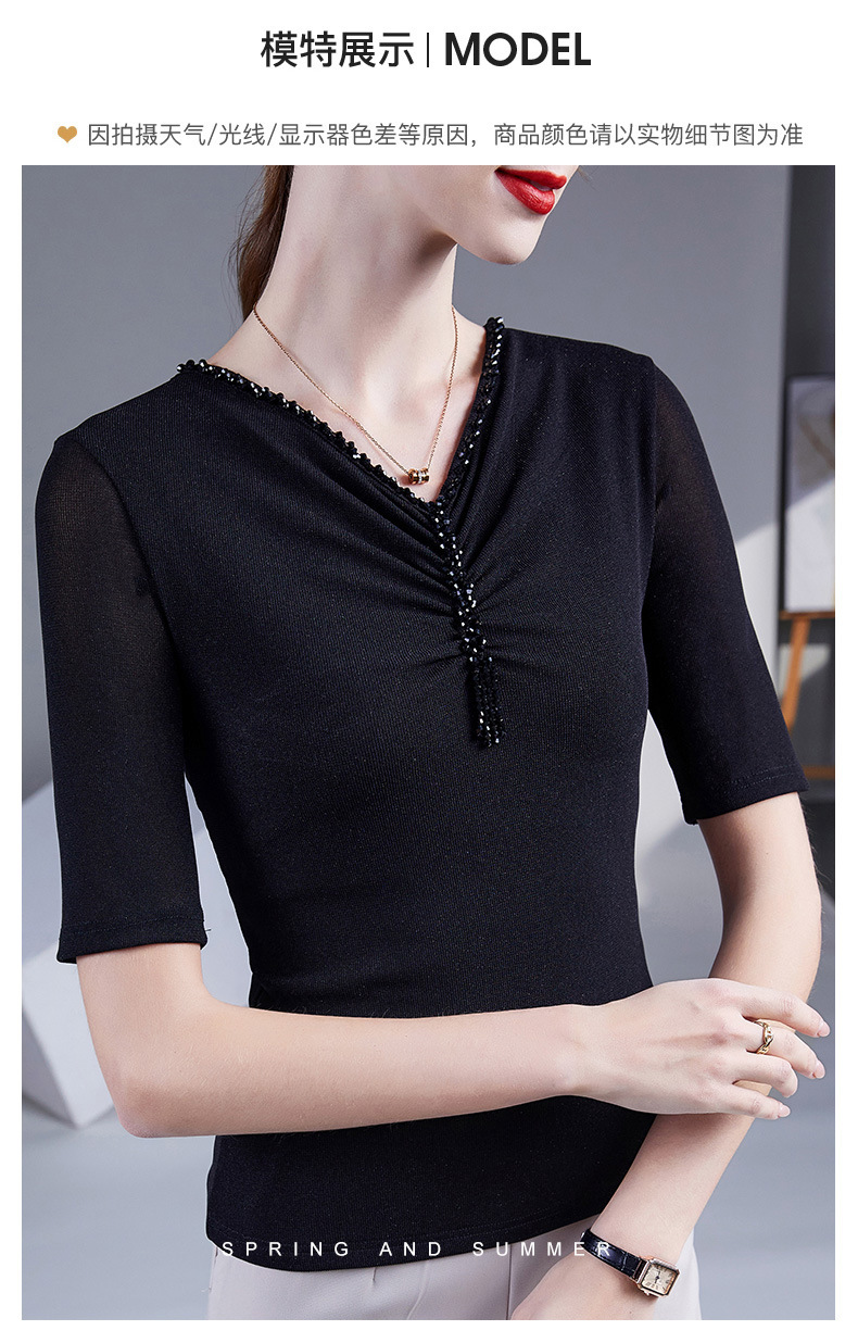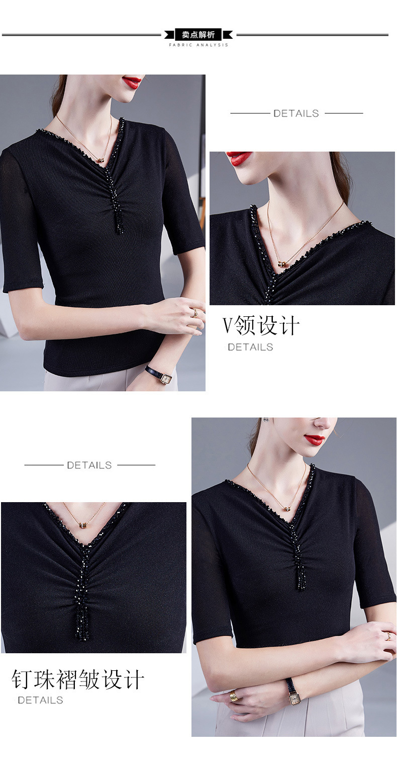 百媚生 中袖小衫V领钉珠网纱T恤女五分袖打底衫MC46893