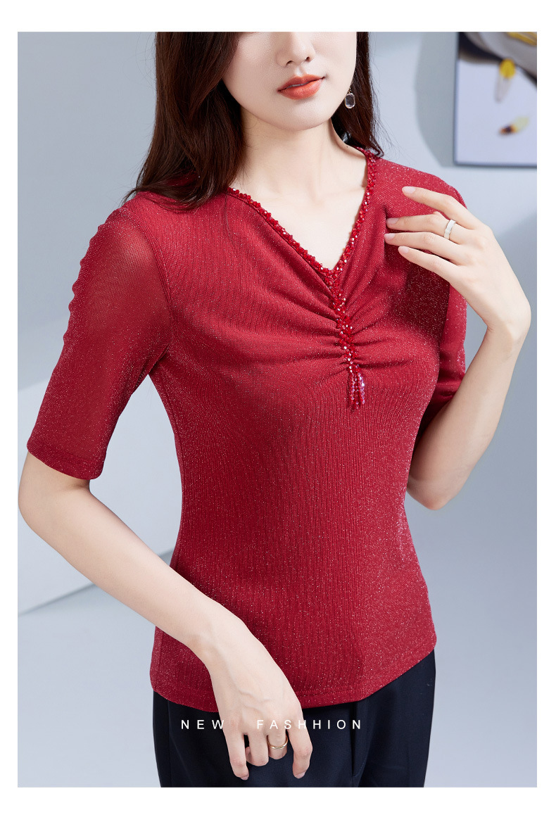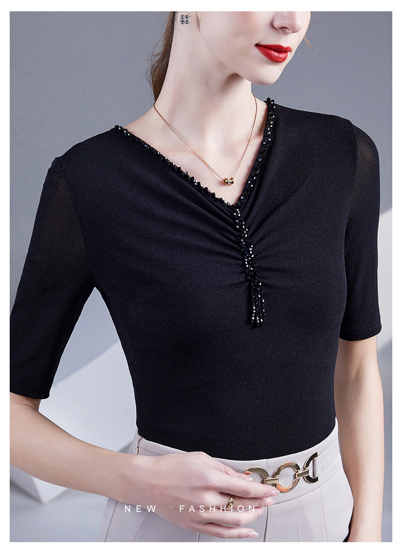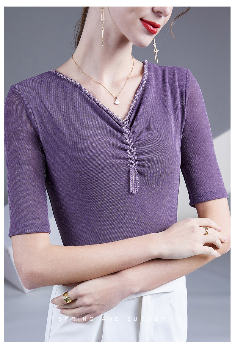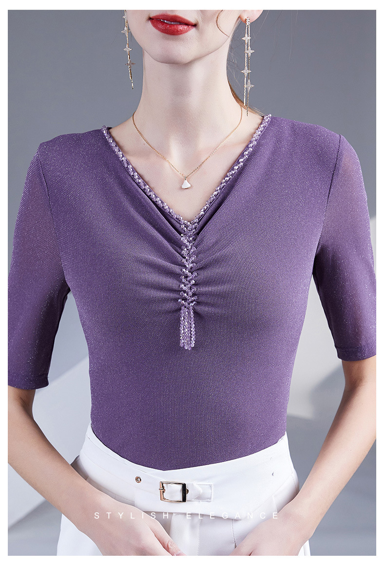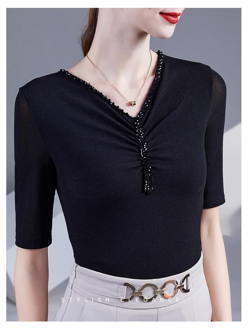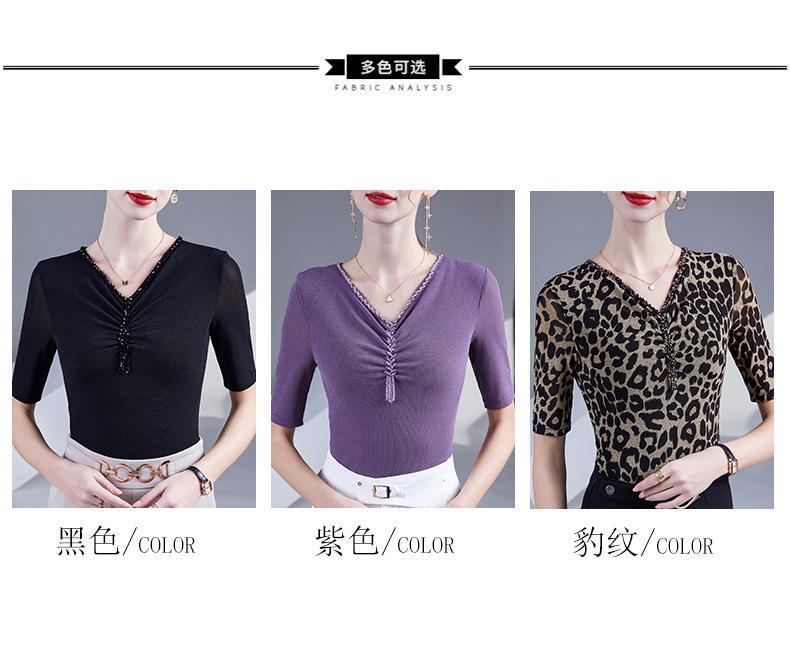 百媚生 中袖小衫V领钉珠网纱T恤女五分袖打底衫MC46893