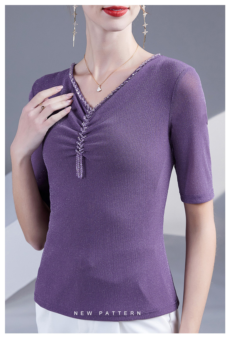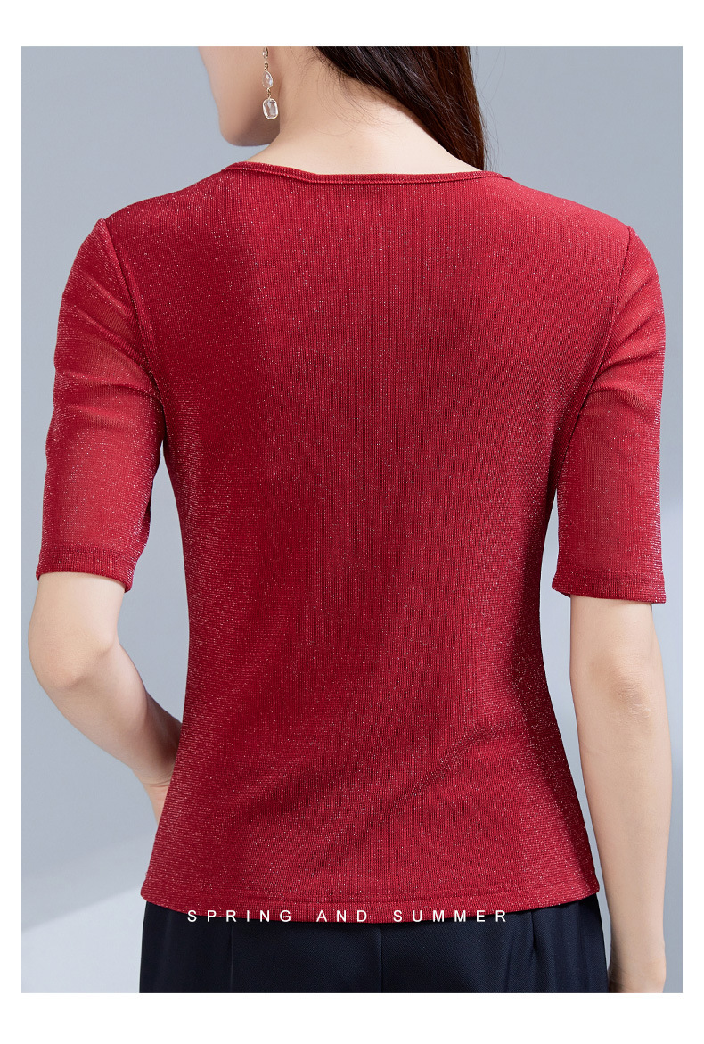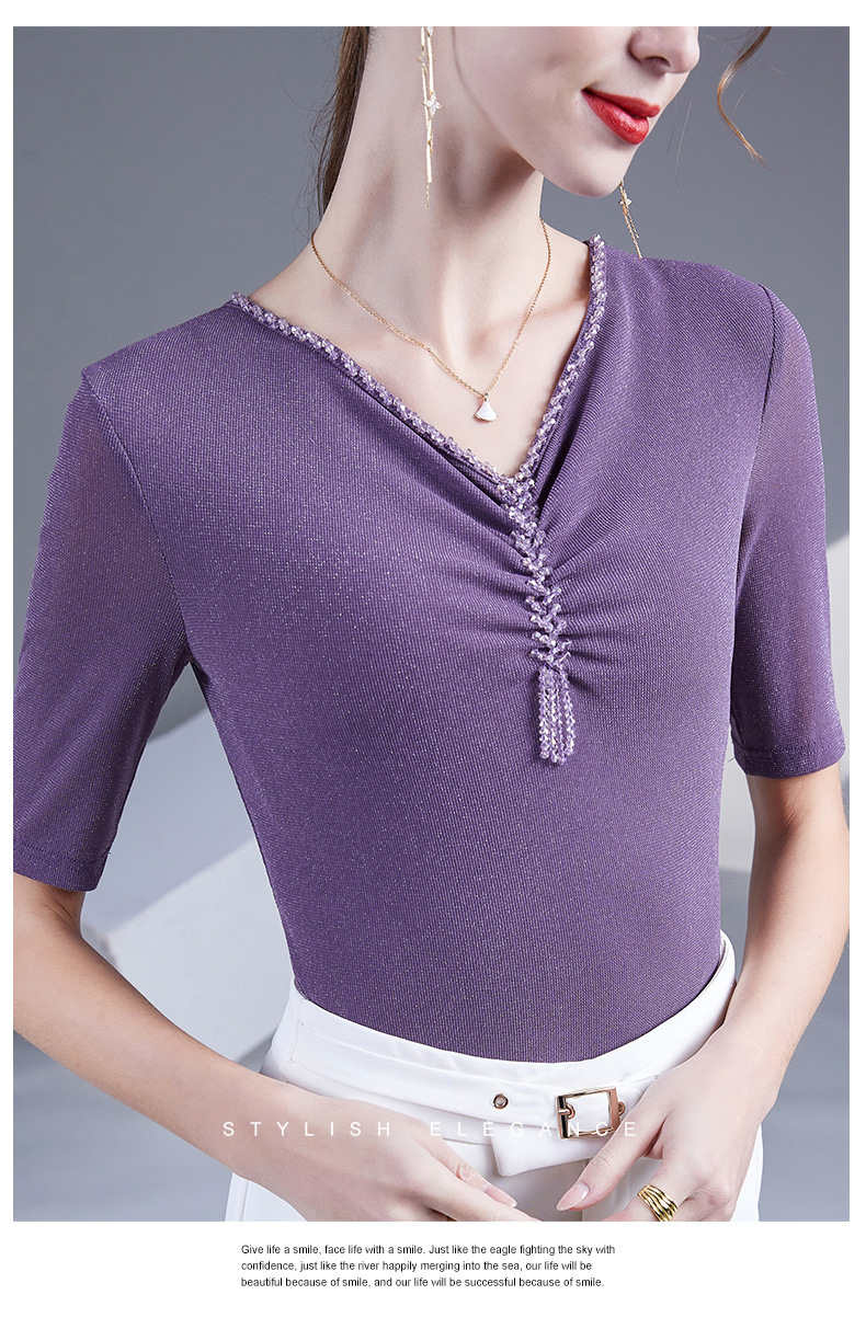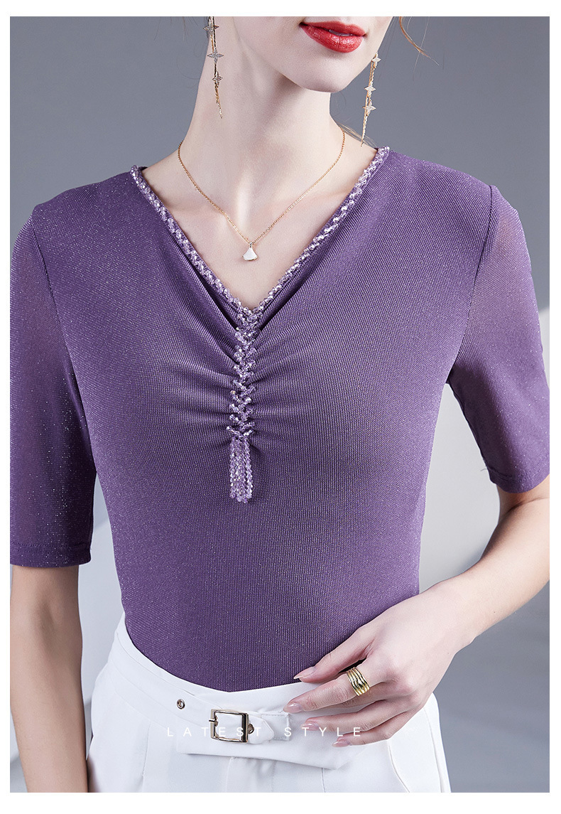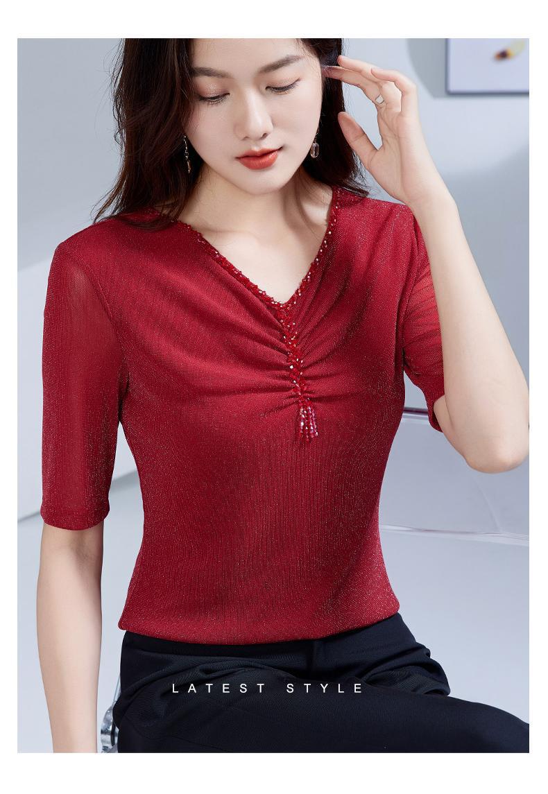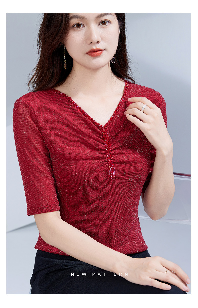 百媚生 中袖小衫V领钉珠网纱T恤女五分袖打底衫MC46893