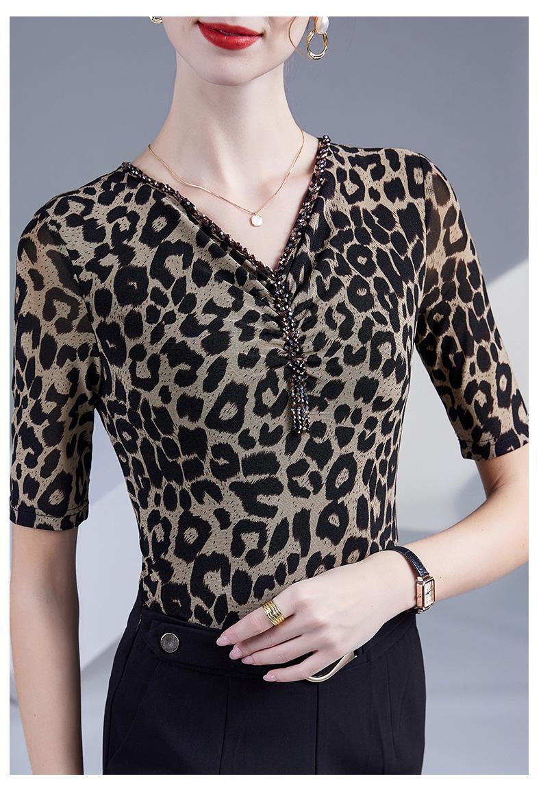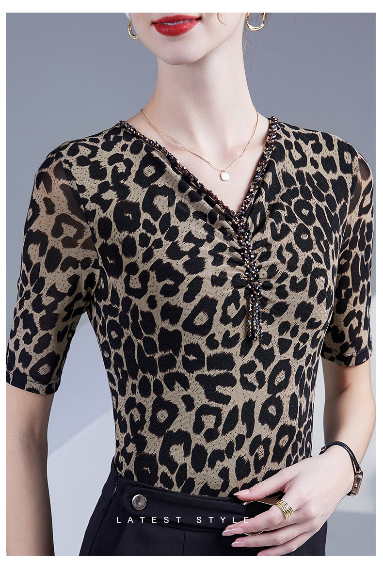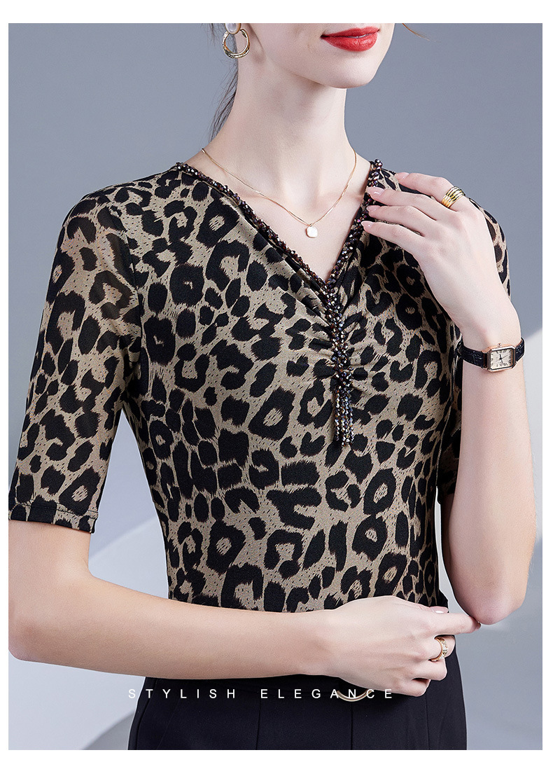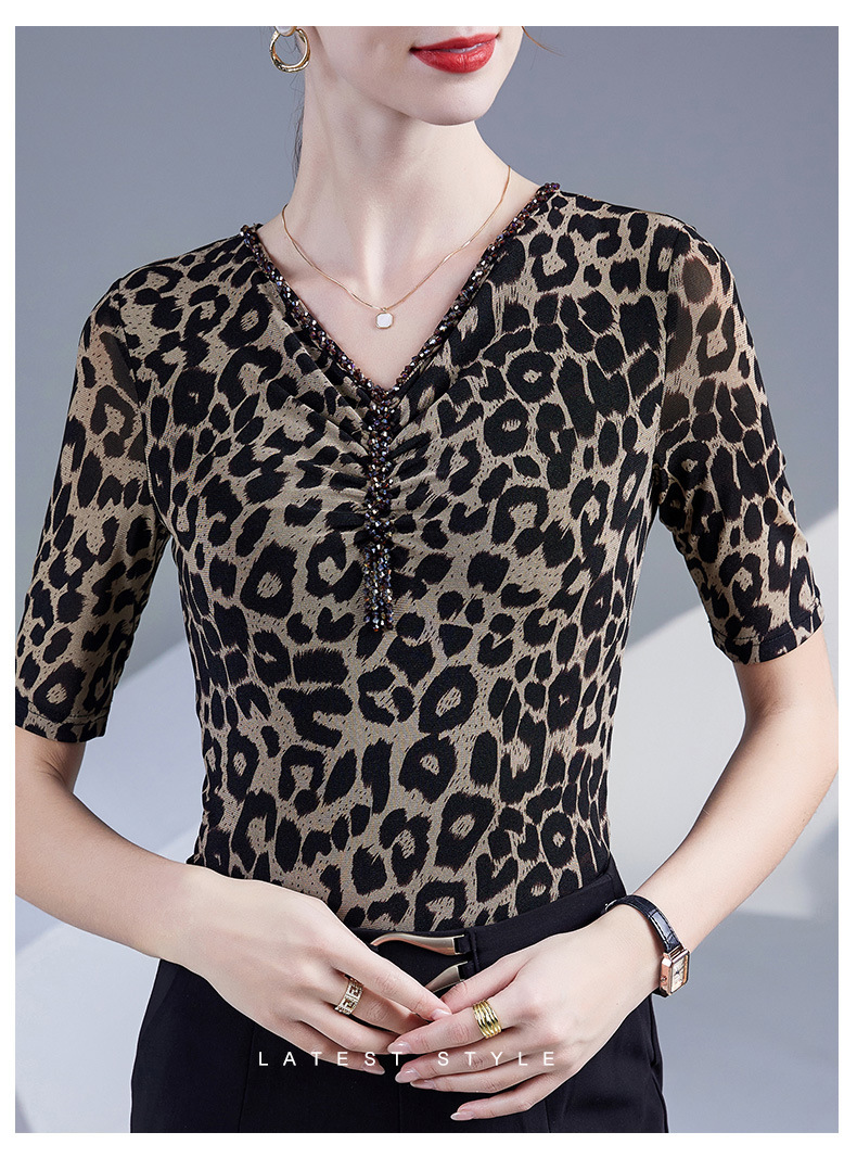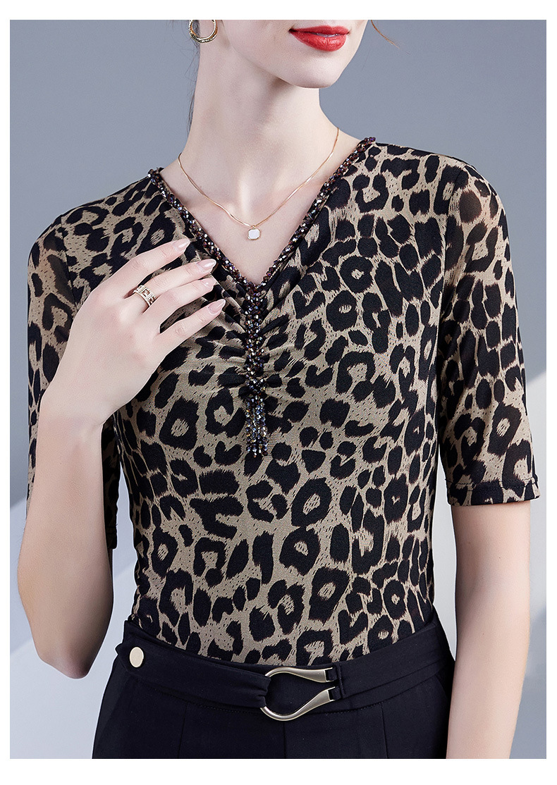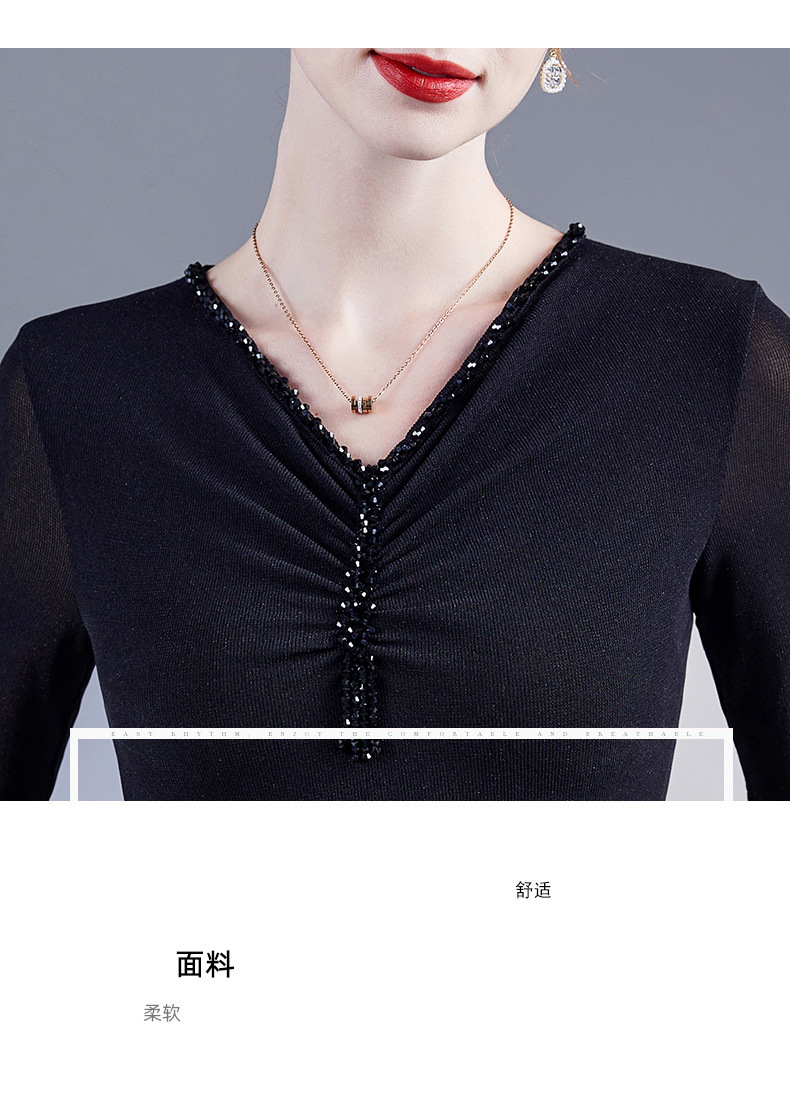 百媚生 中袖小衫V领钉珠网纱T恤女五分袖打底衫MC46893