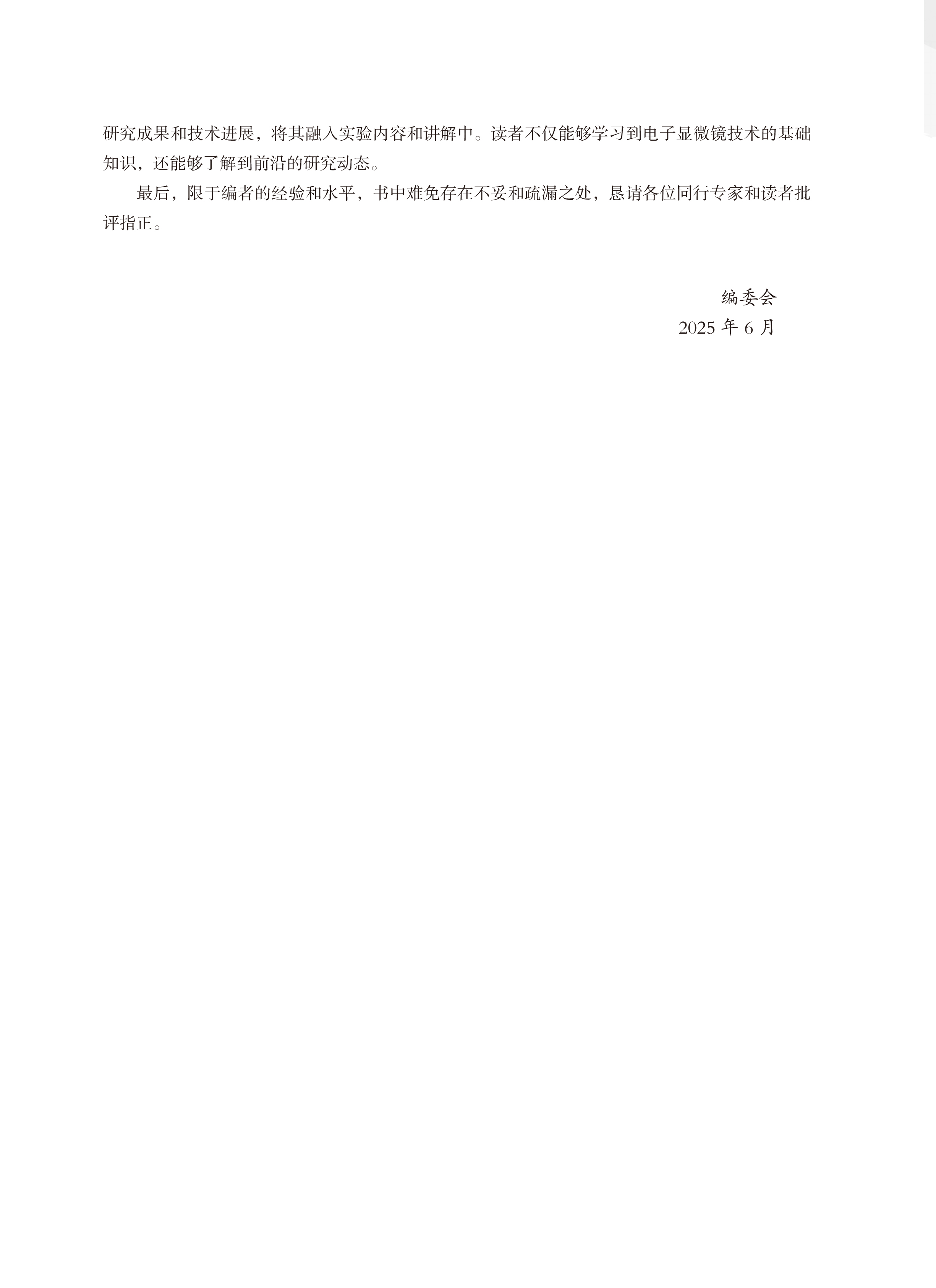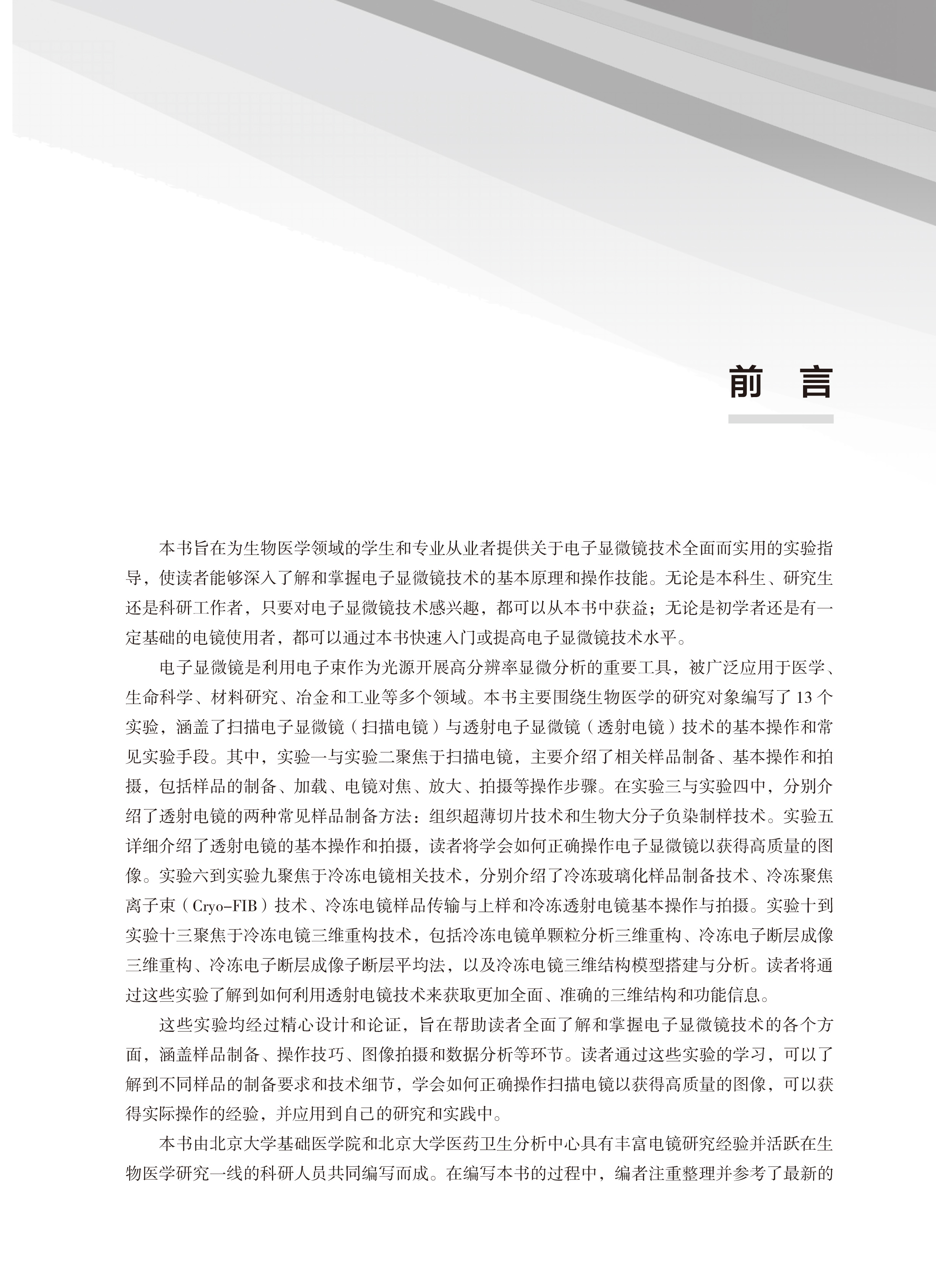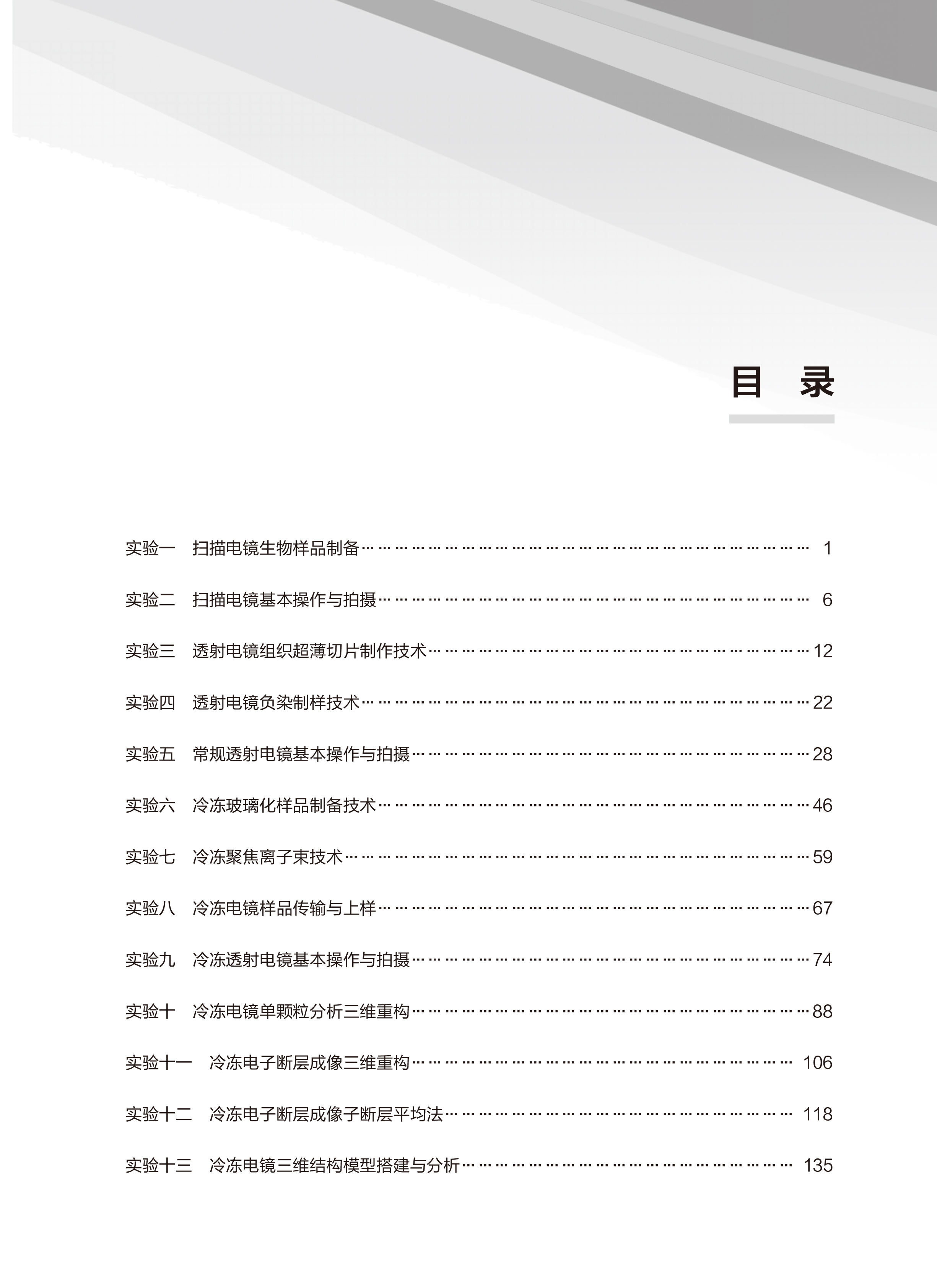 本教材旨在为生物医学领域的学生和专业从业者提供关于电子显微镜技术全面而实用的实验指导,使读者能够深入了解和掌握电子显微镜技术的基本原理和操作技能。包含13个实验,涵盖了扫描电子显微镜与透射电子显微镜技术的基本操作和常见实验手段。这些实验均经过精心设计和论证,旨在帮助读者全面了解和掌握电子显微镜技术的各个方面,涵盖样品制备、操作技巧、图像拍摄和数据分析等环节。通过这些实验的学习,可以了解到不同样品的制备要求和技术细节,学会如何正确操作扫描电镜以获得高质量的图像。