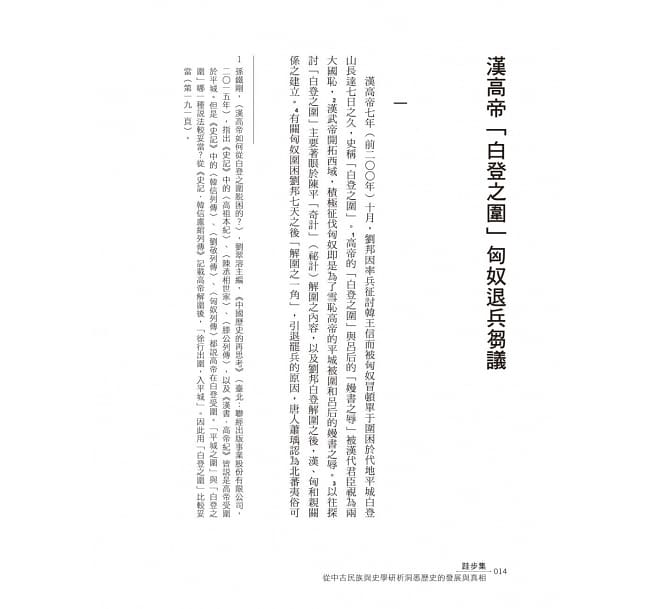 作者以十篇論文,分別探討「白登之圍」匈奴退兵芻議、漢初「嫚書事件」、北周武德皇后突厥族阿史那氏研究、東突厥啟民可汗阿史那染干生平事蹟、唐太宗「跪而吮上乳」事件、以及史著《大唐創業起居注》、《資治通鑑目錄》、《唐鑑》等相關研究。