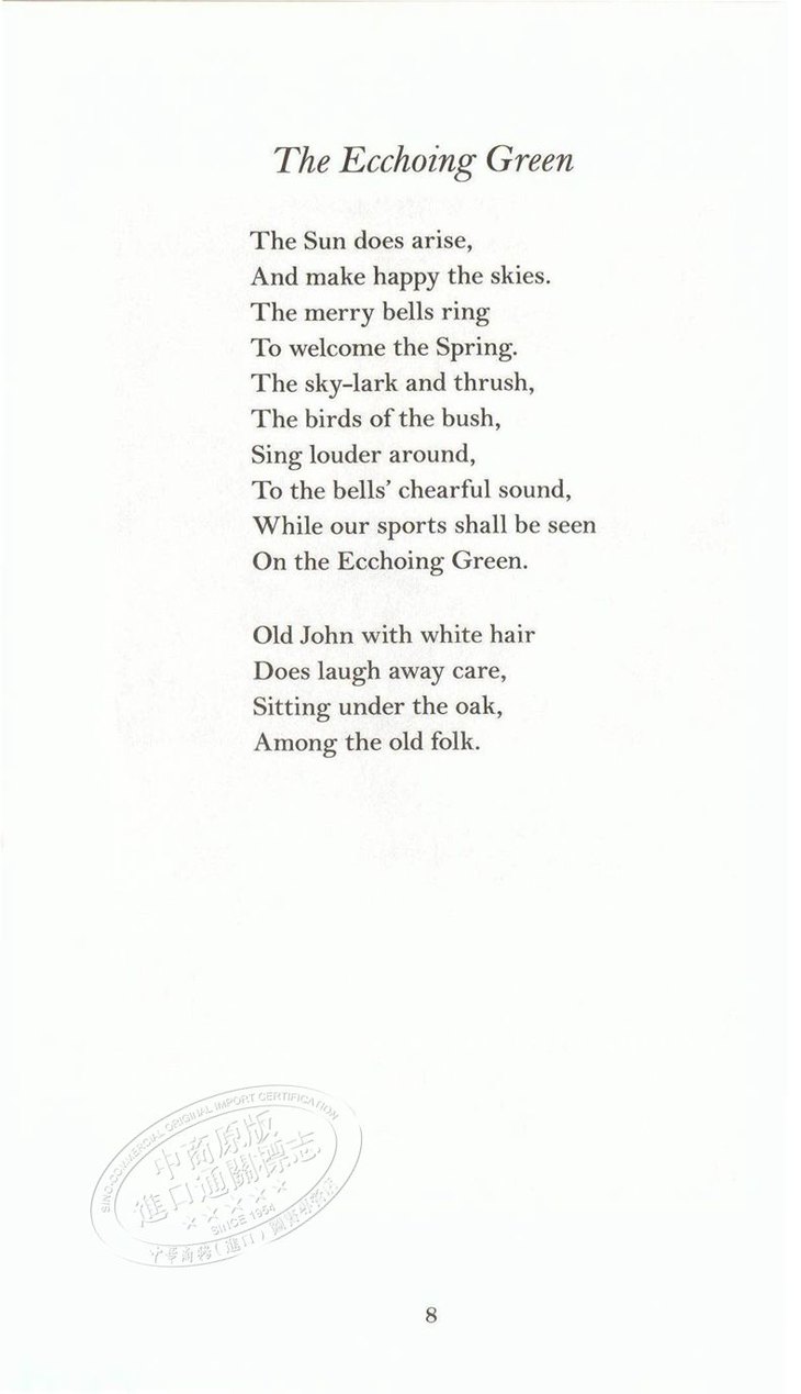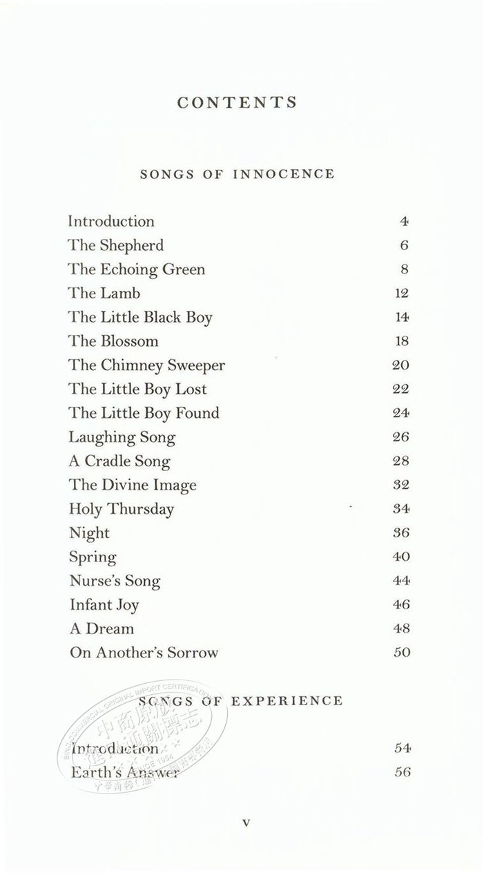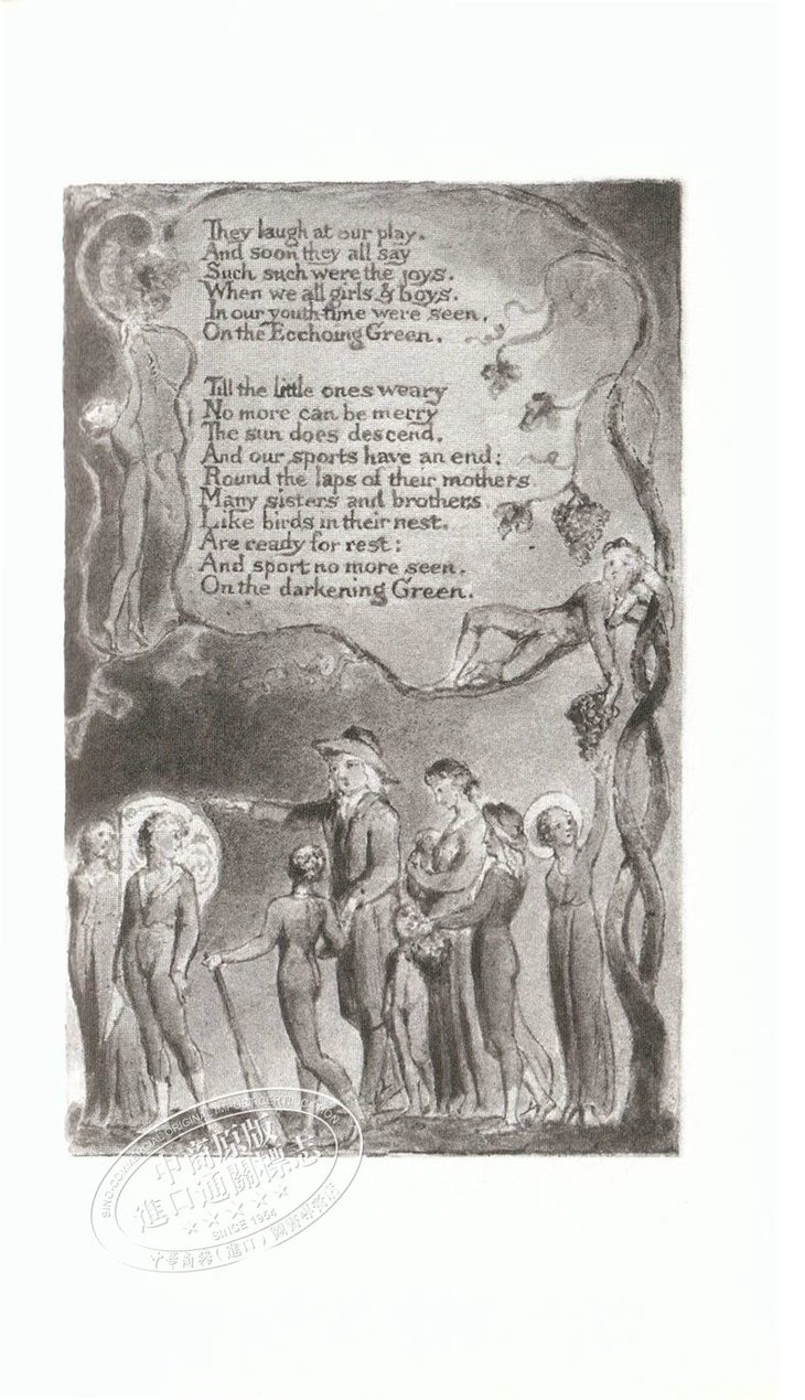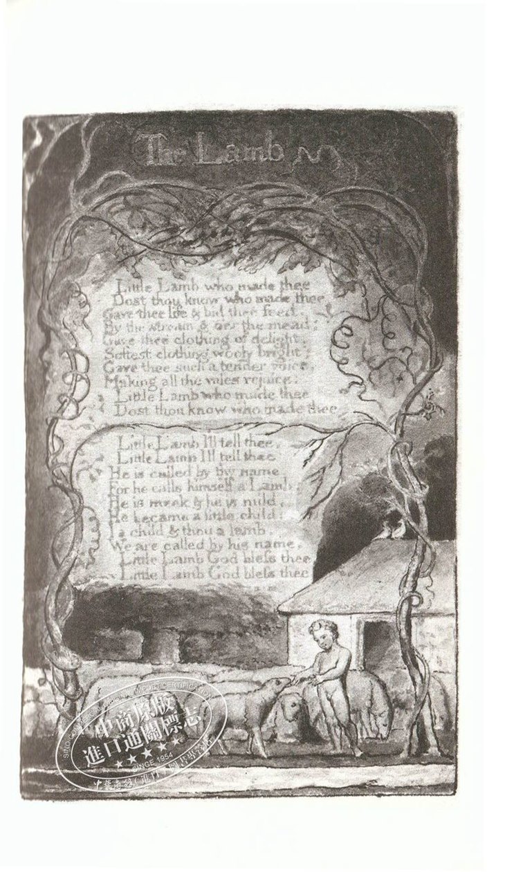《天真与经验之歌》是英国十八世纪的天才诗人威廉·布莱克的诗集,收录了他大部分的重要诗篇。诗集按各诗所反映的内容、格调和创作特点划分为“天真之歌”与“经验之歌”两部分,反映诗人的思想和创作从孩子般的天真状态走向成人经验的苦涩历程。“天真”阶段的诗清新、活泼、童趣盎然。“经验”阶段的诗笔锋一转,风格迥异,辛辣、苦涩,斥责社会的不公。充满童真的《欢笑的歌》、凝重辛酸的《扫烟囱的孩子》、隐含象征意义的《老虎》都是为世人所传诵的名篇。布莱克本人还是个版画家,他采用诗配画的形式将丰富的内容与绚丽的画面巧妙地结合起来。