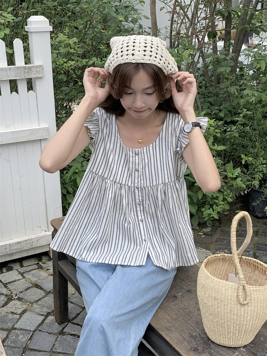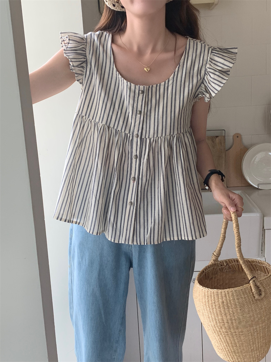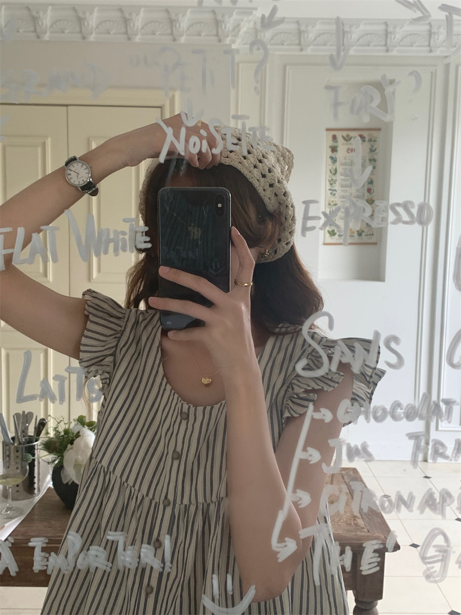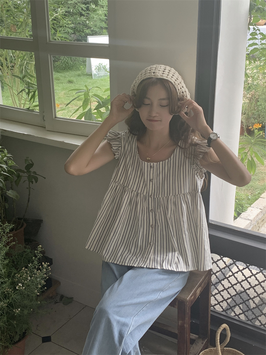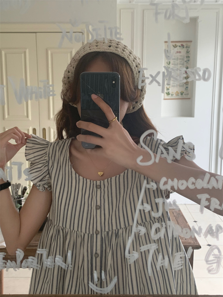 黛唯梵【新款上架,木耳边小飞袖】方领竖条纹,童趣甜美,倍添少女心。女神们,特别推荐给爱穿衣的你们!