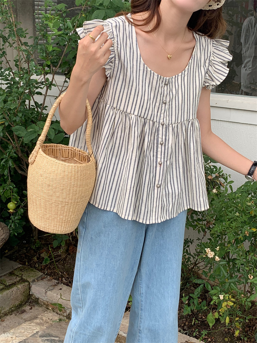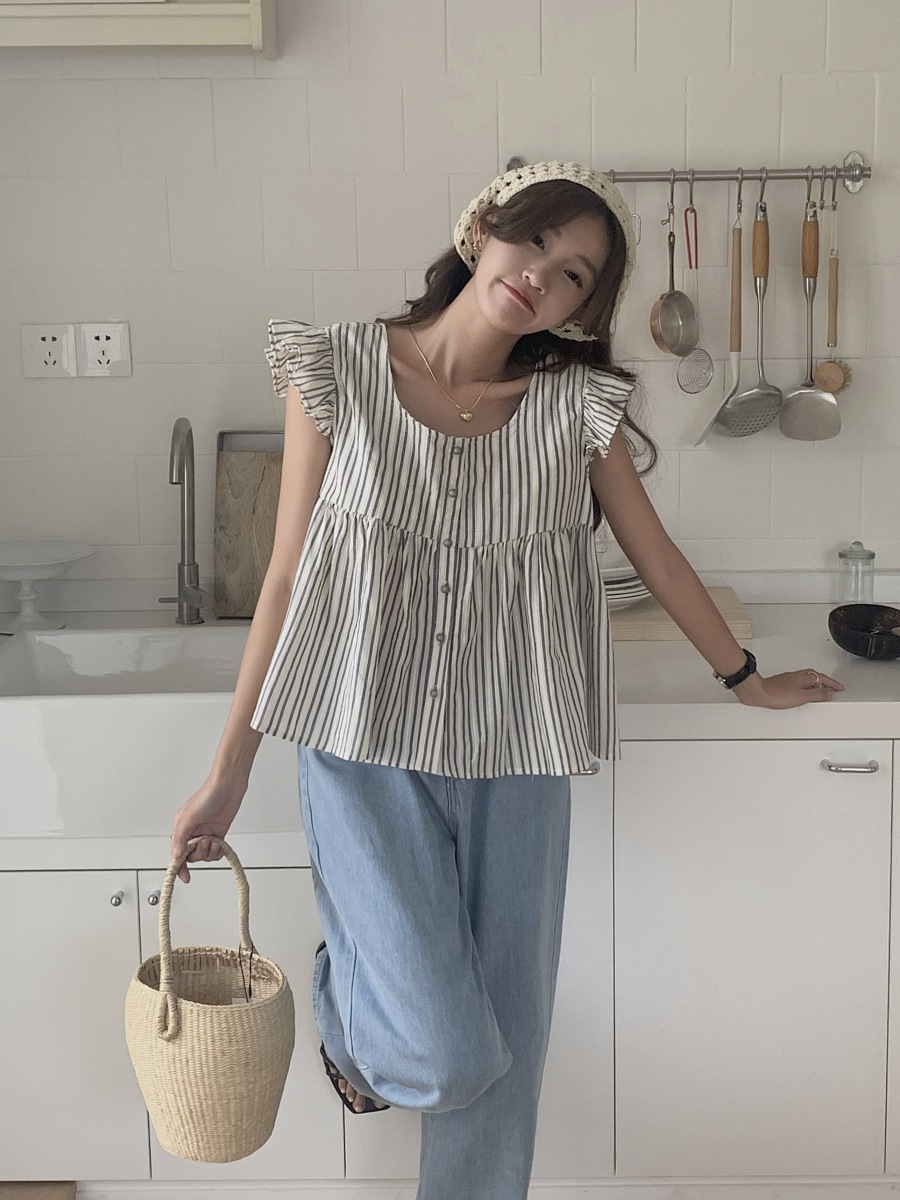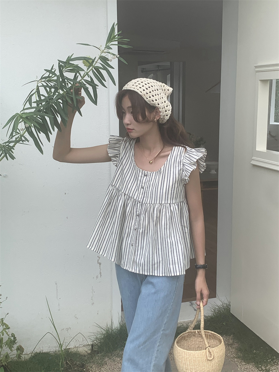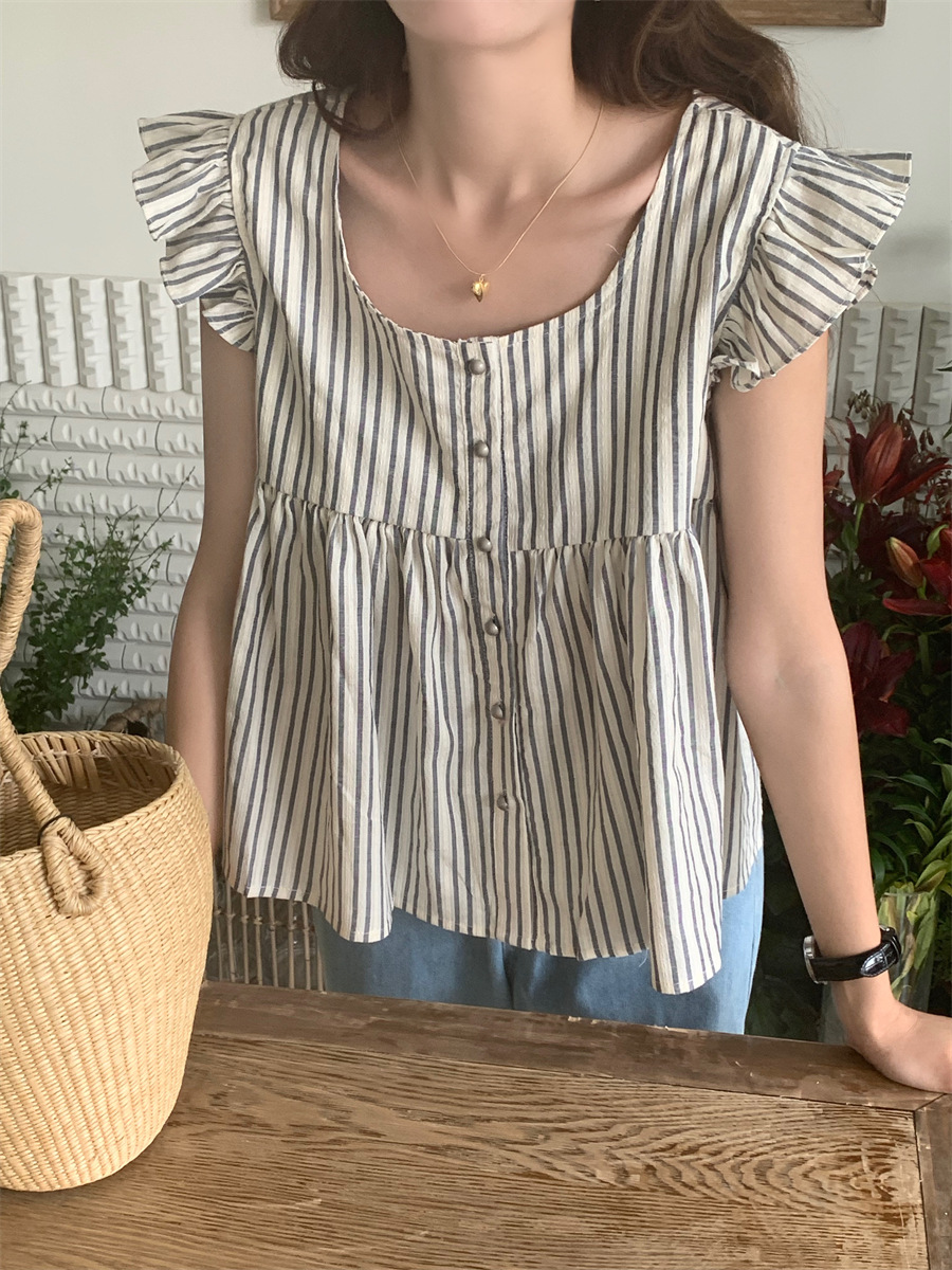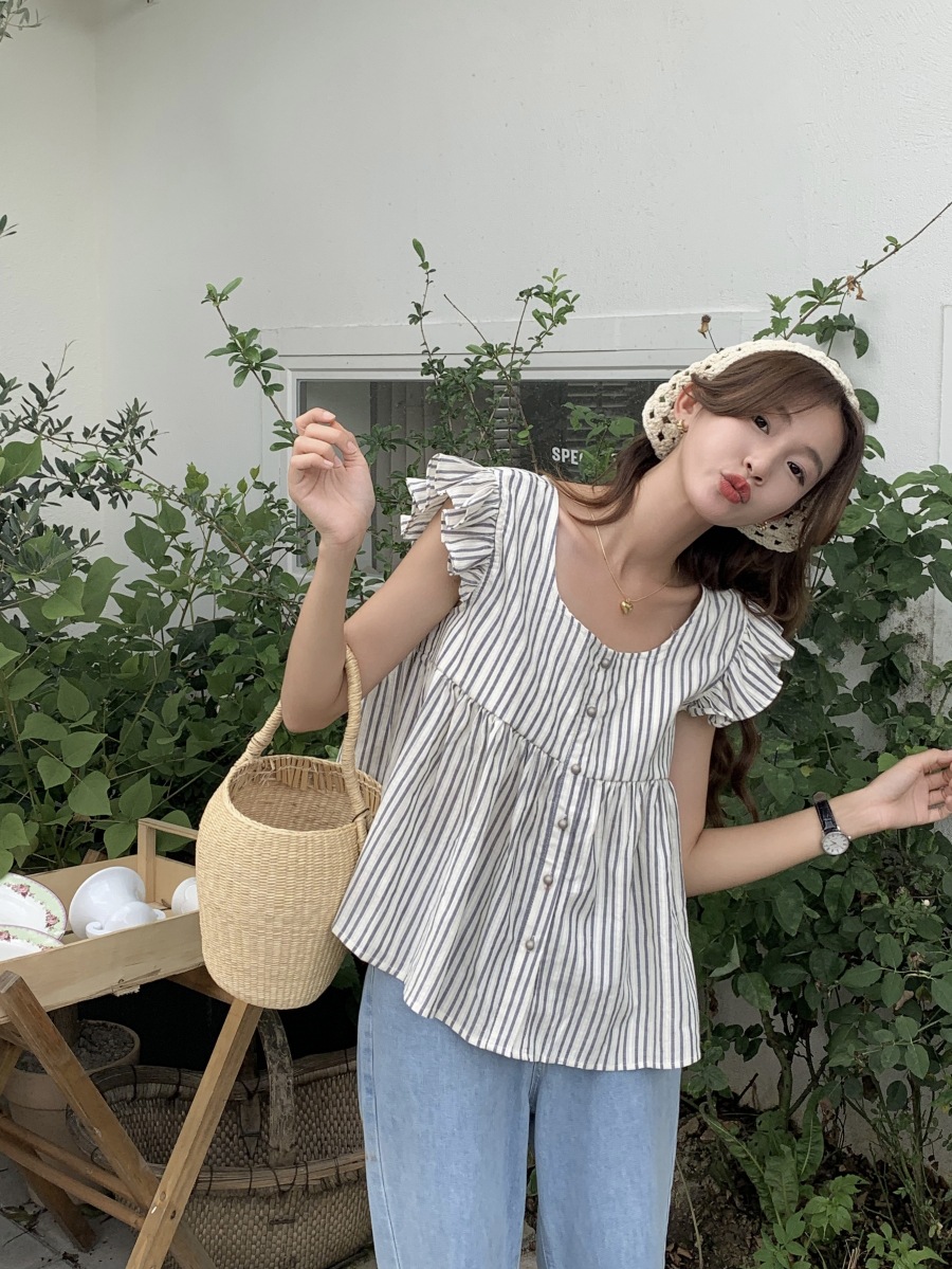 黛唯梵【新款上架,木耳边小飞袖】方领竖条纹,童趣甜美,倍添少女心。女神们,特别推荐给爱穿衣的你们!