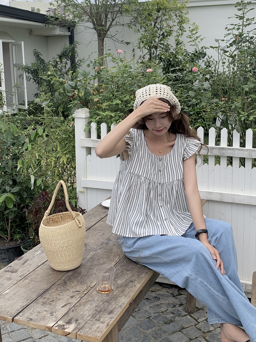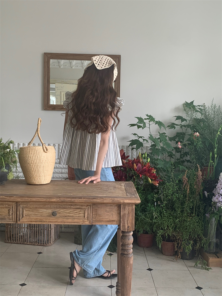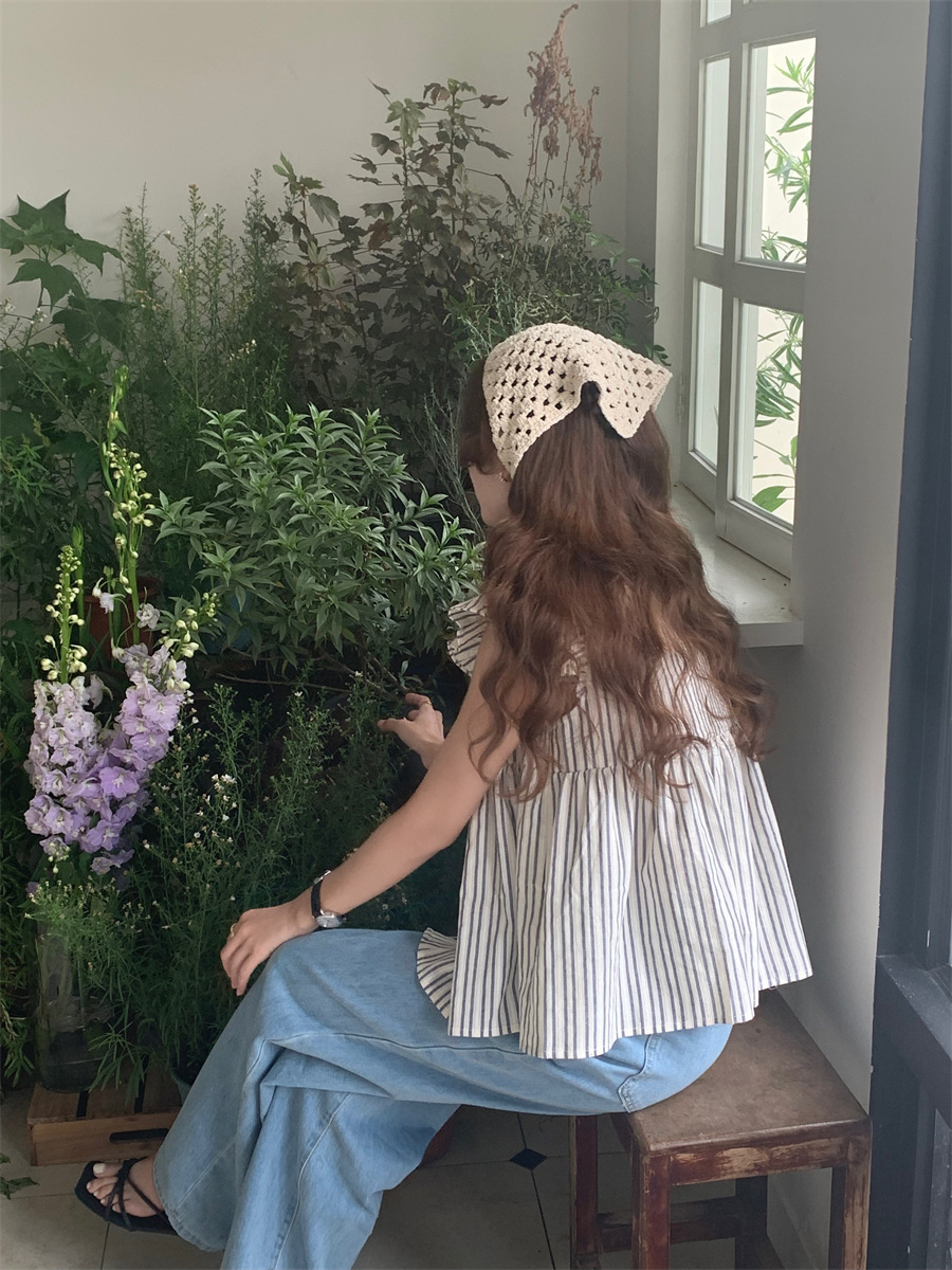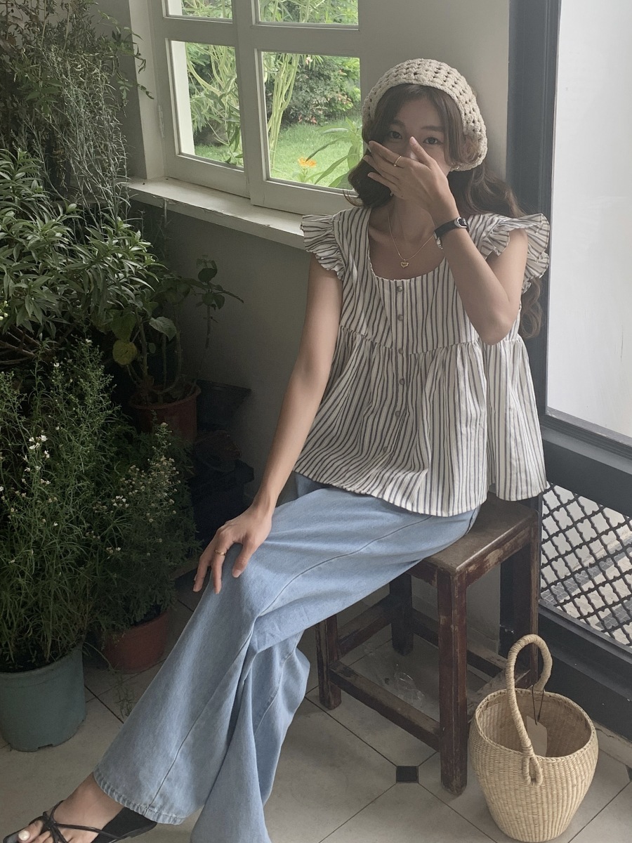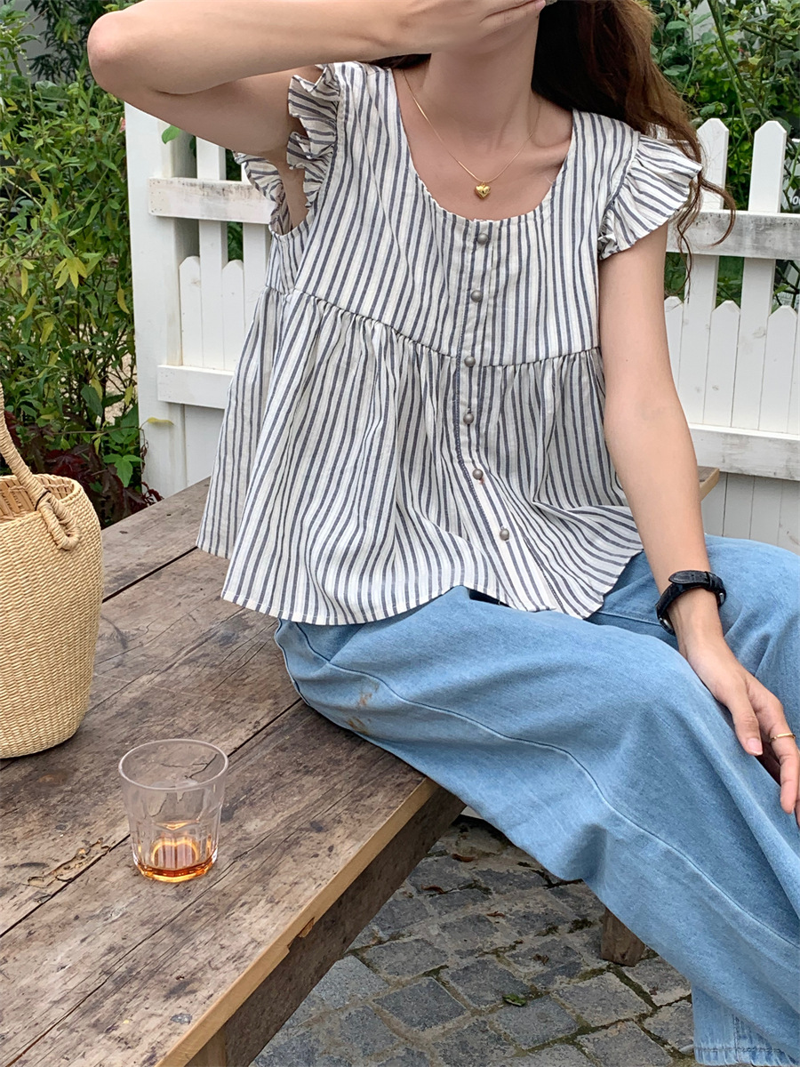 黛唯梵【新款上架,木耳边小飞袖】方领竖条纹,童趣甜美,倍添少女心。女神们,特别推荐给爱穿衣的你们!