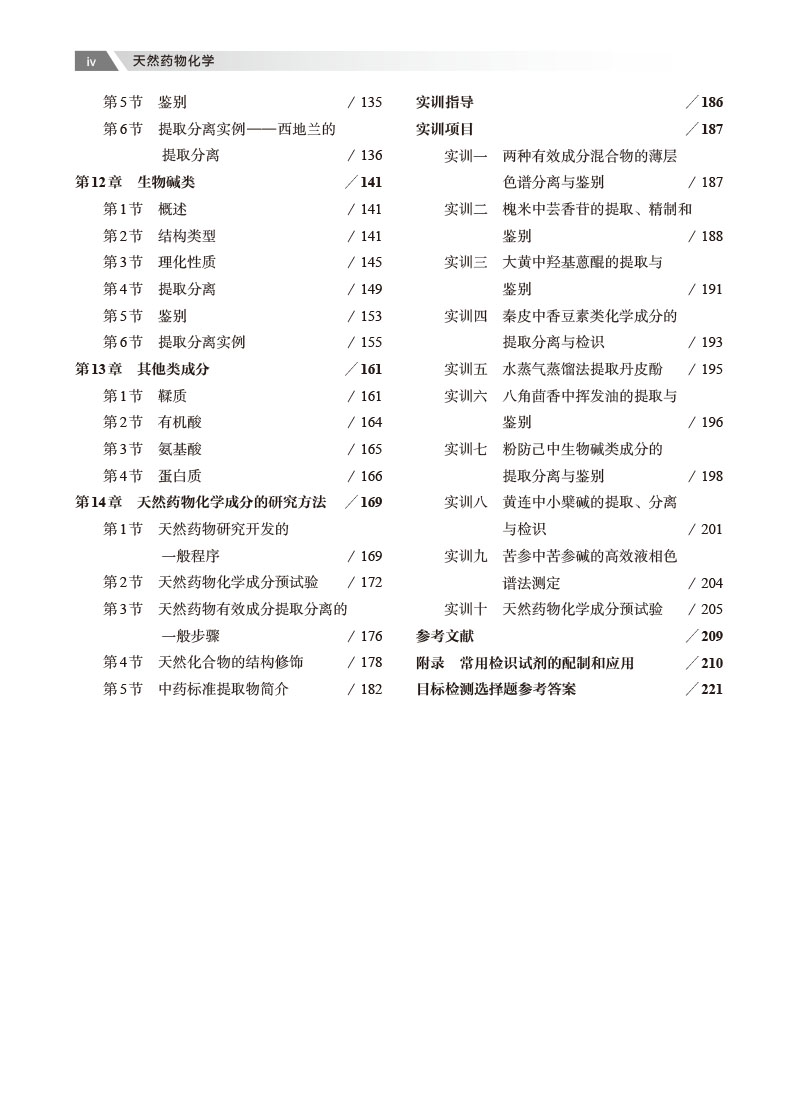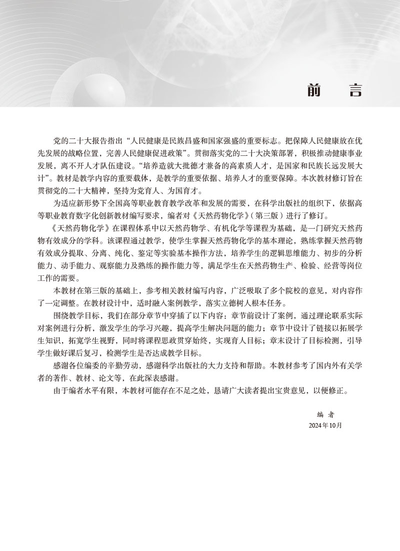 本教材参考众多类似的教材,同时考虑到目前各省专科层次学情特点,又考虑到目前专升本和专业硕士学位考试知识的要求,对教材内容进行整合,把原有各章节的四大光谱内容调慗第四章节进行总体介绍,后面在蒽醌和黄酮章节作为典型代表,将紫外内容进行阐述,能够准确定位所有学生实际,又有针对性的,教材难度适中,易教易学,在习题环节,选用历年来的考试真题进行融合,真正发挥好课证融能作用。
