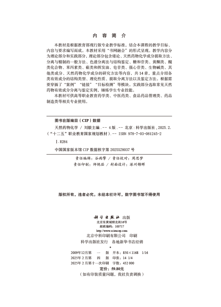 天然药物化学 第4四版 刘毅 主编 供高等职业教育药学类 中医药类 食品药品管理类 药品 制造类等相关专业使用 科学出版社