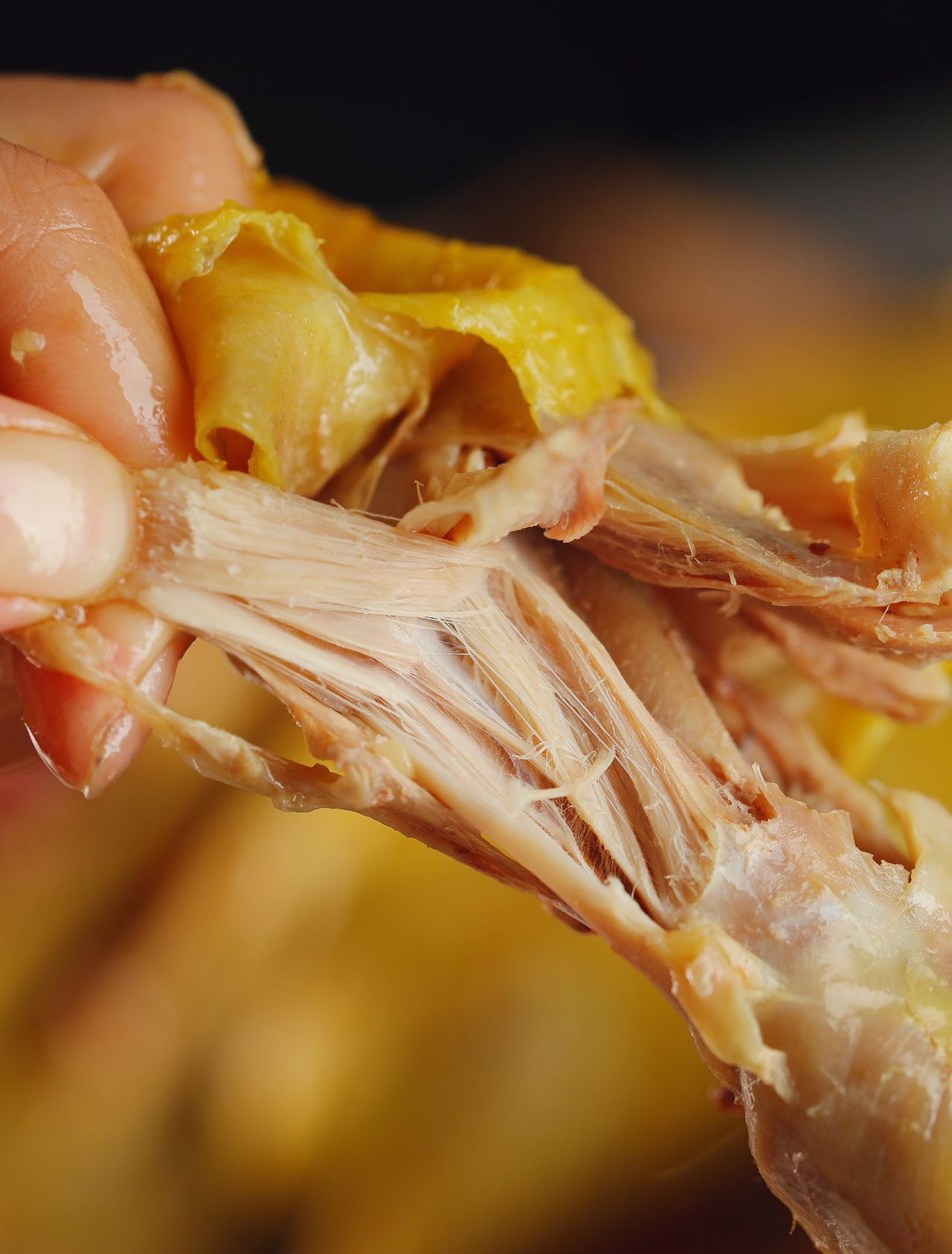 1.选用大于500天老母鸡为原料,肉质紧致,区别于“速成鸡”的软烂无口感;