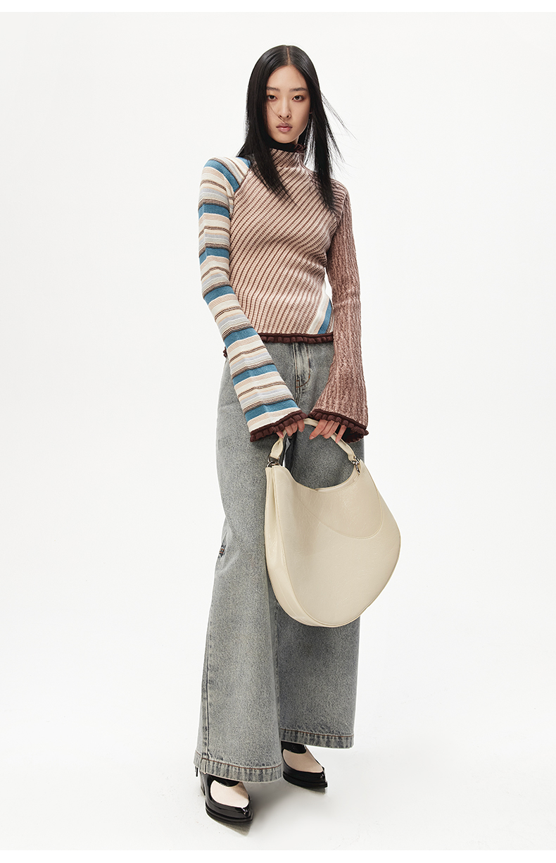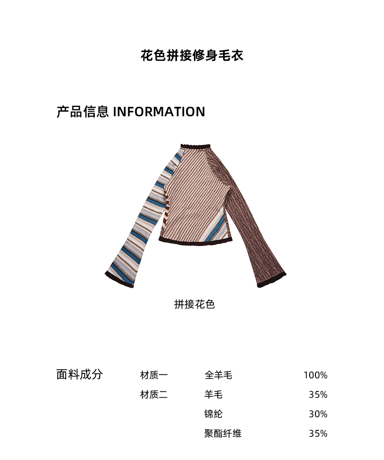 lost in echo设计师品牌时尚修身独特花色拼接荷叶边修身高领毛衣