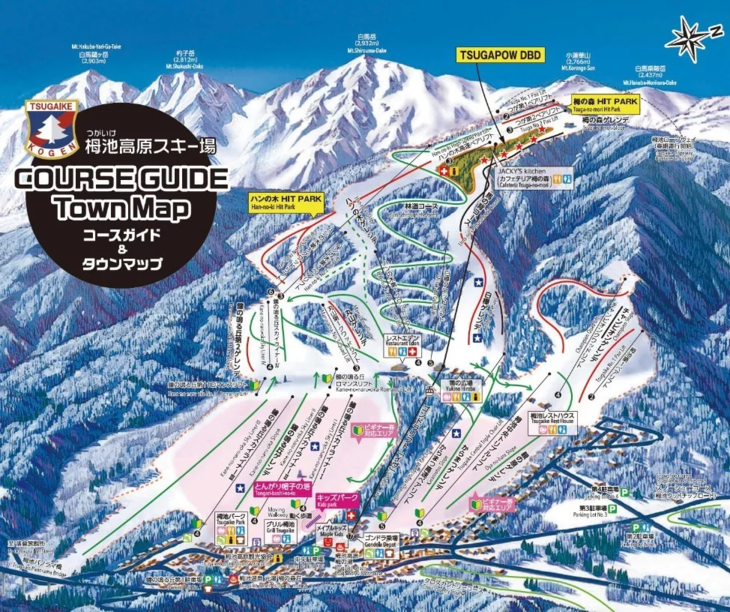 栂池高原滑雪场拥有日本最多的缓坡面,长和宽都能达到1公里的初级道非常适合初学者练习,滑雪高手可以体验山顶直接下来的黑道,春季举办的直升机滑雪在栂池也相当有名可以一气飞到海拔2200米高处,栂池高原滑雪场落差880米,共有11条滑道。初级滑道40%,中级滑道40%,高级滑道20%最大坡度35度,最长雪道达6公里。缆车数量24条。