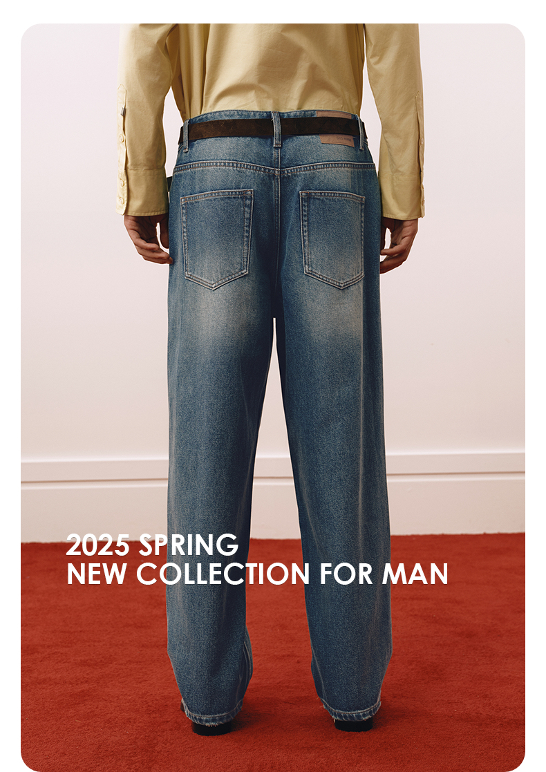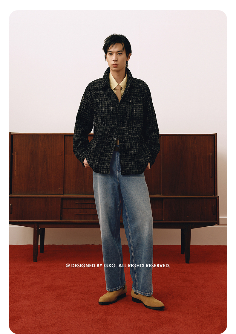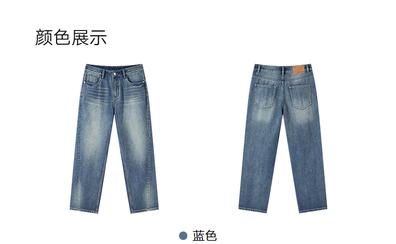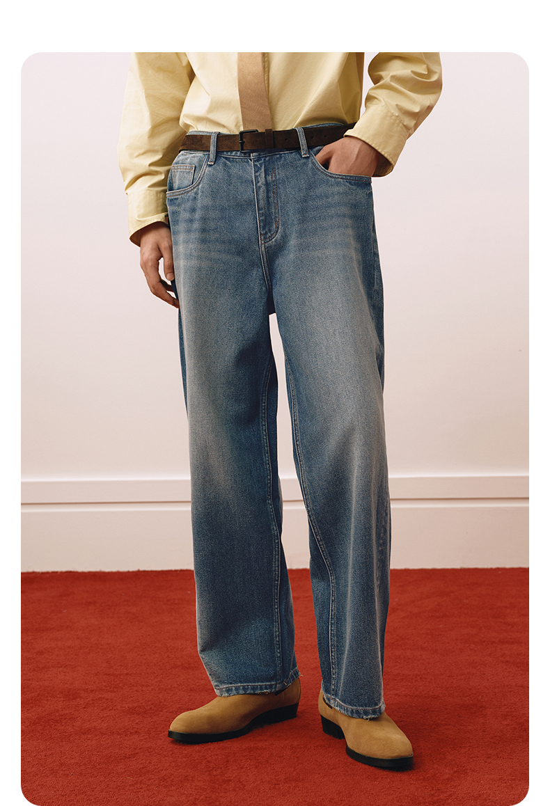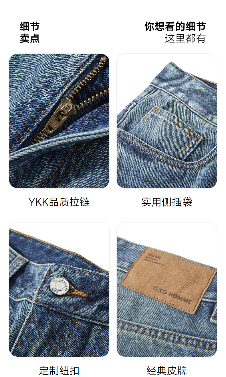 GXG男装 复古蓝直筒牛仔裤分割设计长裤宽松通勤裤 2025春季热卖