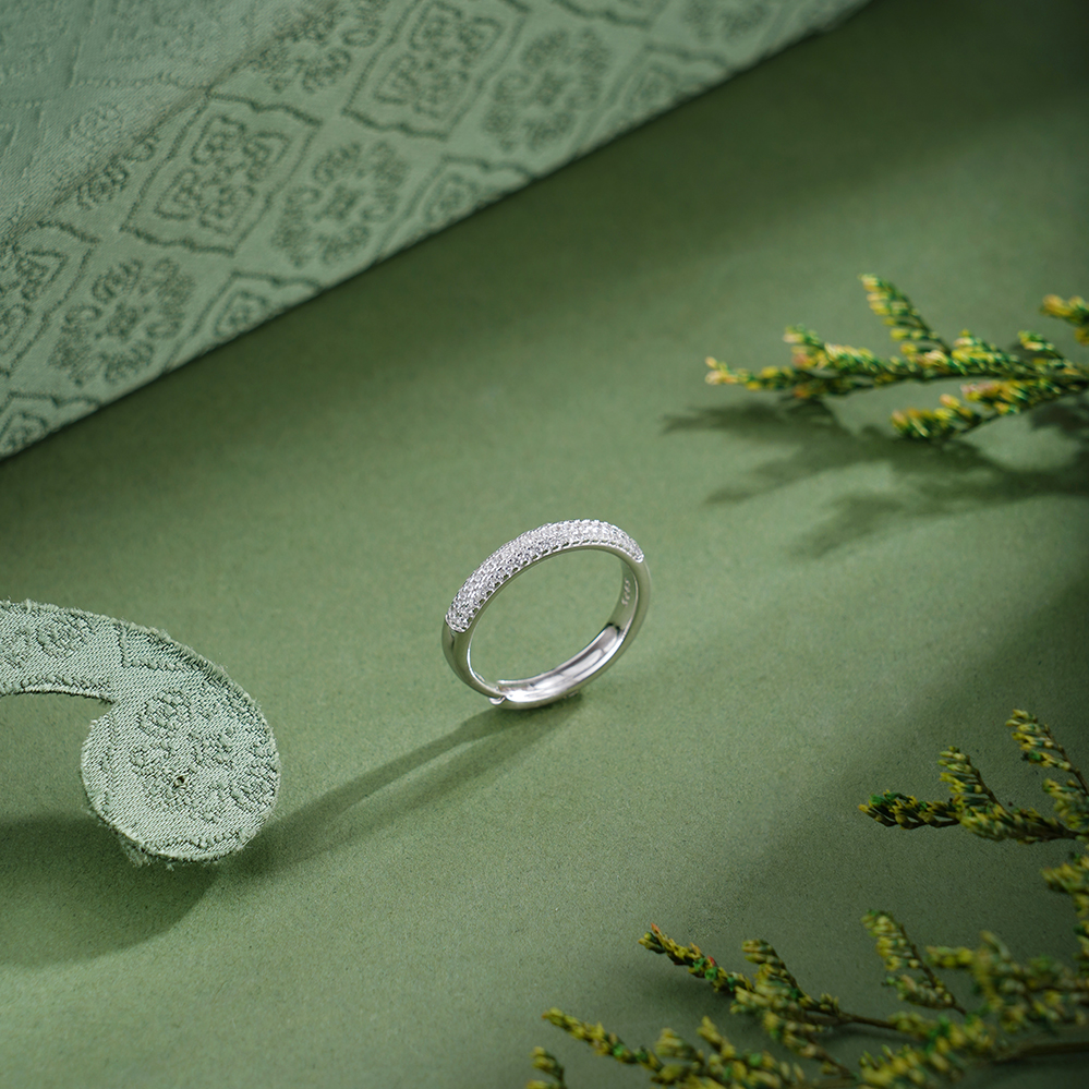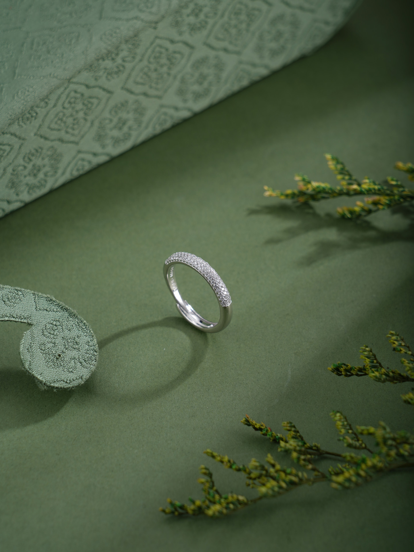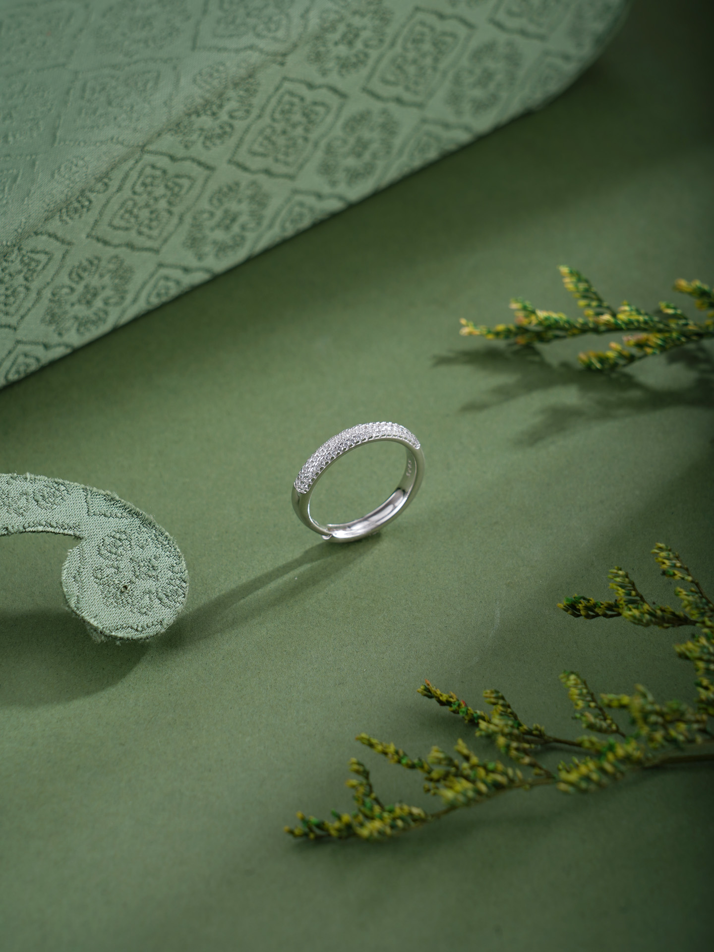 【寓意】:纯银戒指点缀细闪锆石,戒身流转间,璀璨与留白相映,寓意向光而行,生命璀璨如诗。