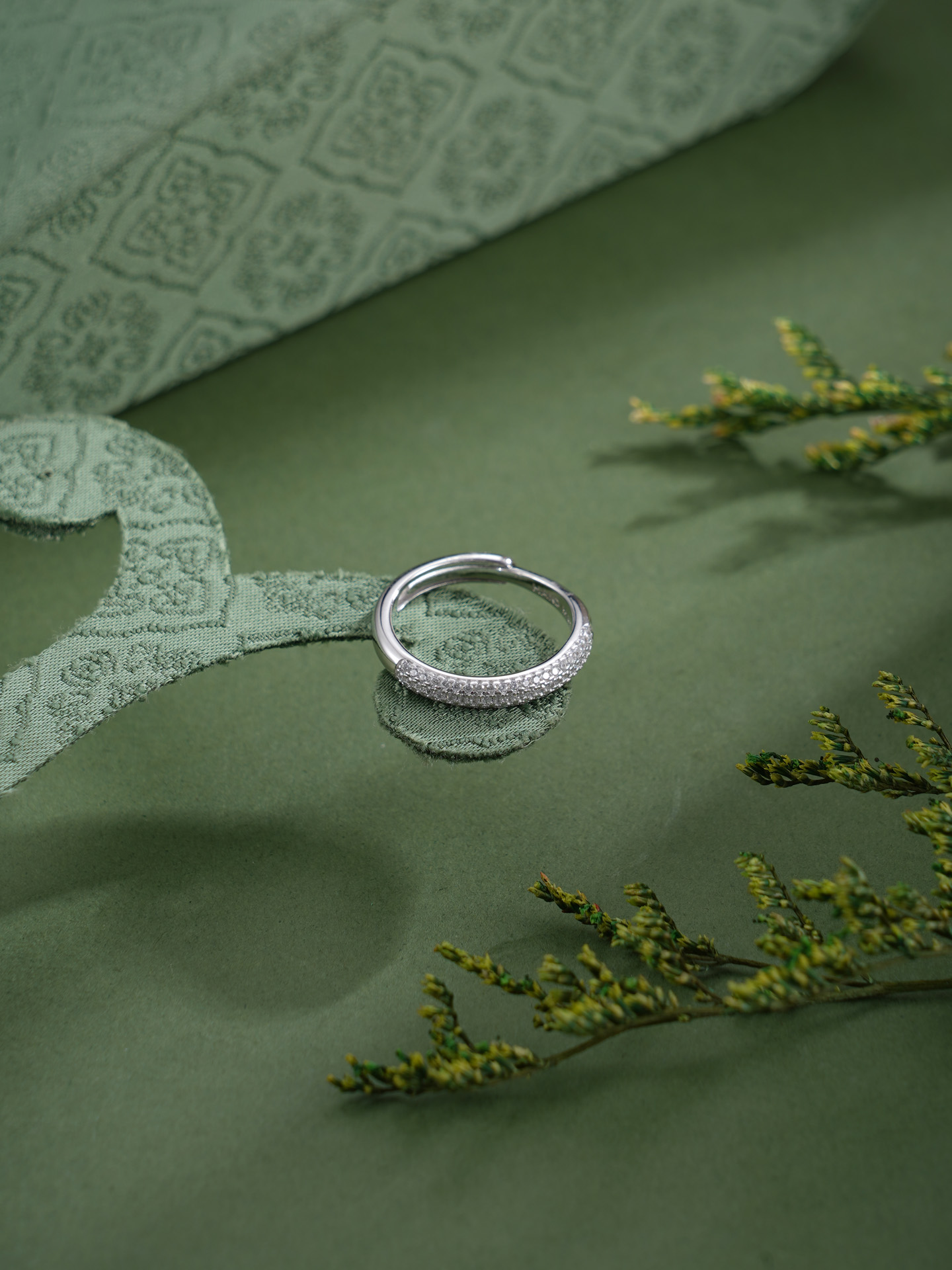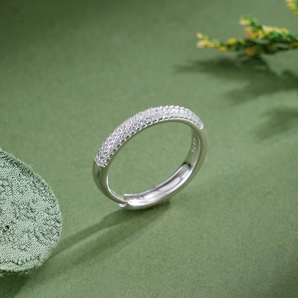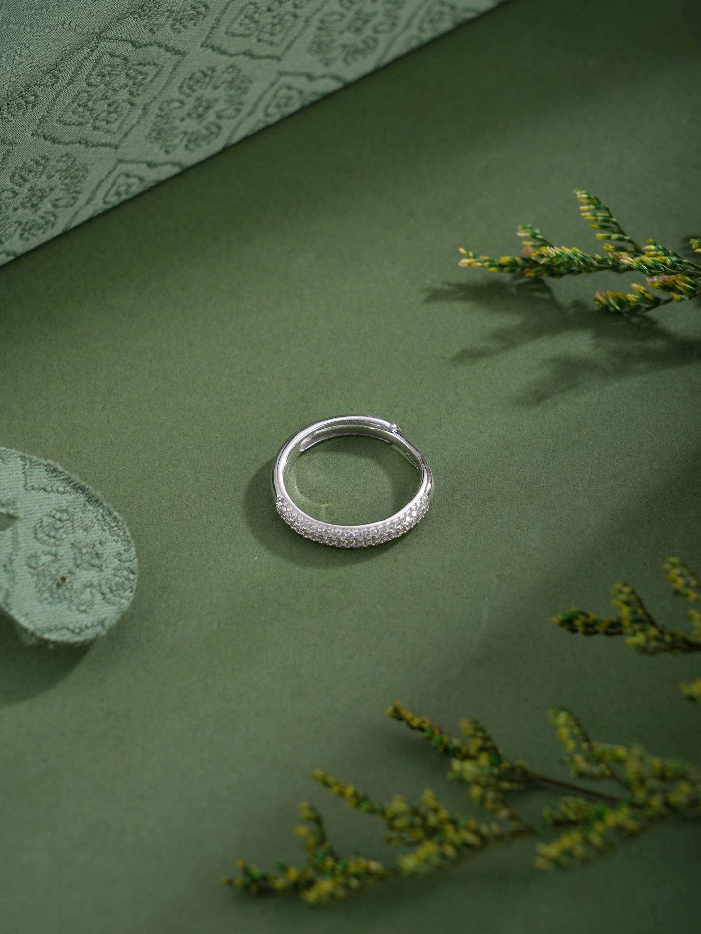 【寓意】:纯银戒指点缀细闪锆石,戒身流转间,璀璨与留白相映,寓意向光而行,生命璀璨如诗。