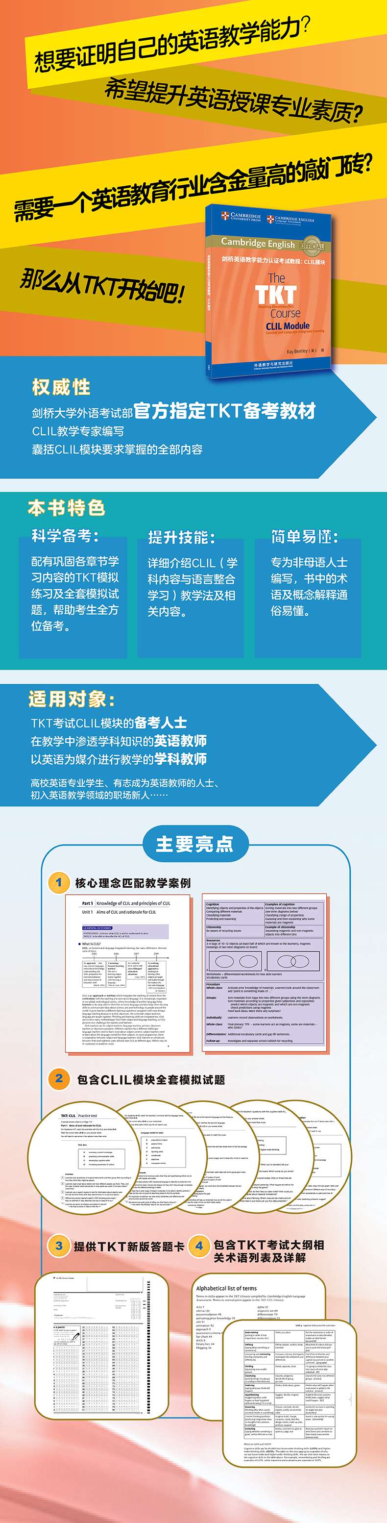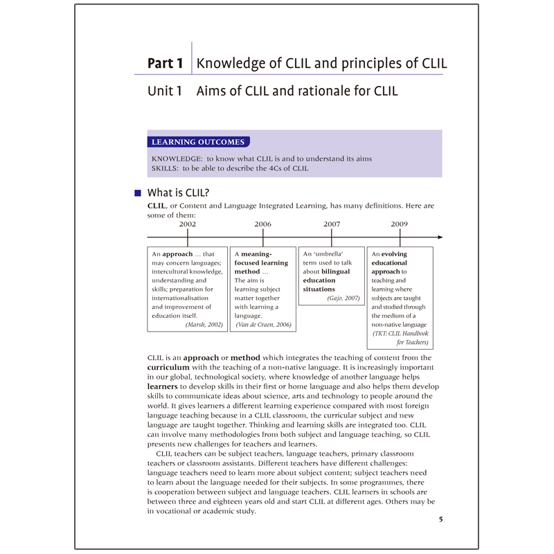以上两大部分各包含若干单元,囊括了TKT考试大纲针对CLIL模块所要求掌握的全部内容。