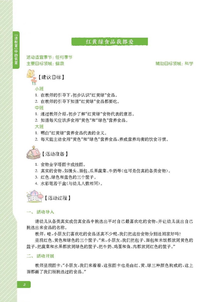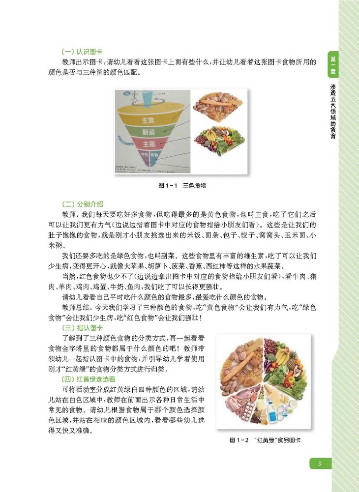 全书分为 “渗透五大领域的食育”“24节气中的食育”“舌尖上的中国之食育”三大部分,实施路径为通过幼儿园一日活动以及家庭中的亲子活动来进行。