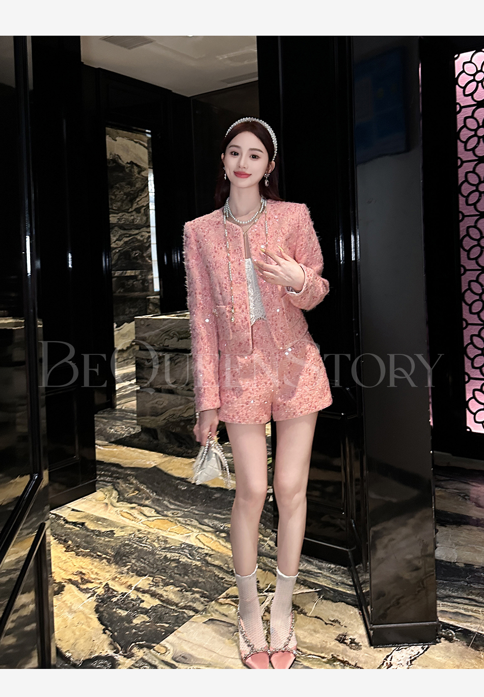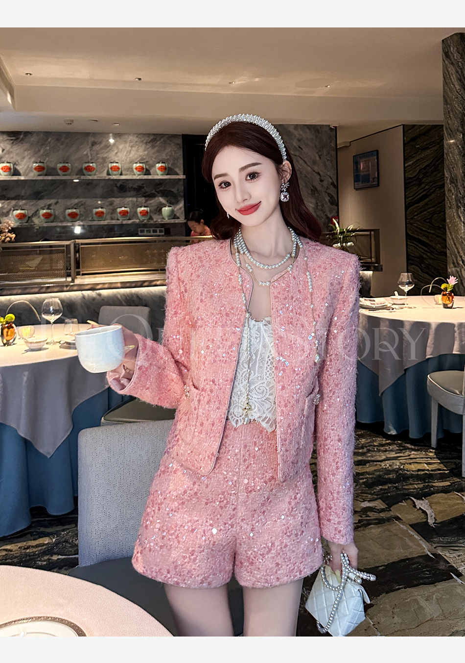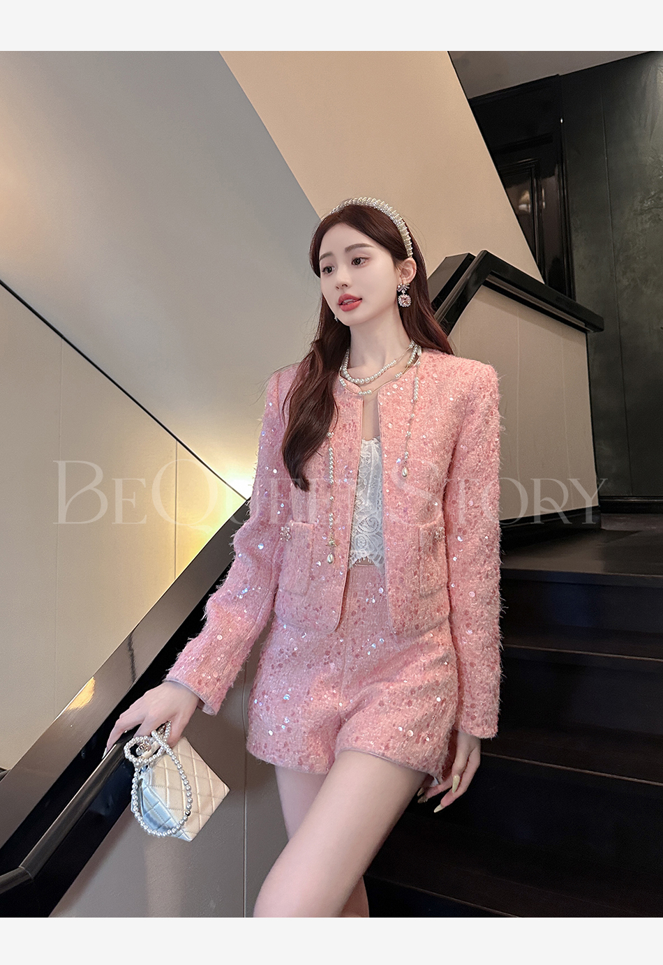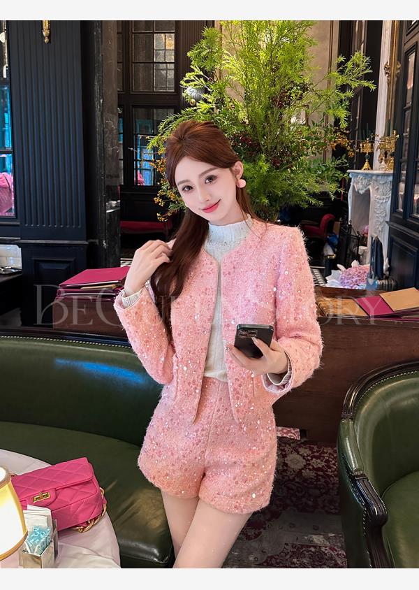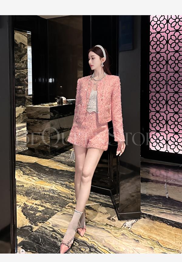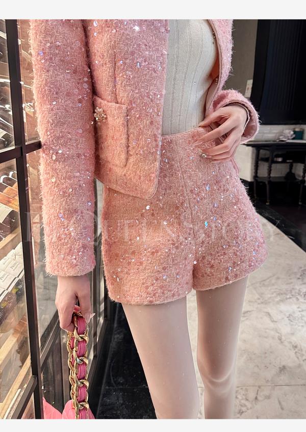 【国庆福利,不退不换】【珊瑚银河】轻奢法式时尚休闲亮片小香风外套&小A字短裤秋冬