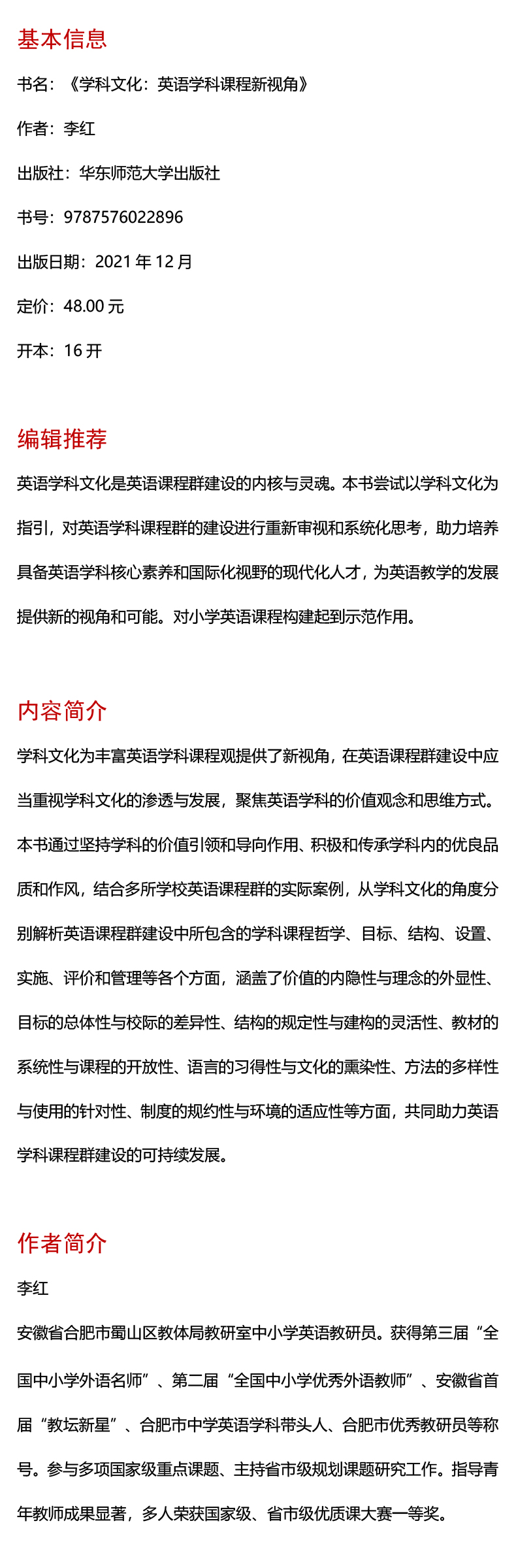 学科文化为丰富英语学科课程观提供了新视角,在英语课程群建设中应当重视学科文化的渗透与发展,聚焦英语学科的价值观念和思维方式。本书通过坚持学科的价值引领和导向作用、积极和传承学科内的优良品质和作风,结合多所学校英语课程群的实际案例,从学科文化的角度分别解析英语课程群建设中所包含的学科课程哲学、目标、结构、设置、实施、评价和管理等各个方面,涵盖了价值的内隐性与理念的外显性、目标的总体性与校际的差异性、结构的规定性与建构的灵活性、教材的系统性与课程的开放性、语言的习得性与文化的熏染性、方法的多样性与使用的针对性、制度的规约性与环境的适应性等方面,共同助力英语学科课程群建设的可持续发展。