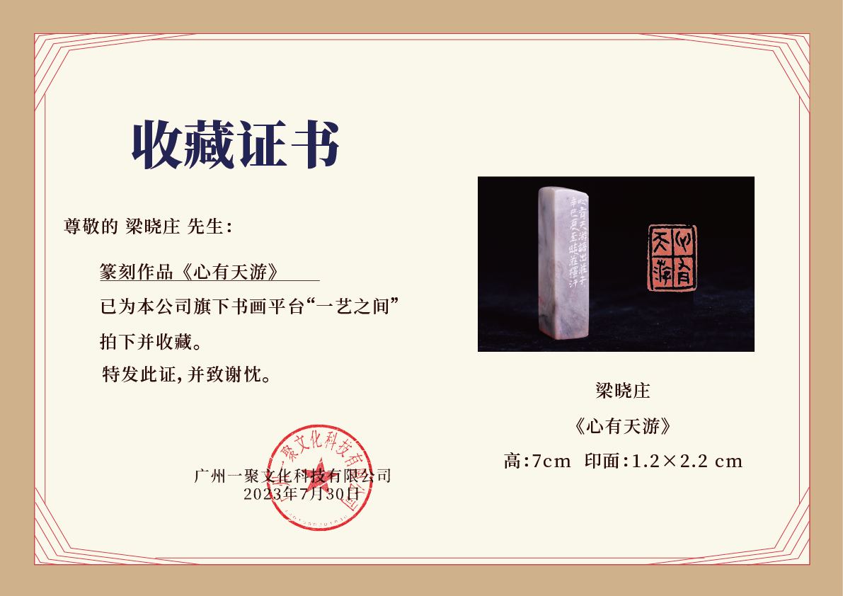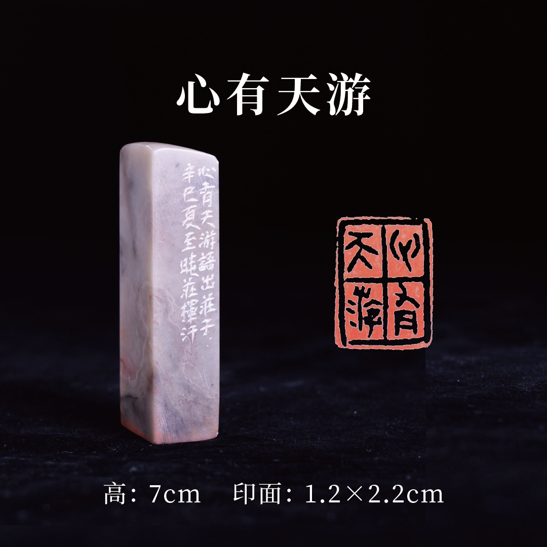 梁晓庄篆刻印章1.2x2.2x7CM丨心有天游(心有天游,语出庄子,辛巳[2001]夏至晓庄挥汗) 手工巴林石篆刻作品[原作编号:ZK008]