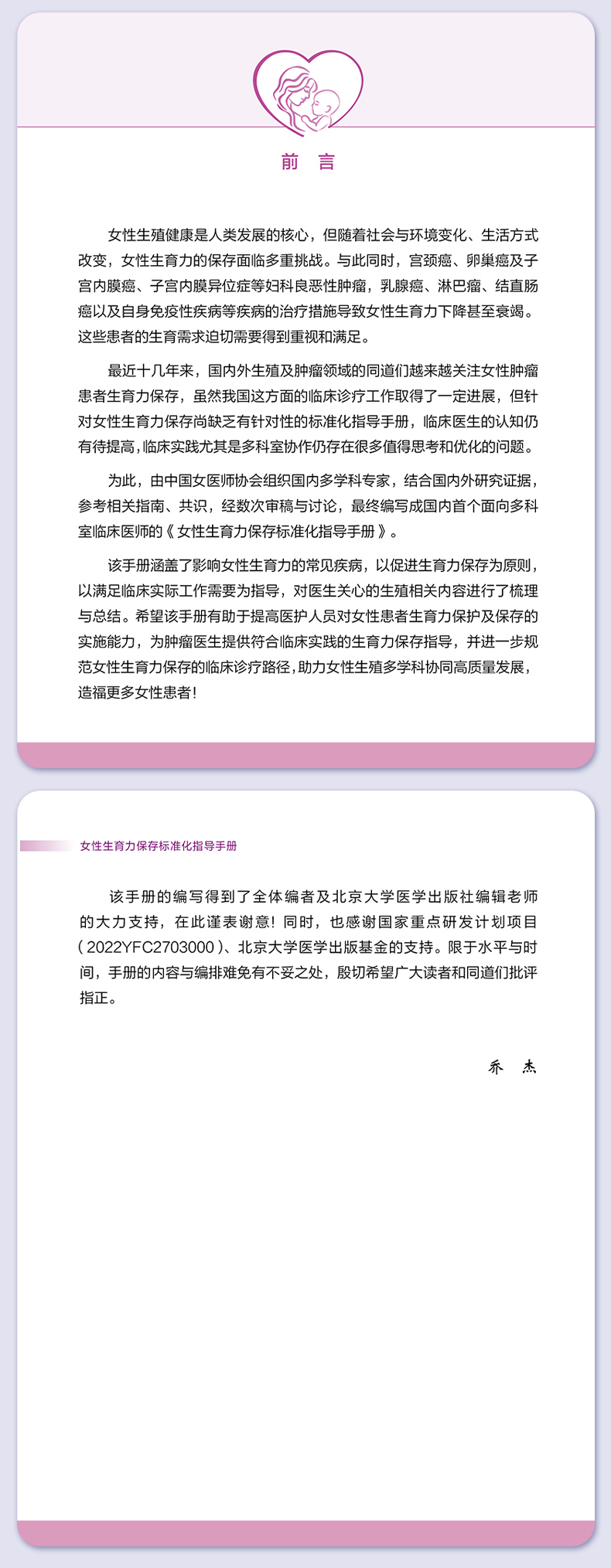 女性生殖健康是人类发展的核心,但随着社会与环境变化、生活方式改变,女性生育力的保存面临多重挑战。该手册涵盖了影响女性生育力的常见疾病,以促进生育力保存为原则,以满足临床实际工作需要为指导,对医生关心的生殖相关内容进行了梳理与总结。希望该手册有助于提高医护人员对女性患者生育力保护及保存的实施能力,为肿瘤医生提供符合临床实践的生育力保存指导,并进一步规范女性生育力保存的临床诊疗路径,助力女性生殖多学科协同高质量发展造福更多女性患者!