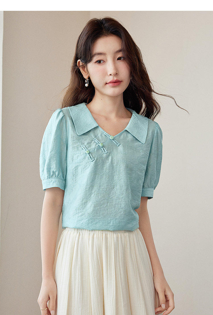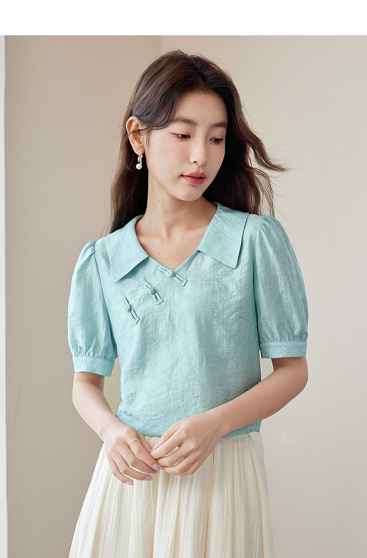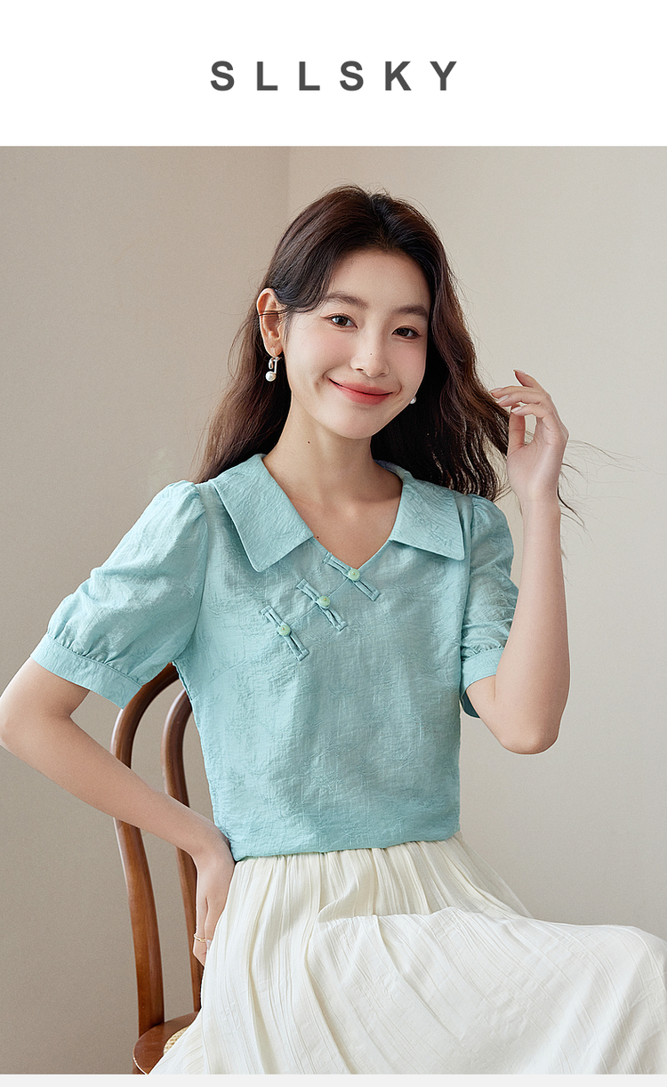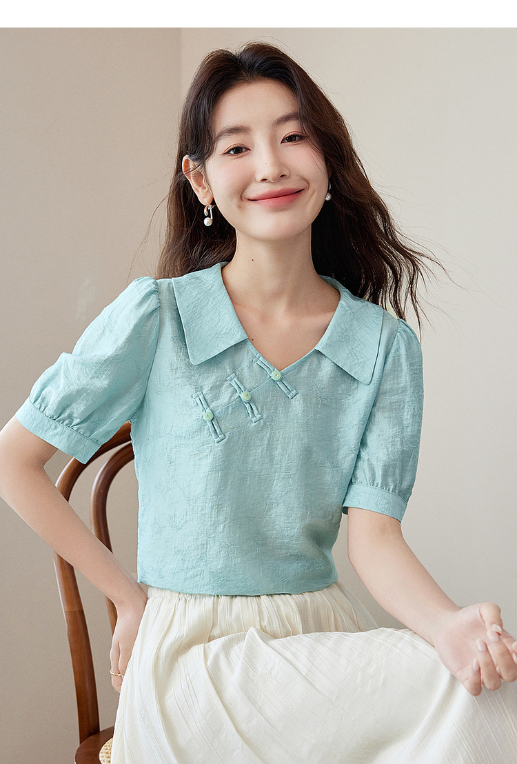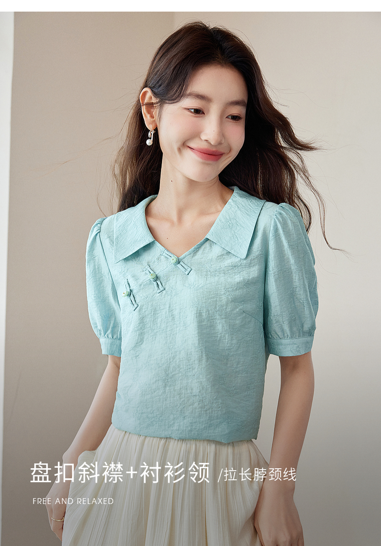【专属特价】熙世界新中式盘扣天丝衬衫2025夏装新款气质泡泡袖翻领国风上衣