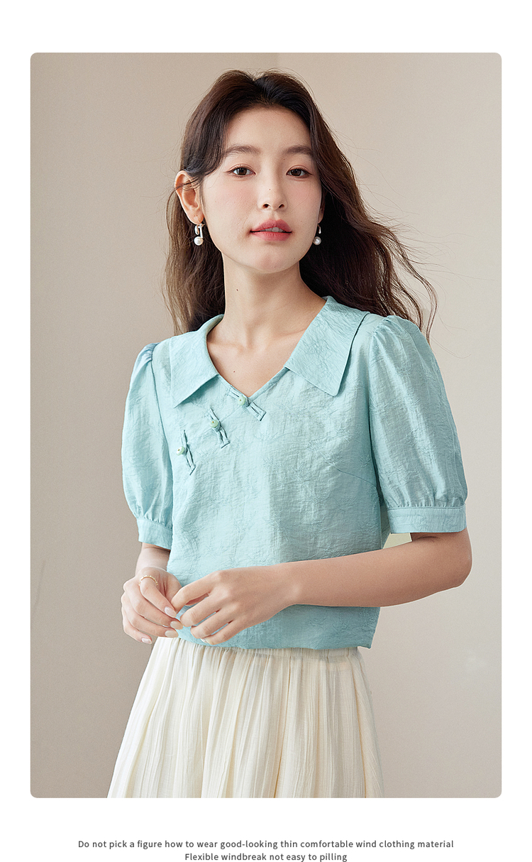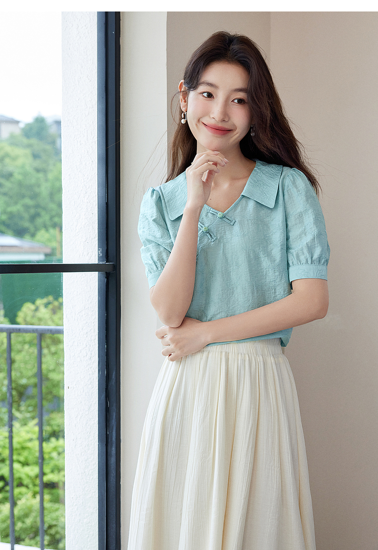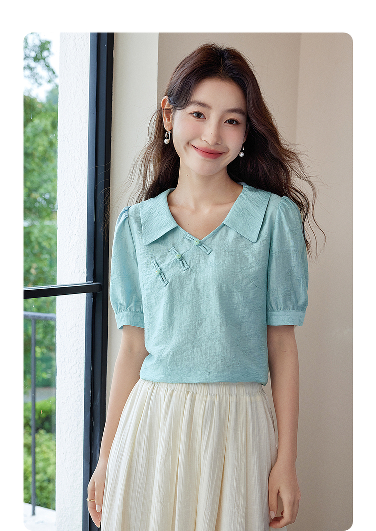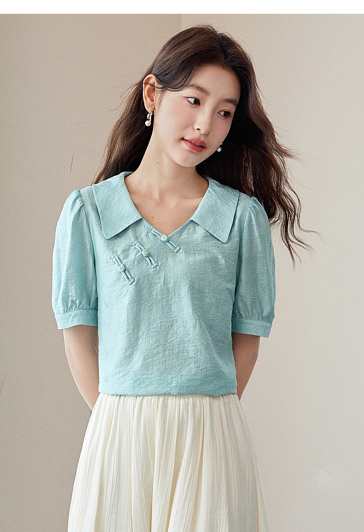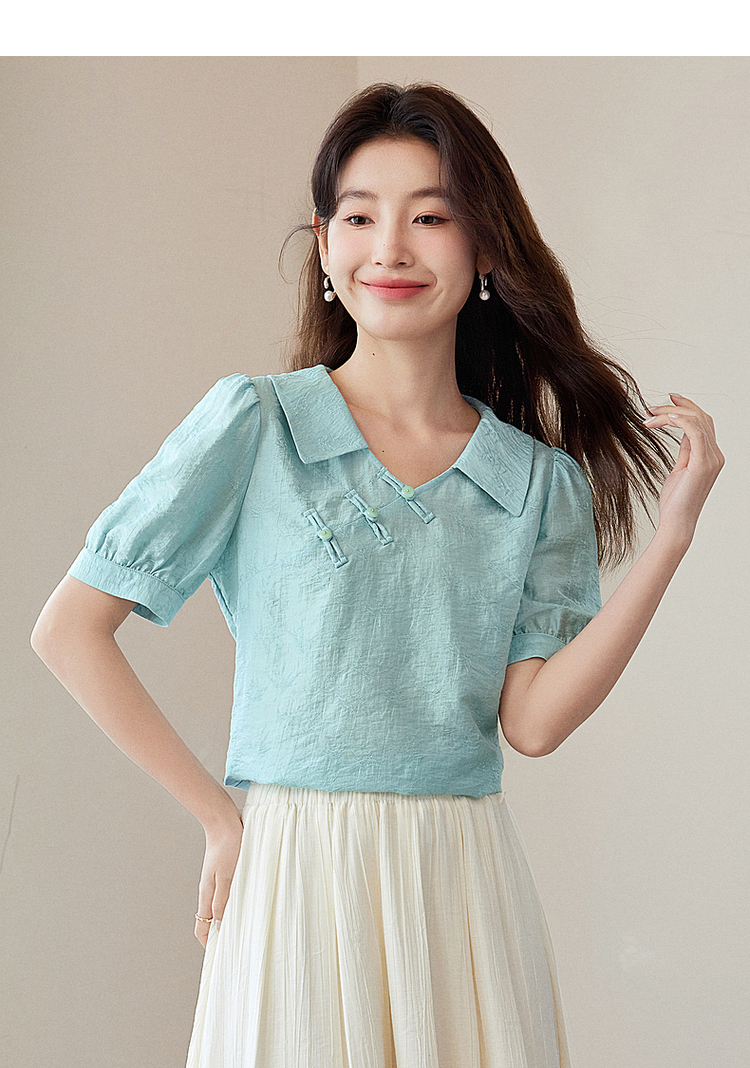 【专属特价】熙世界新中式盘扣天丝衬衫2025夏装新款气质泡泡袖翻领国风上衣