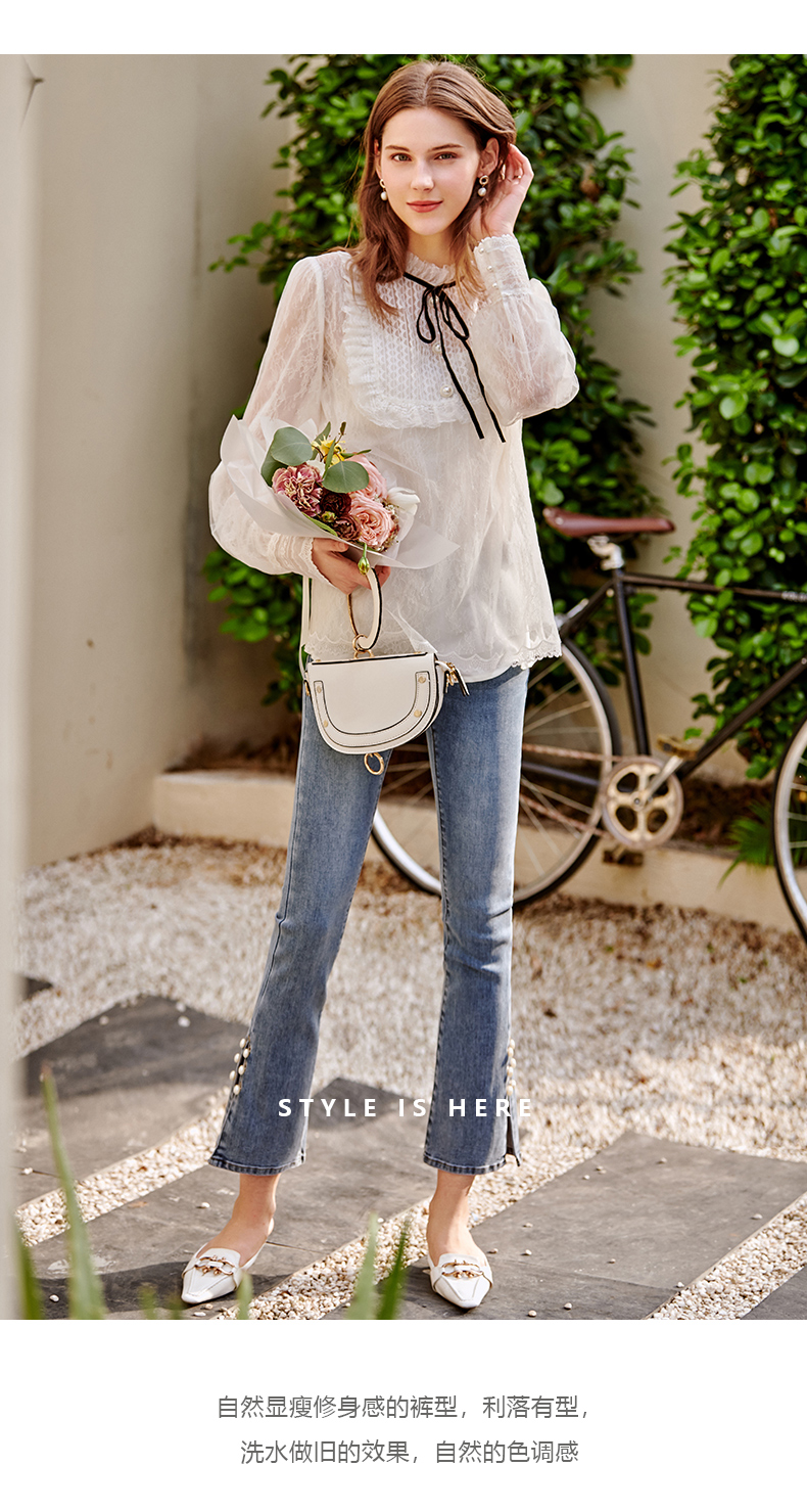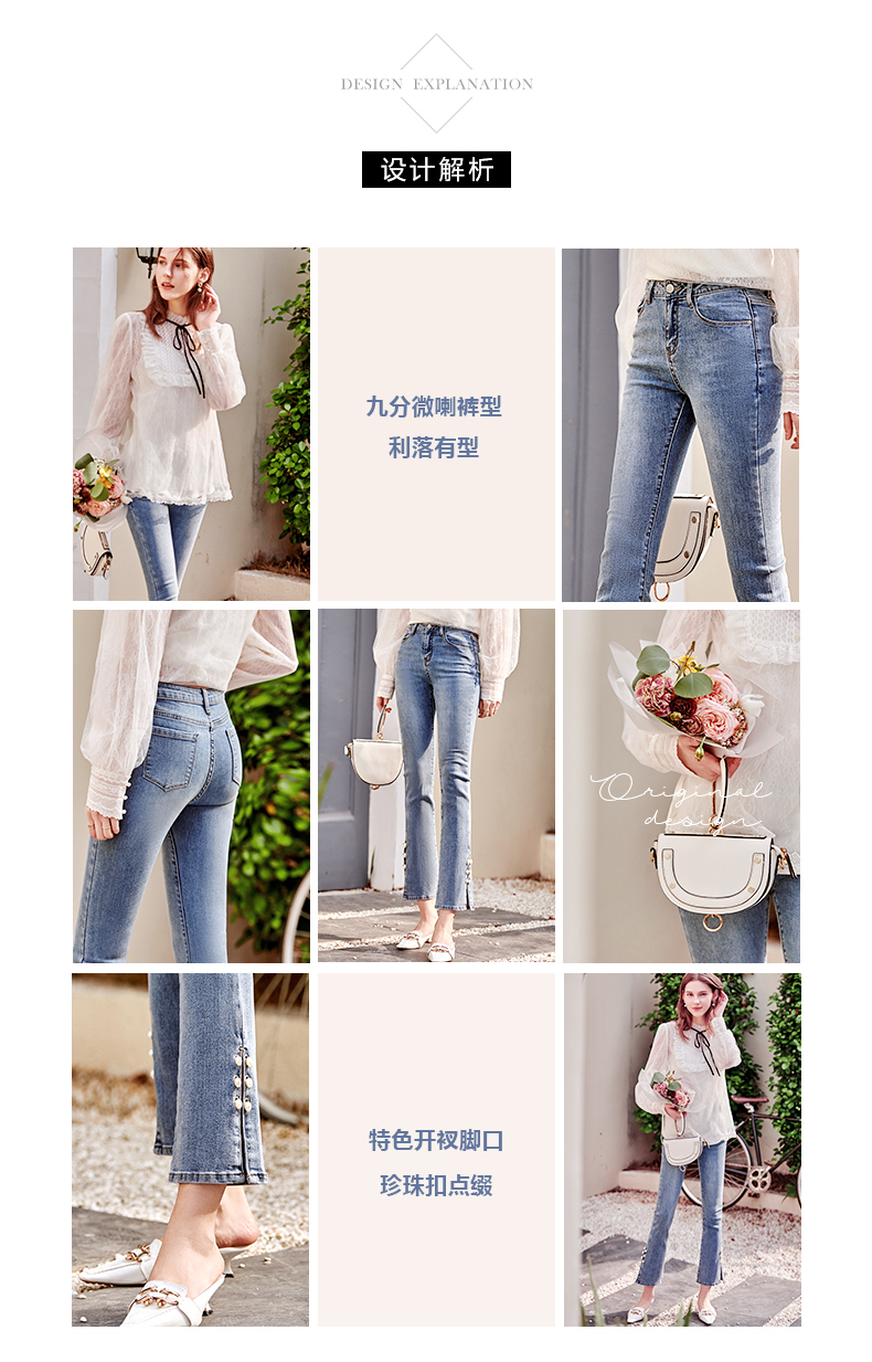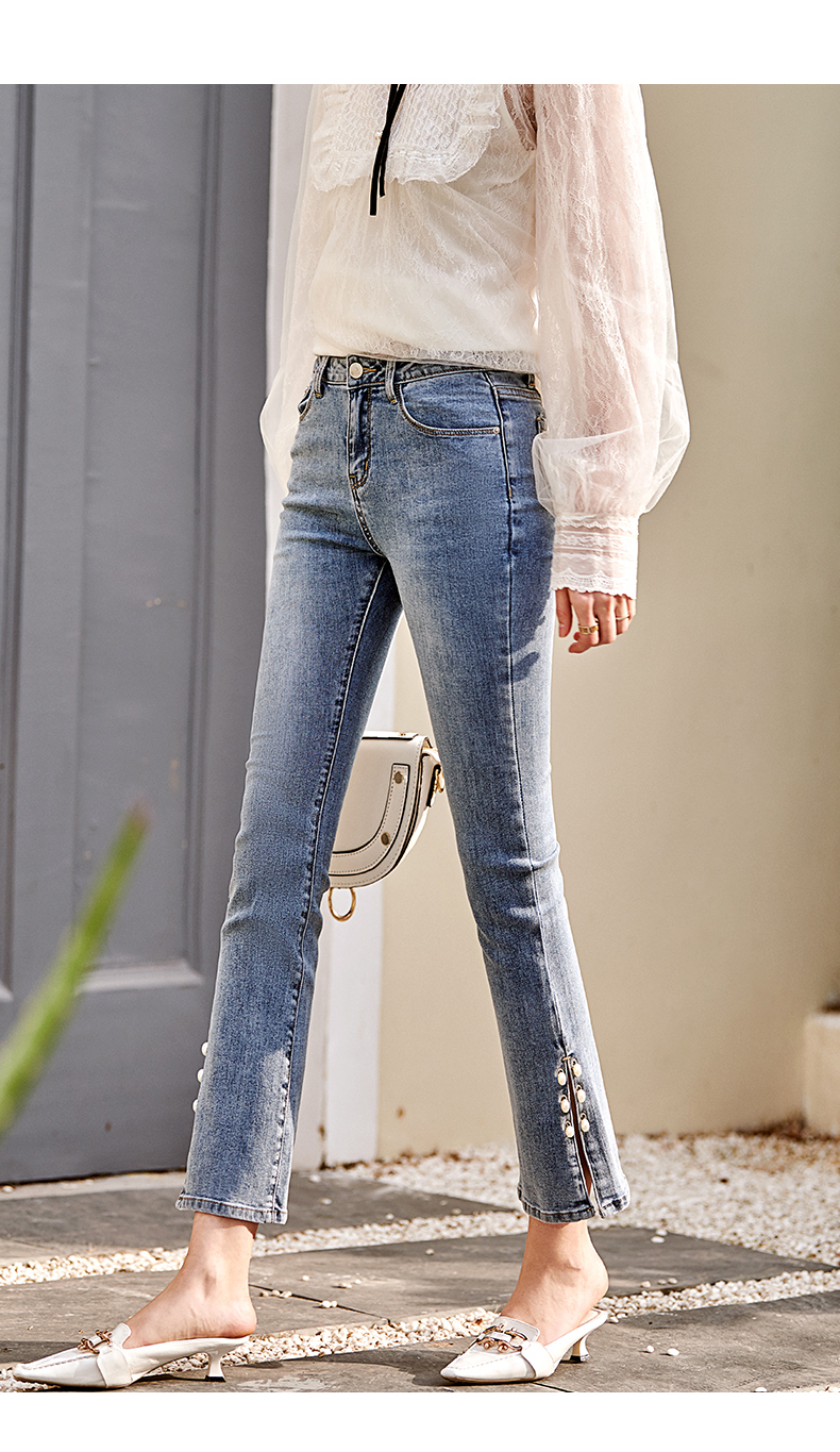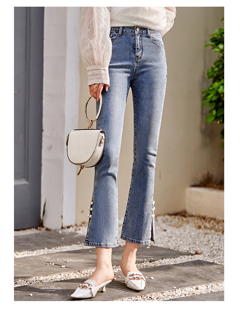 OLrain欧芮儿法式蓝色牛仔裤女早春2023年新款高腰开叉九分喇叭裤