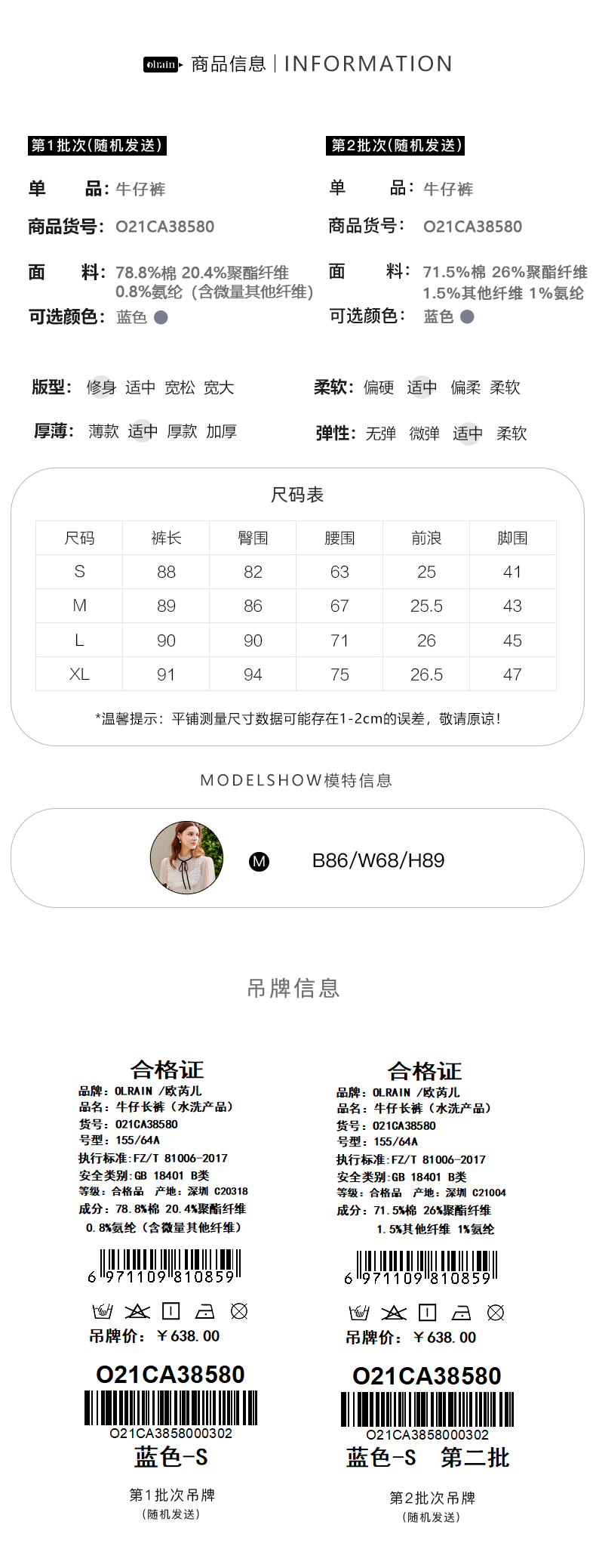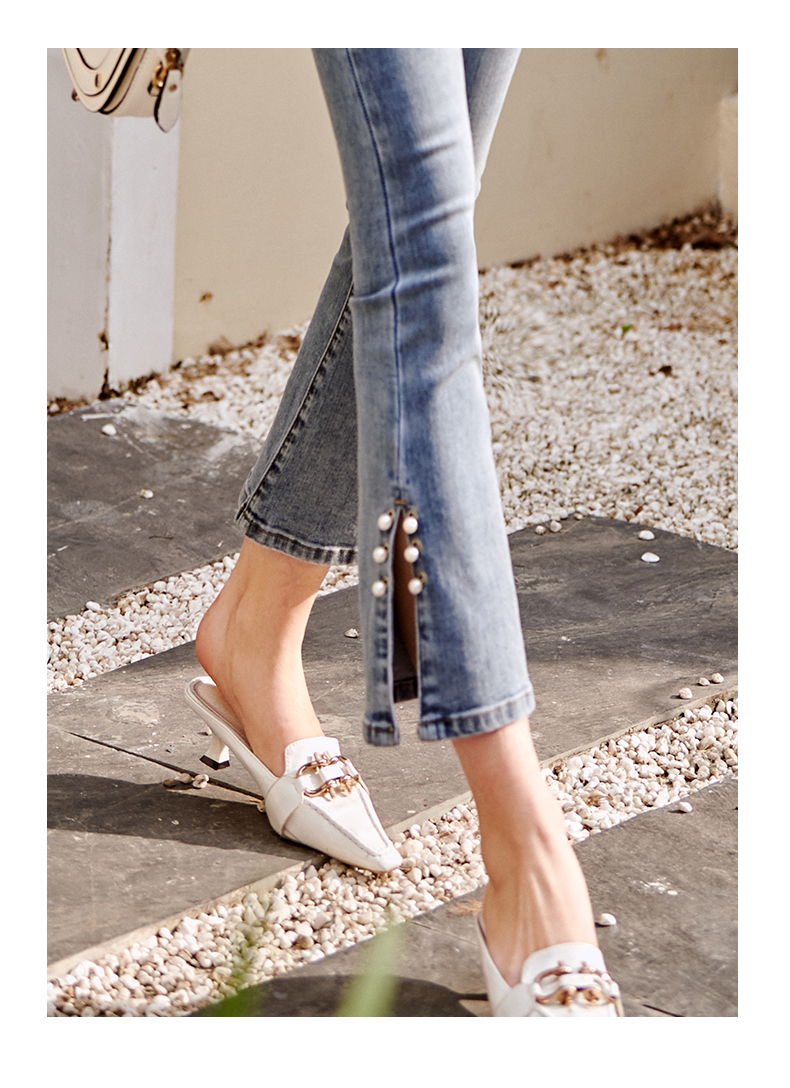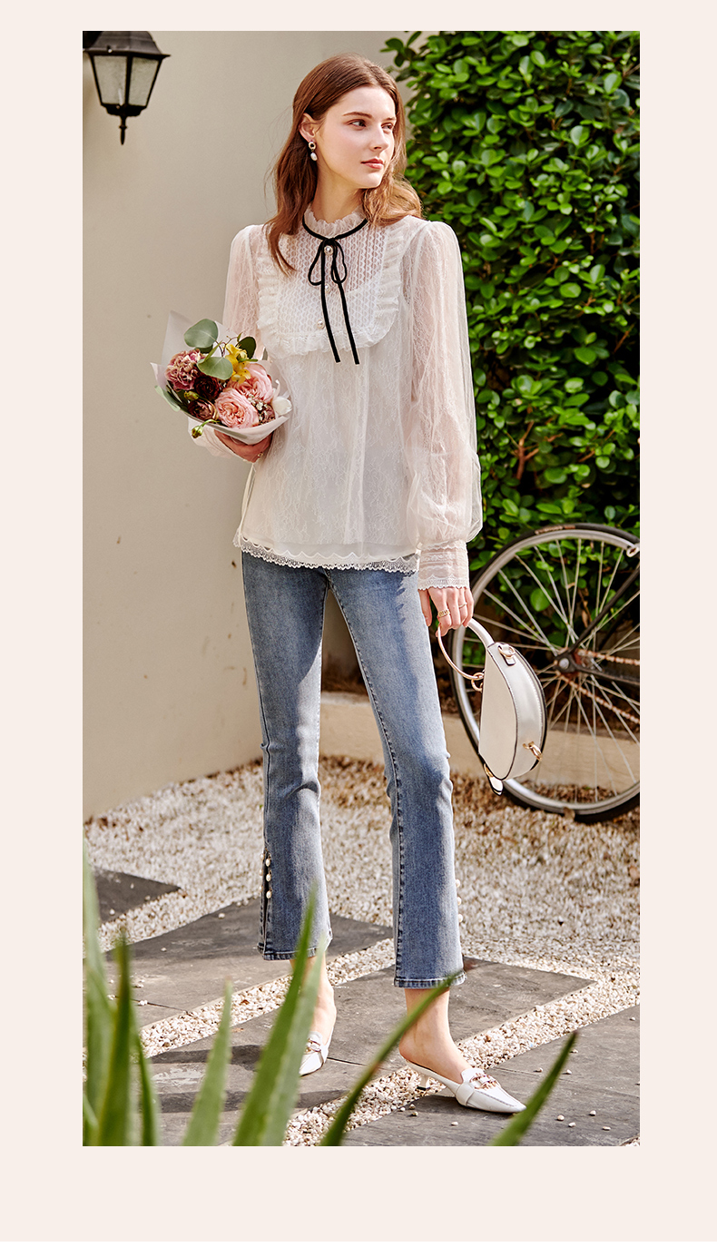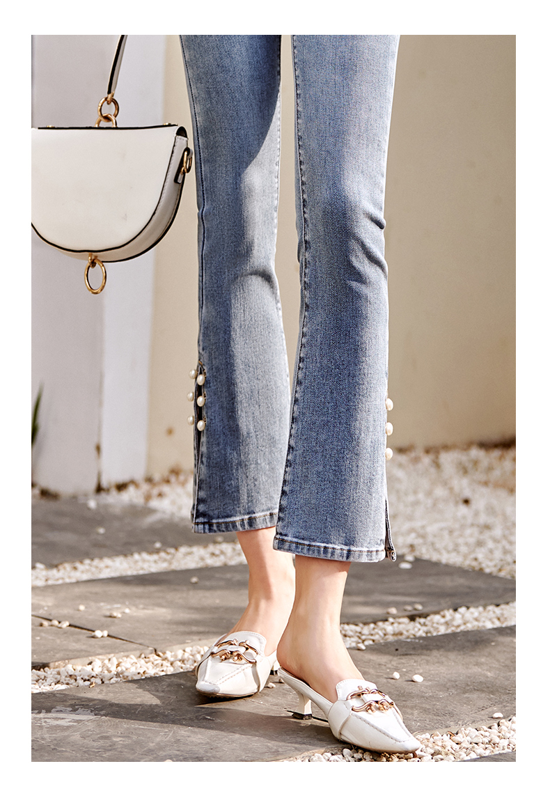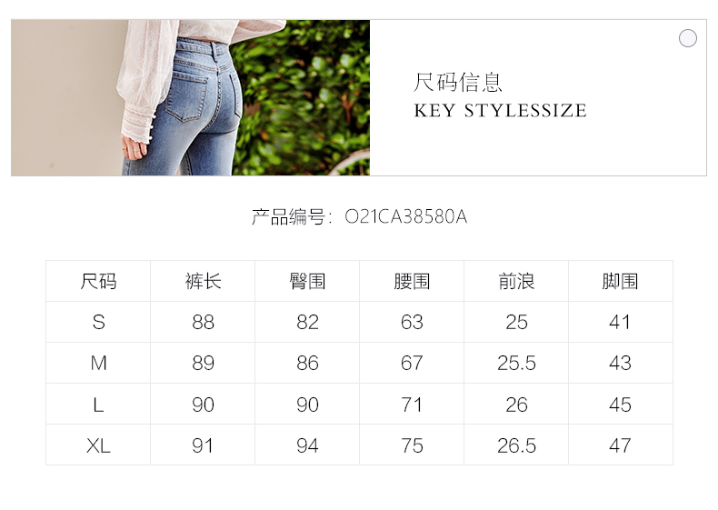 OLrain欧芮儿法式蓝色牛仔裤女早春2023年新款高腰开叉九分喇叭裤