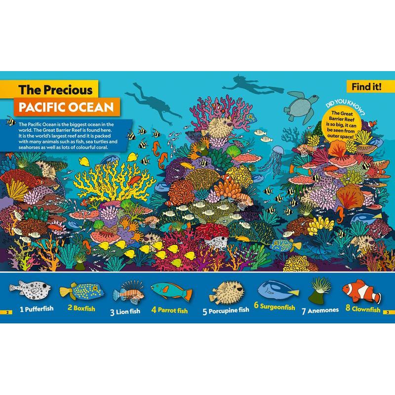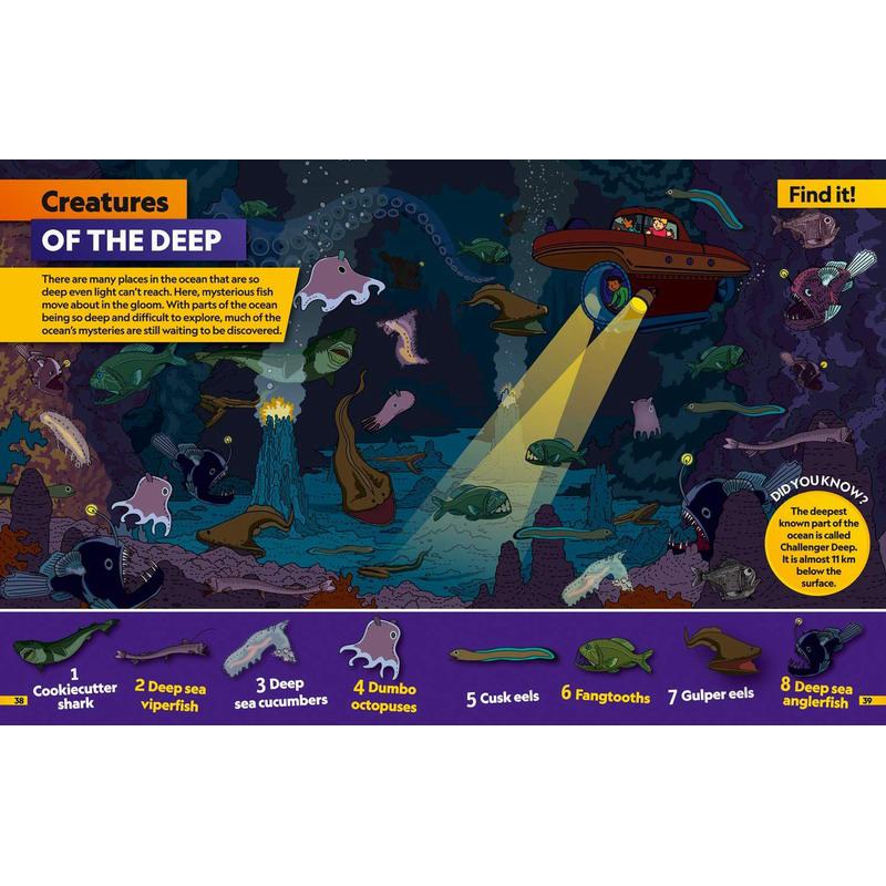 Find it! Search the busy illustrated scenes to find more than 250 sea creatures. From the Great Barrier Reef to the Arctic Ocean, shallow rockpools to the deepest, darkest depths they are sure to keep young readers entertained.