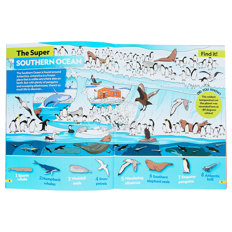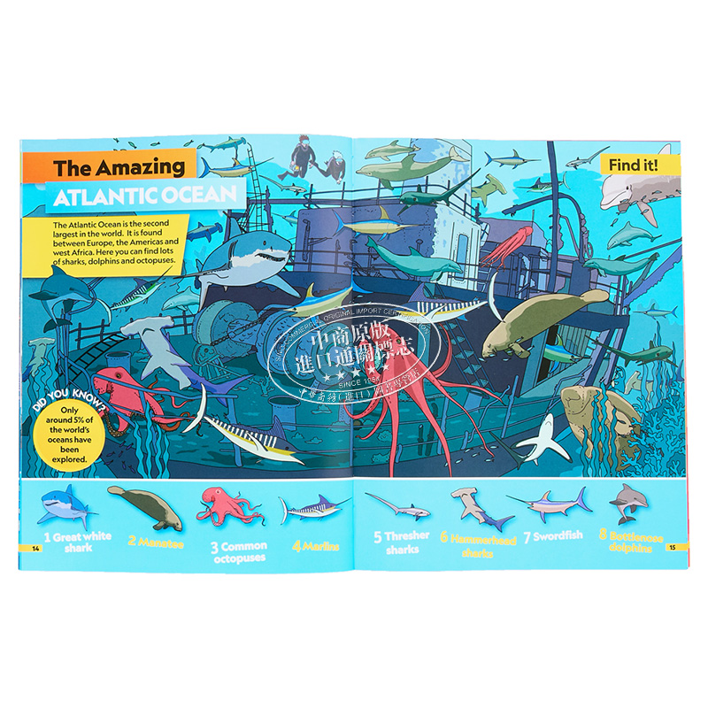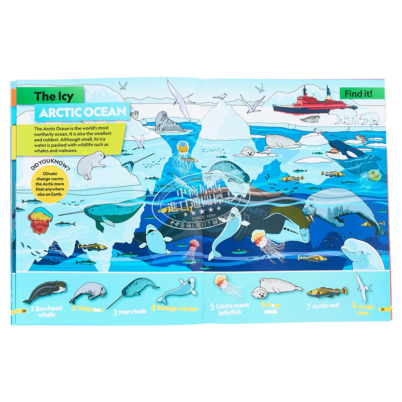 找到它!搜索繁忙的插图场景,找到 250 多种海洋生物。从大堡礁到北冰洋,从浅浅的岩池到至深、至黑暗的深海,它们一定会让小读者乐在其中。
