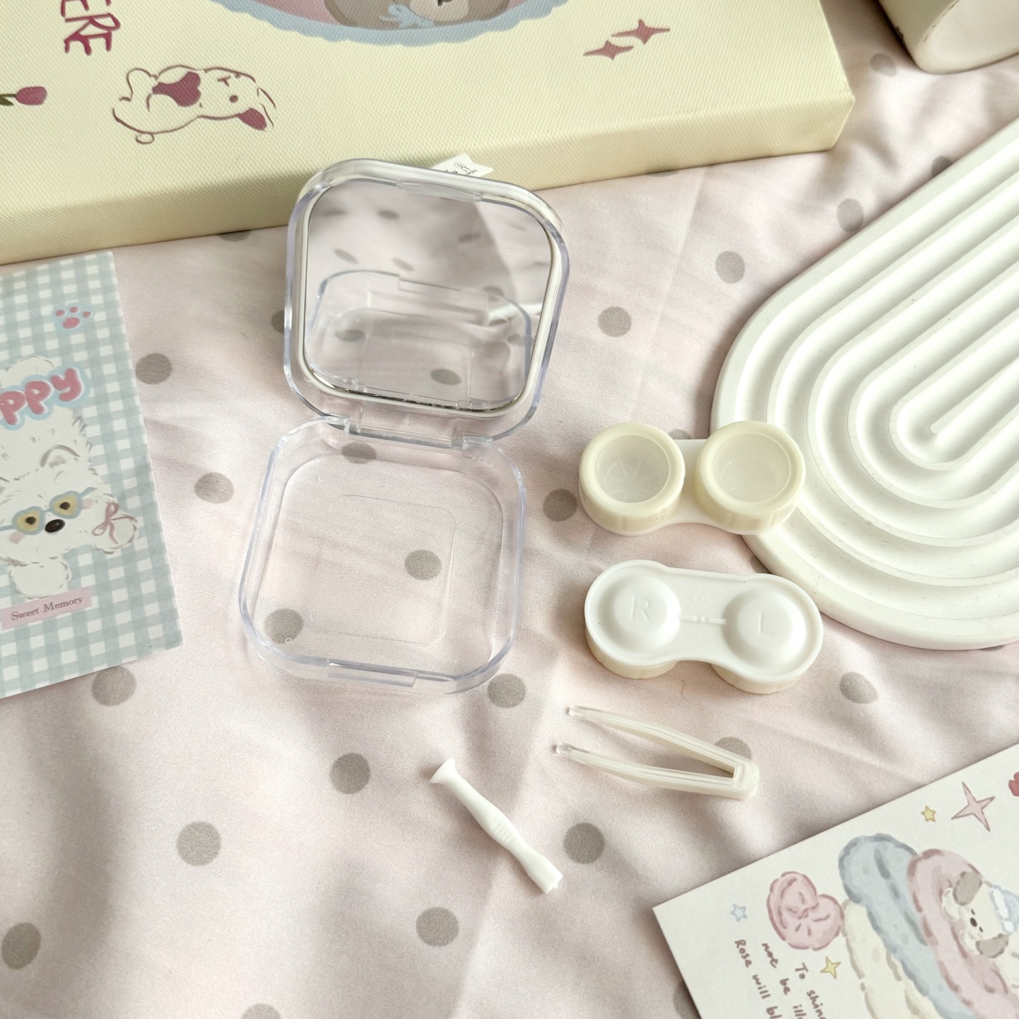 伴侣盒套装组成:双联盒、镊子 ,配戴棒、镜子。