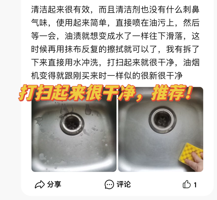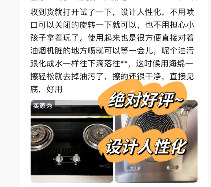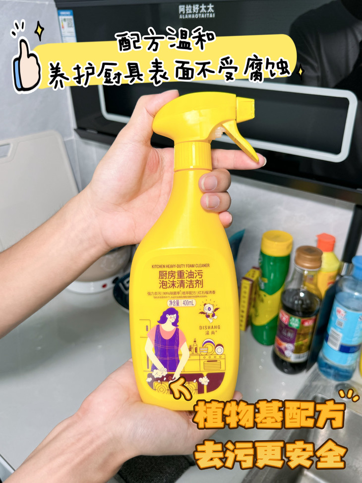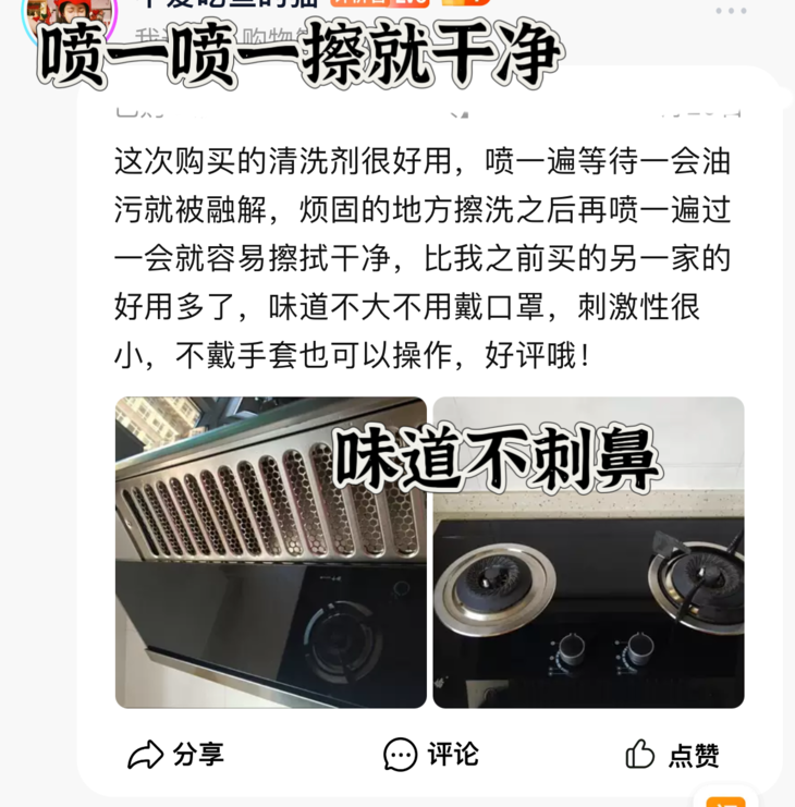 ❌不仅难清理,市面上的厨房油污清洁剂味道还超级刺鼻难闻,清洁一次厨房,要被熏的头昏脑涨,简直苦不堪言~