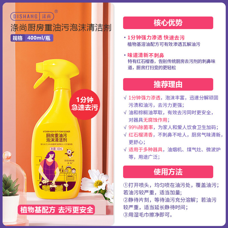 √1分钟强力渗透,泡沫丰富,迅速分解顽固污渍和油污,去渍力更强; √植物萃取,有效去污同时更安全,对器具无腐蚀作用; √99%除菌率,为家人和爱人饮食卫生加码; √红石榴清香,不刺鼻不呛人,厨房气味清新,更舒心; √适用于多种器具,油烟机、煤气灶、微波炉等,用途广泛;