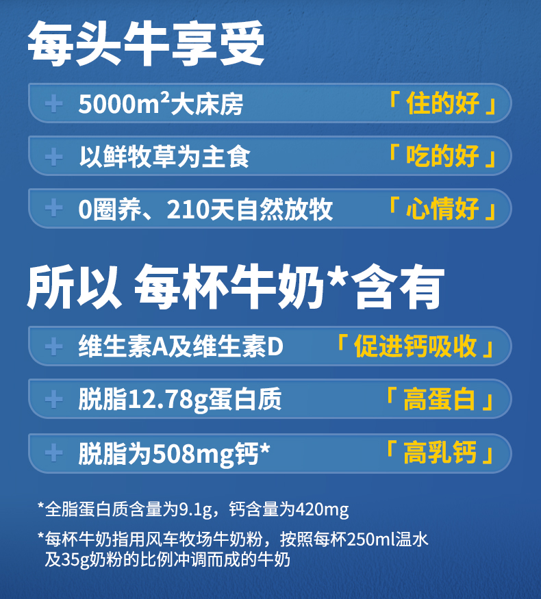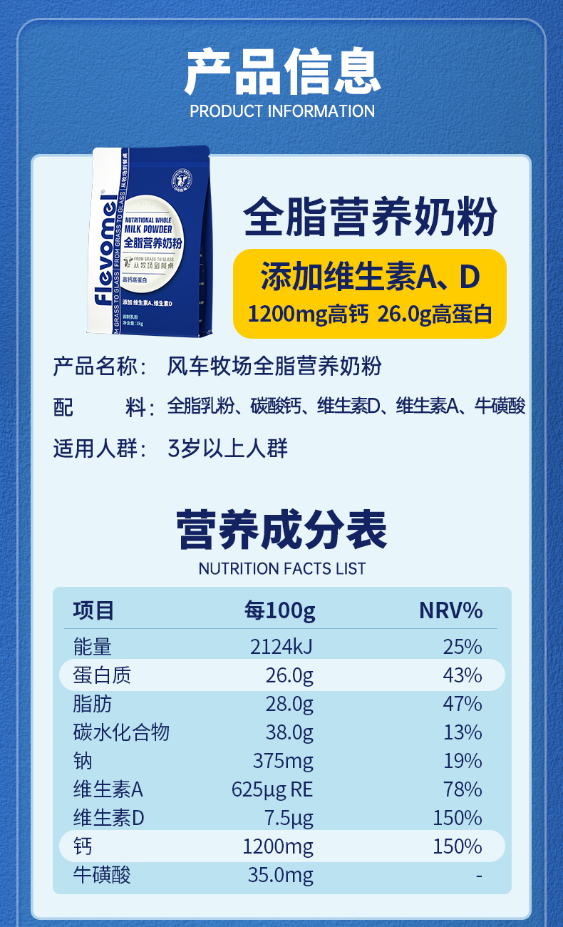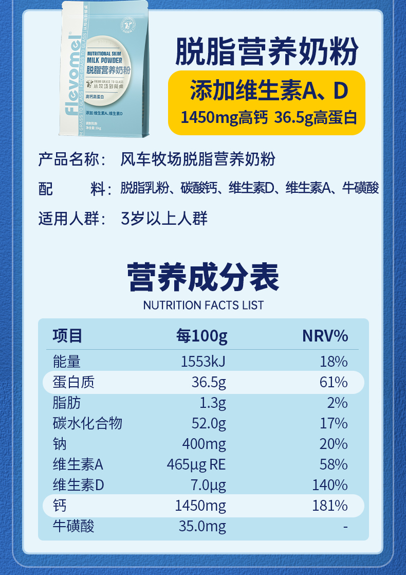 风车牧场 牛奶粉 高钙高蛋白脱脂 中老年儿童女士成人乳粉