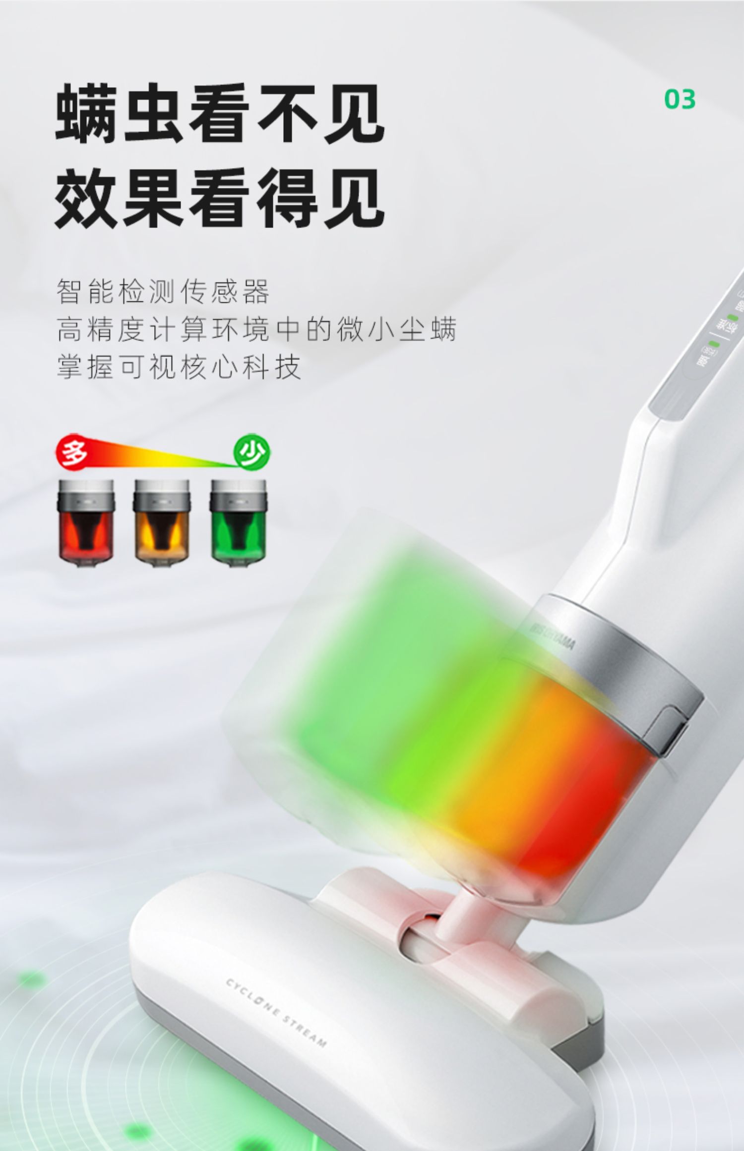 1、红黄绿三色灰尘感应灯(市场独有),红色代表灰尘集中较脏,黄色代表少量灰尘,绿色代表干净,无尘螨灰尘