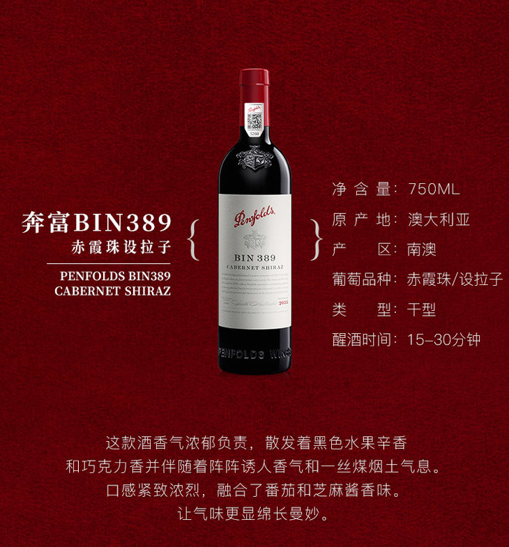 澳大利亚奔富 BIN389 干红葡萄酒750ml*1瓶