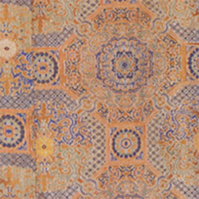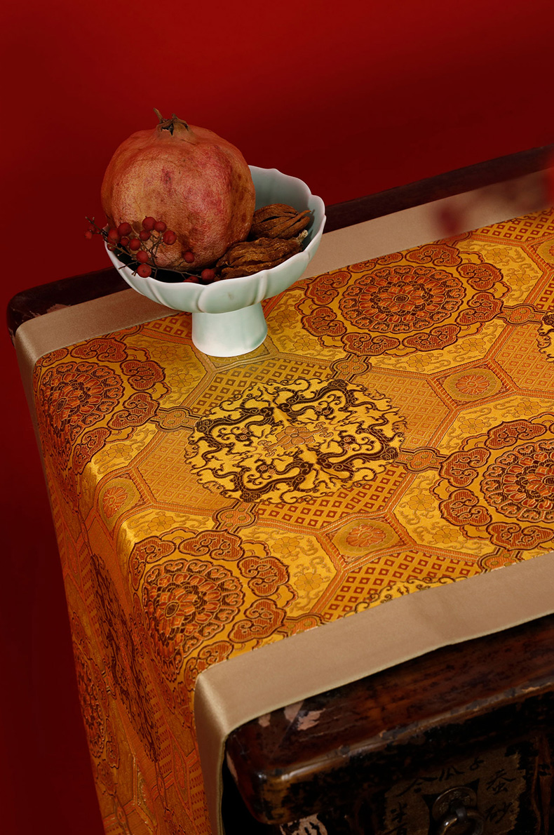 图案源自清宫所藏唐琴宋锦琴囊,(古琴套),名为“如意夔龙大天华锦”,以八角几何纹为间架,由两组主体花纹构成,一组以八朵如意云头组成,中心饰瑞花,辅以朵花蔓草,装饰华丽精细;另一组以四夔龙组成,中心饰宝相花,辅以连钱纹。夔龙形象生动,稚拙可爱,整体布局均衡大气,刚柔相济,配以四种色调,用色沉稳和谐。寓意吉祥如意,平安祥和,财源广进,路路畅通。