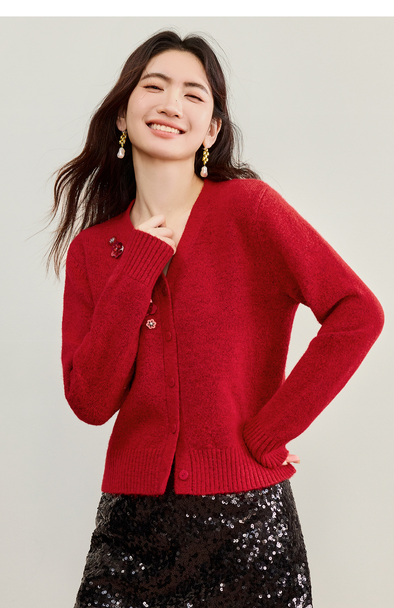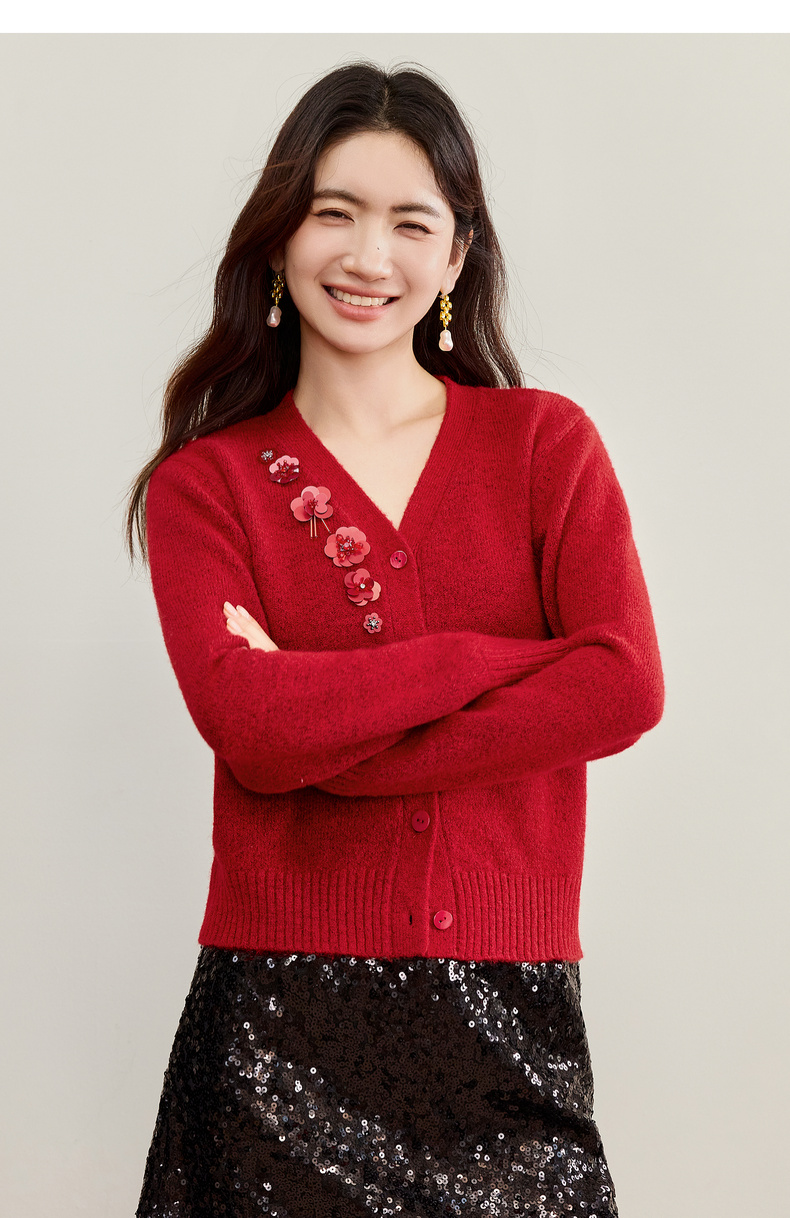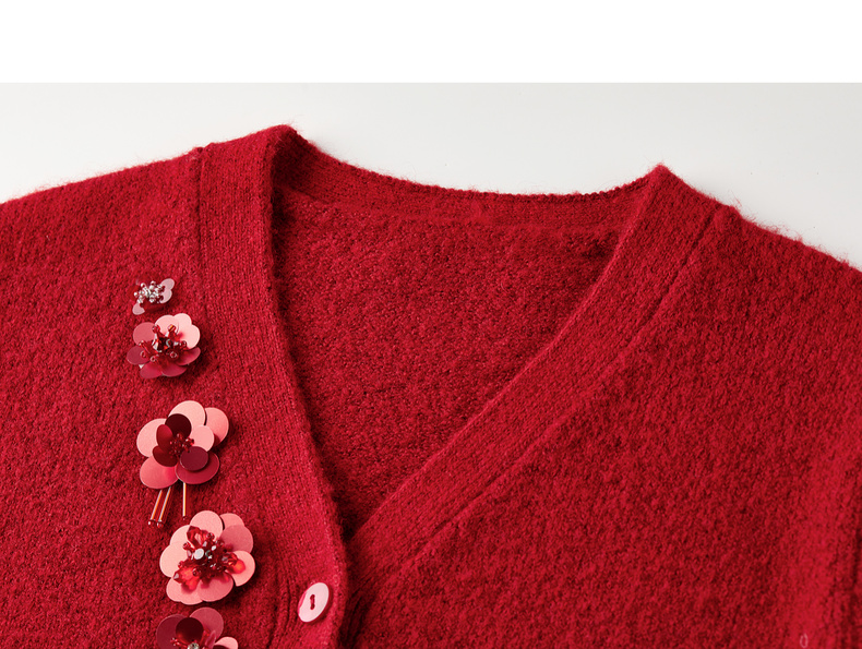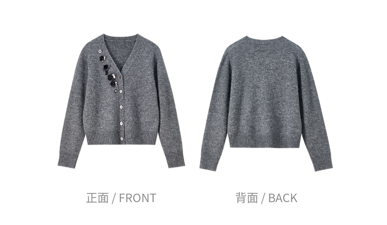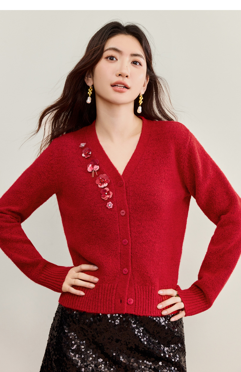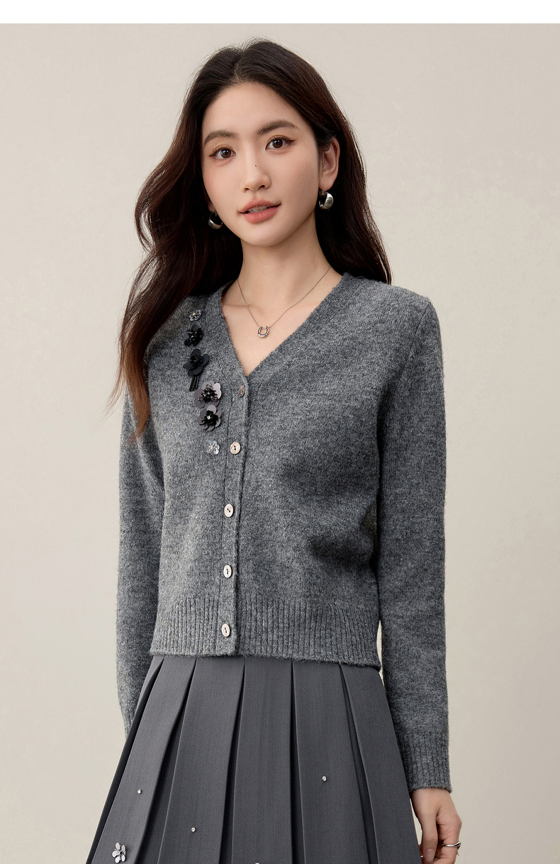 【内购】【含绵羊毛】优雅通勤V领贝壳扣簇状珠片花软糯弹力长袖开衫毛衣-W53EB3381