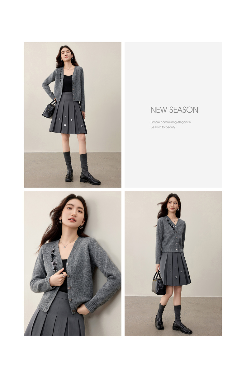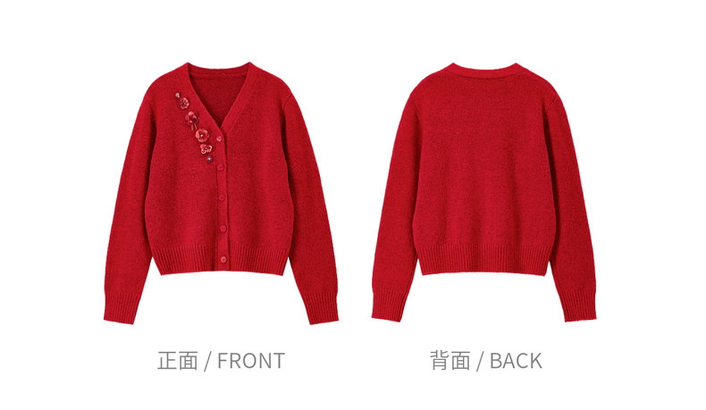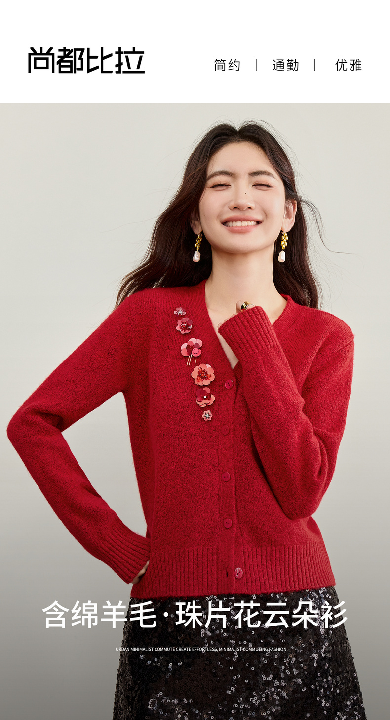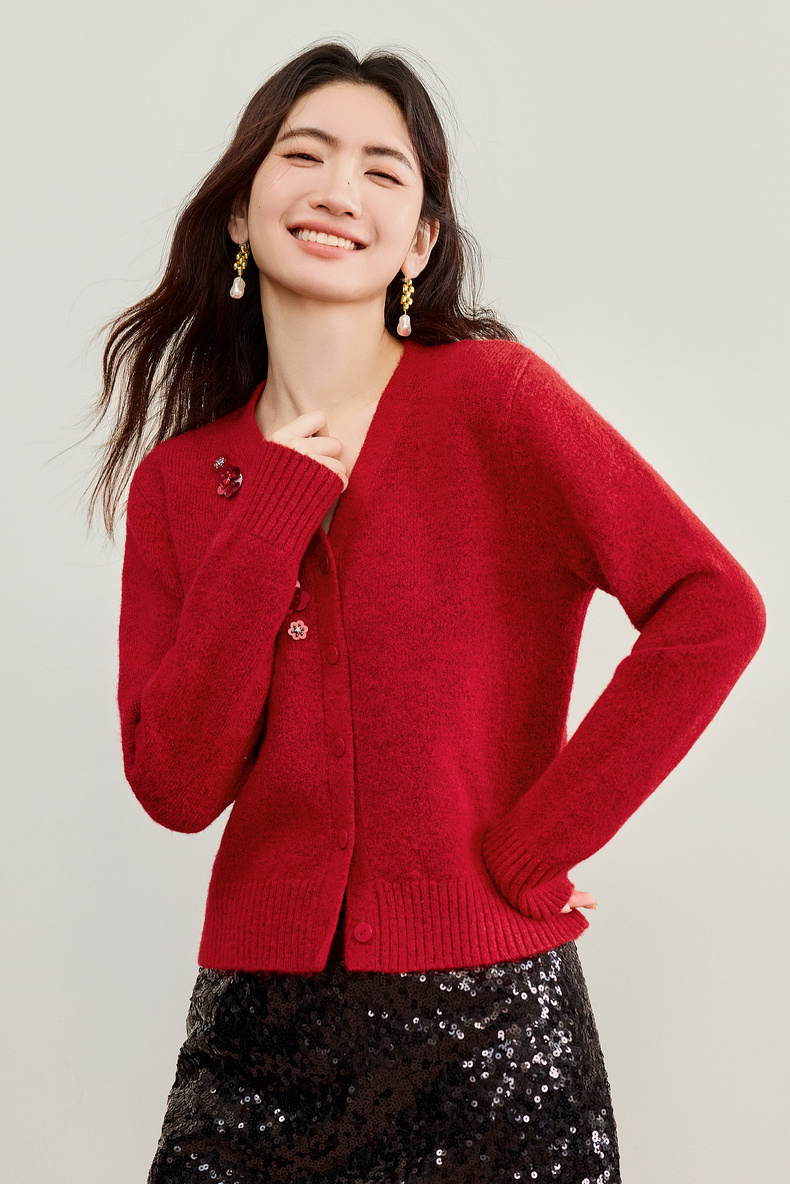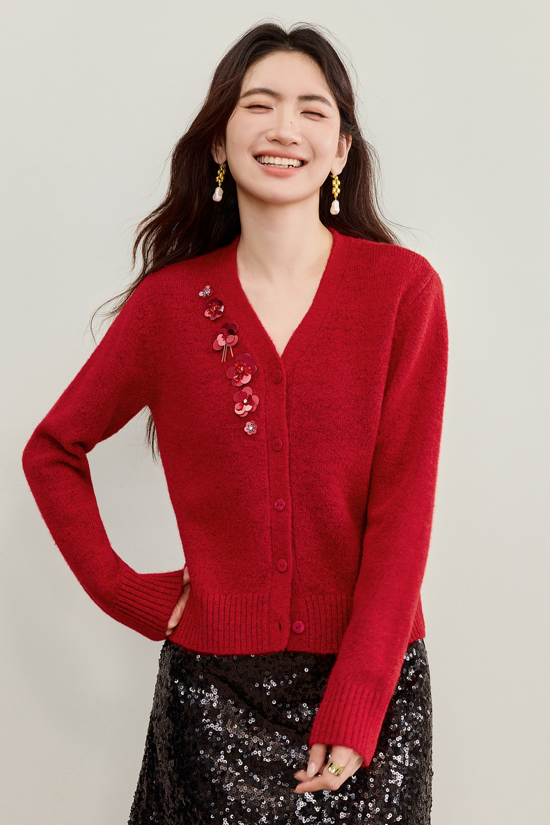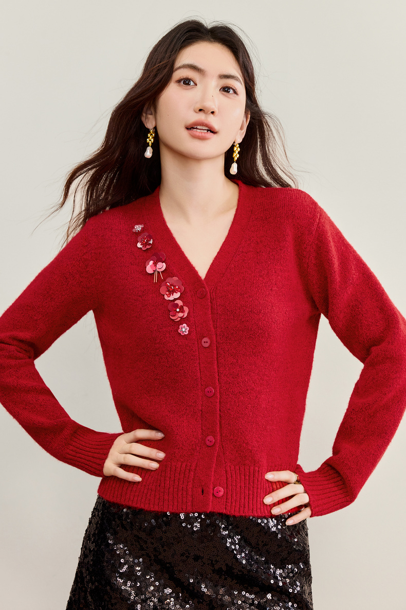 【内购】【含绵羊毛】优雅通勤V领贝壳扣簇状珠片花软糯弹力长袖开衫毛衣-W53EB3381