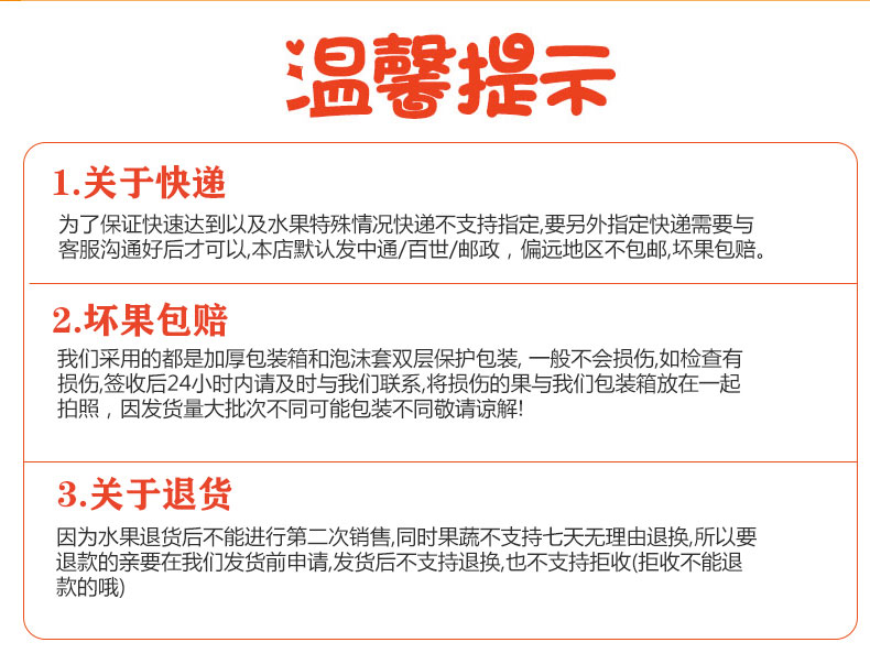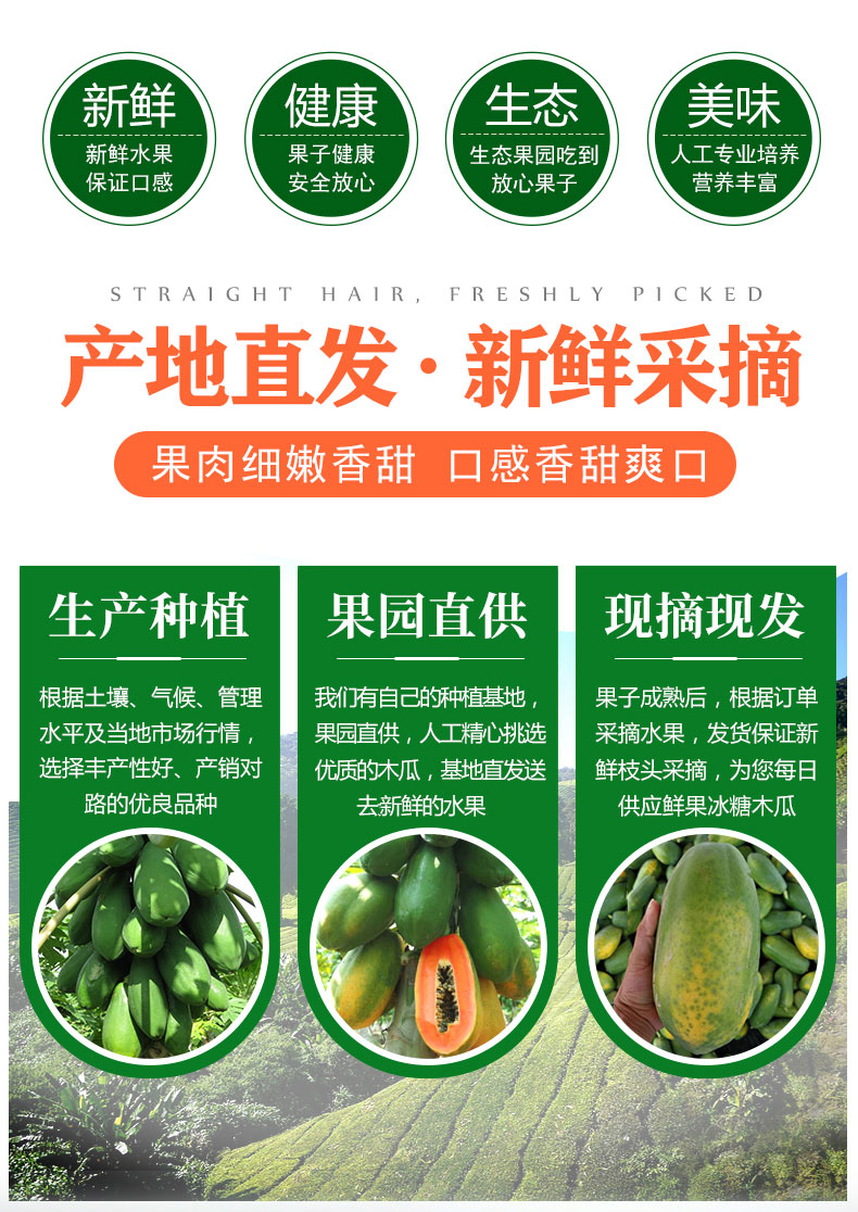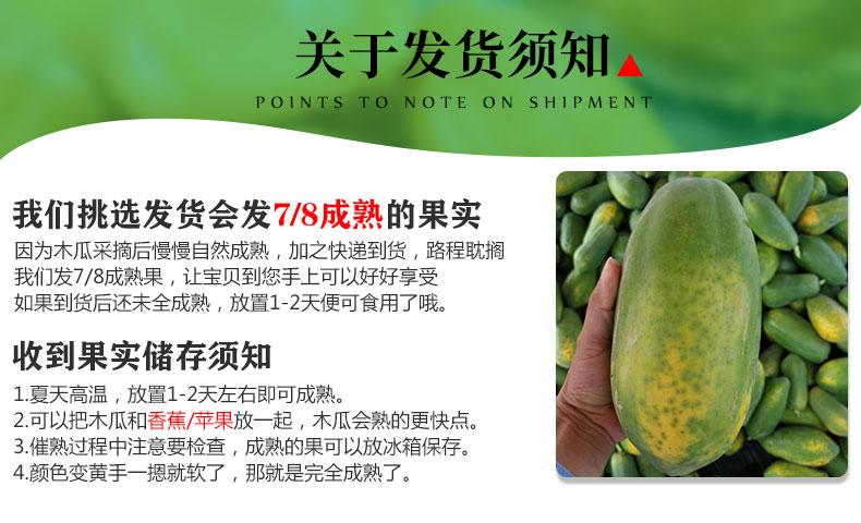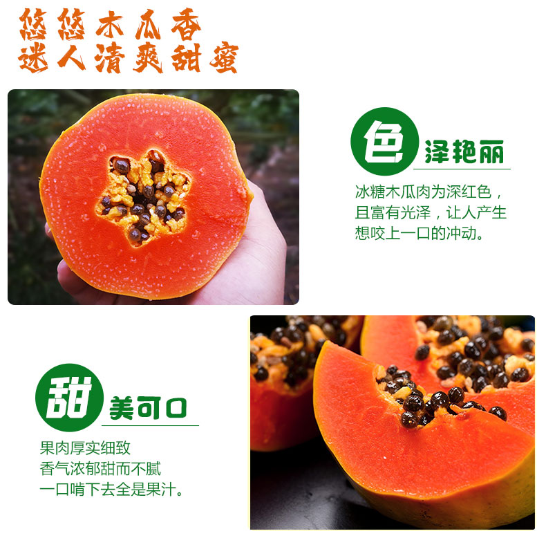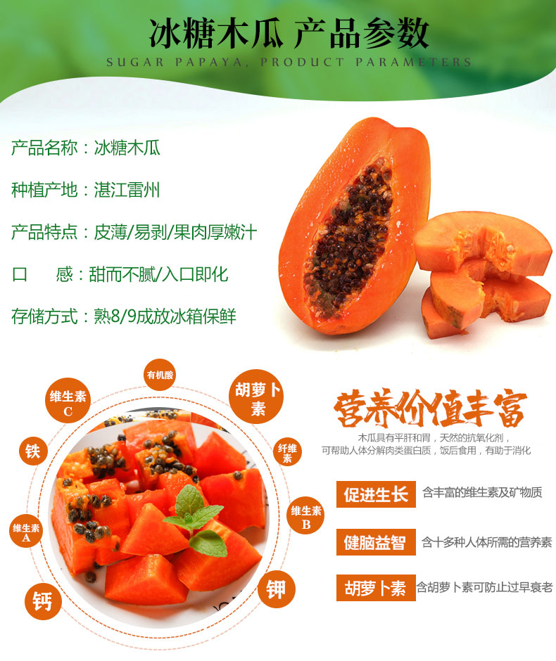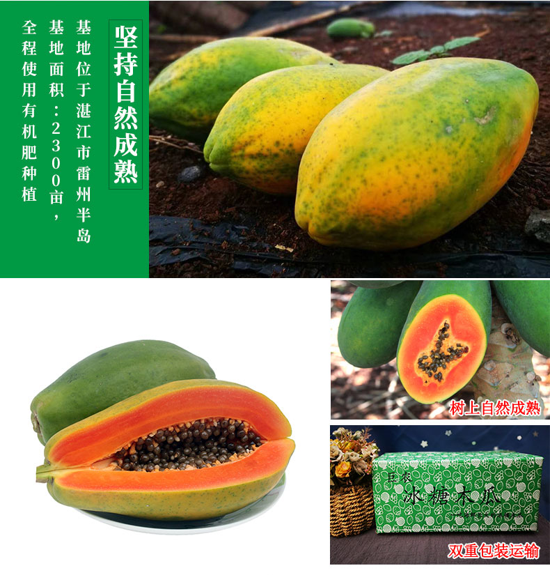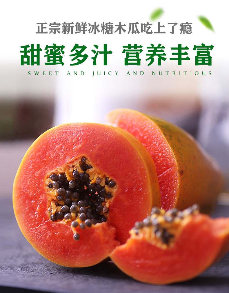 品名:冰糖心木瓜规格:多规格发货地/产地:广东/广东保质期: 初级农产品,建议收到后尽快食用。包装方式:箱装物流信息:四通一达或其它快递随机发货,不接受指定快递。不发货区域:新疆、西藏、港澳台、疫情管控区。 |