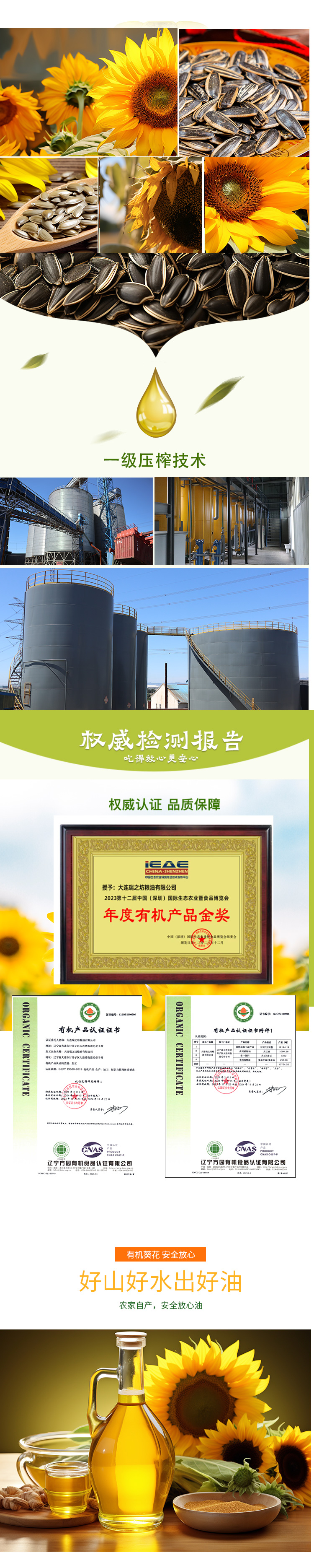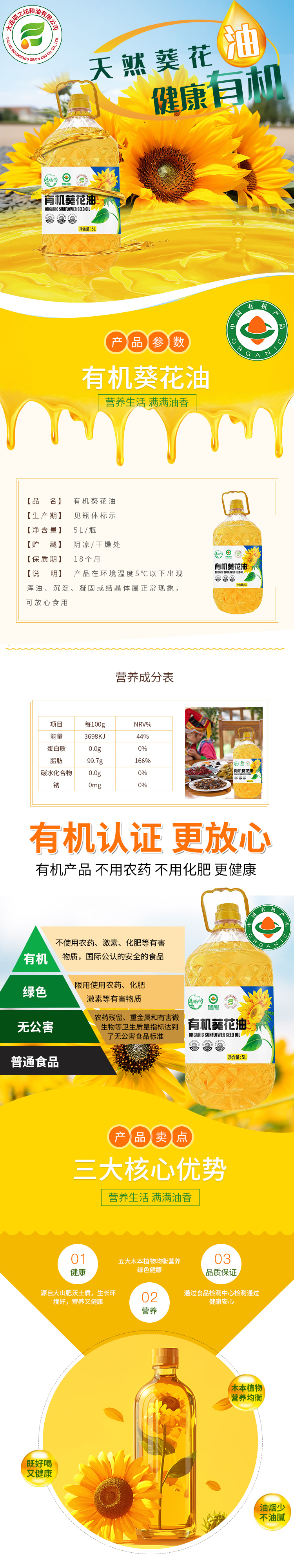 【品名】有机葵花油 【产地】大连 【生产期】见瓶体标示 【净含量】5L/瓶 【贮藏】阴 凉/干燥处 【保质期】18个月 【说明】产品在环境温度5℃以下出现浑浊、沉淀、凝固或结晶体属正常现象,可放心食用