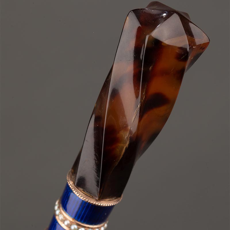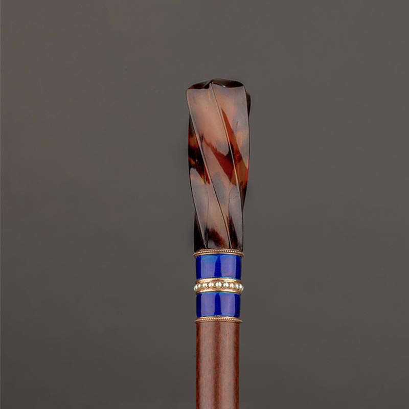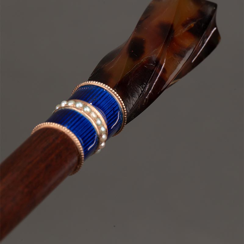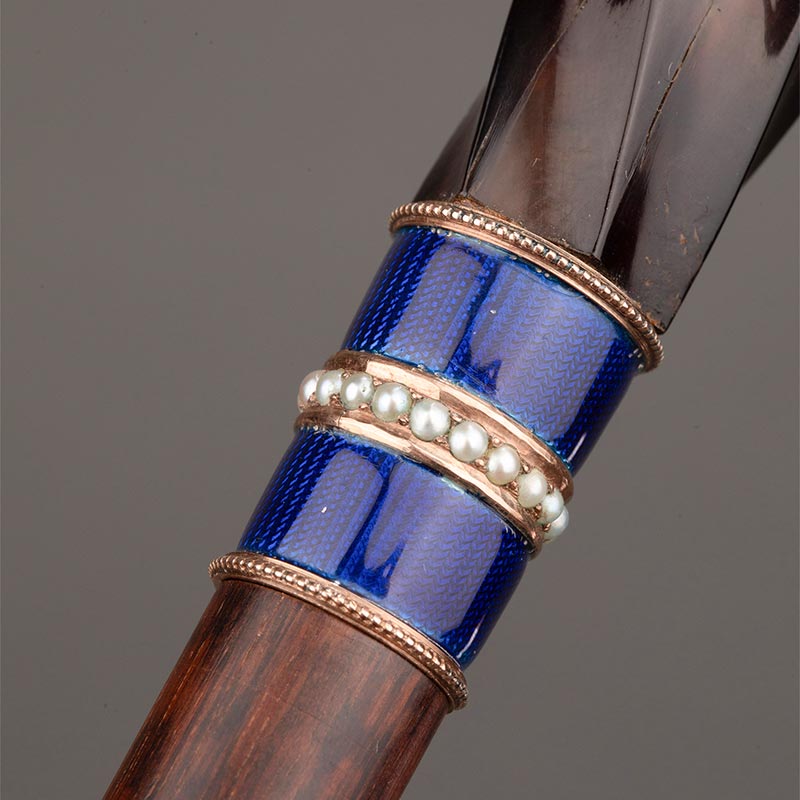 18世纪英国出品扭纹天然材质可拆卸杖柄珍珠嵌玑镂珐琅杖圈装饰蛇纹木杖身牛角杖脚古董手杖