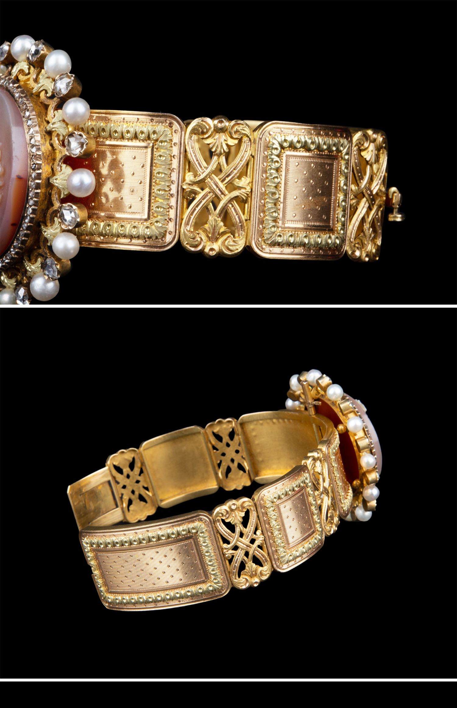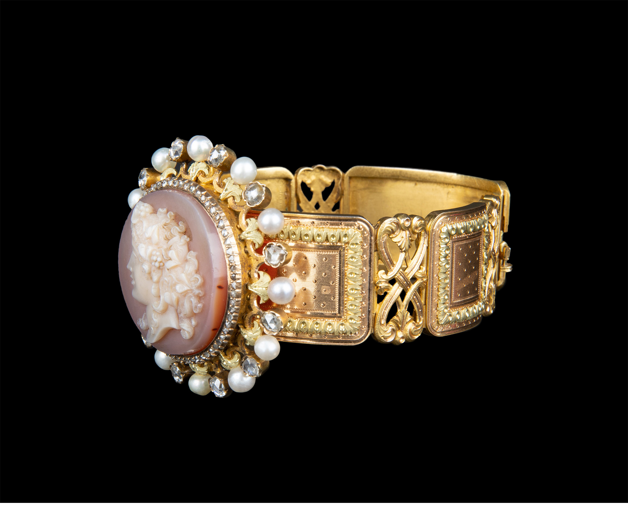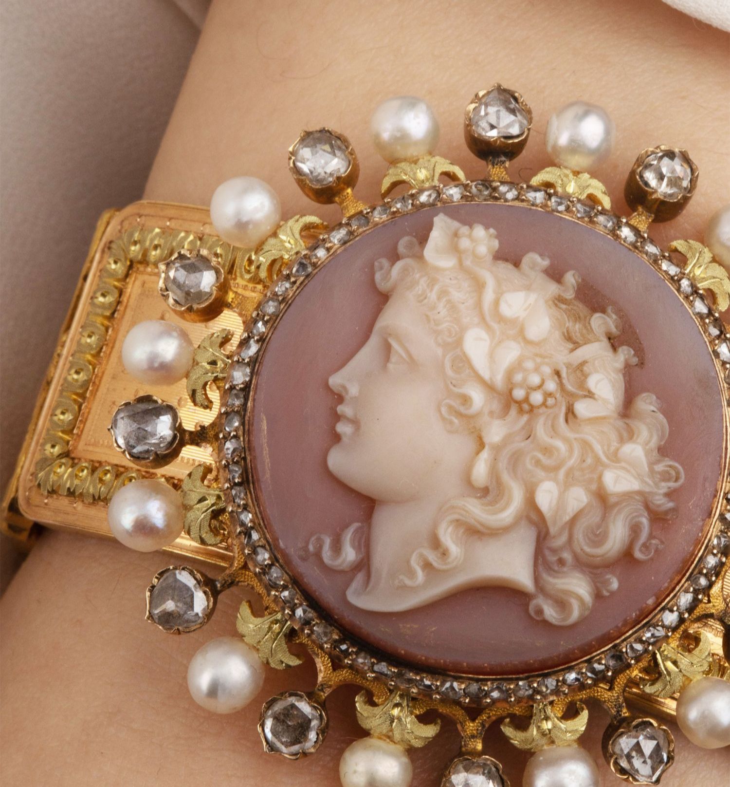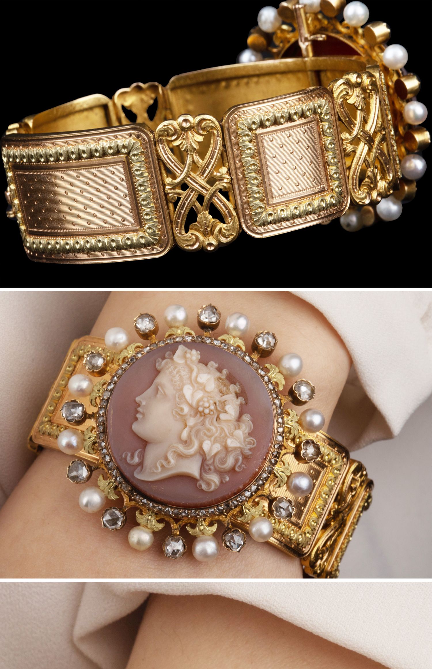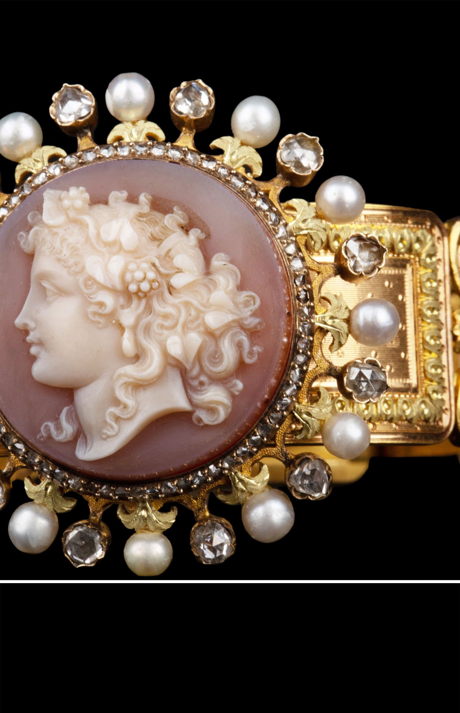 独角鹿西洋古董18K金镶嵌珍珠钻石玛瑙浮雕卡梅奥cameo手镯手链