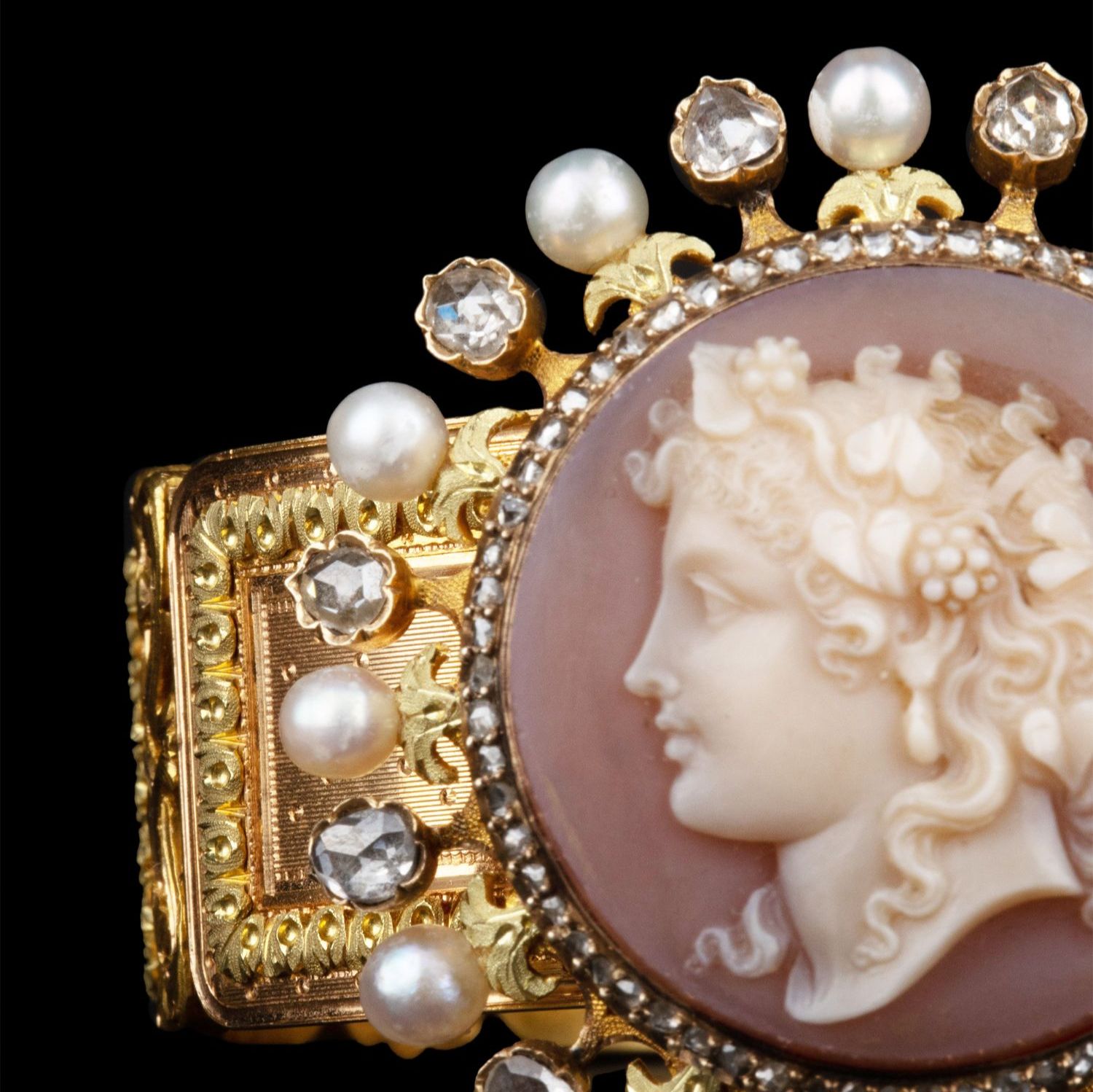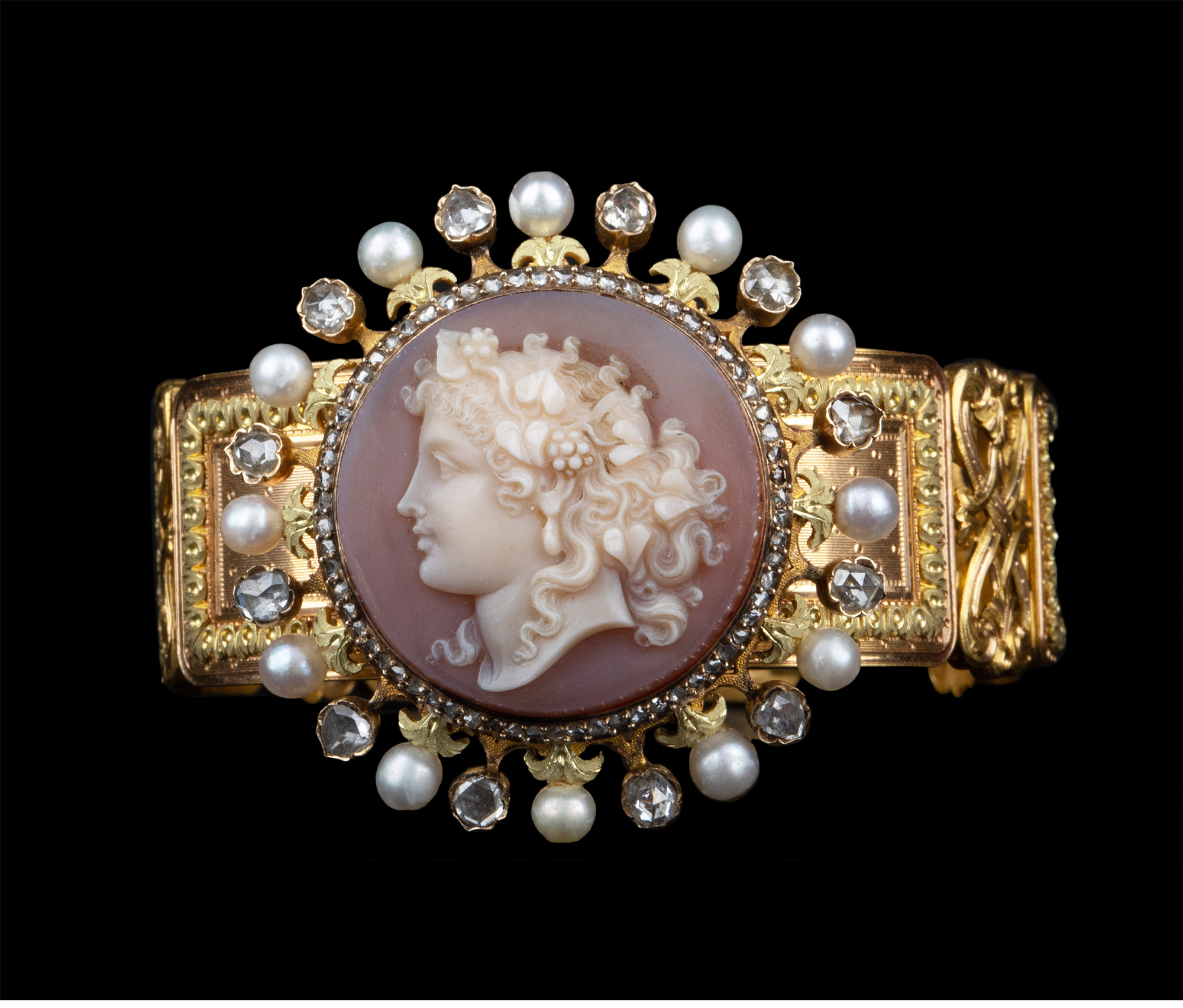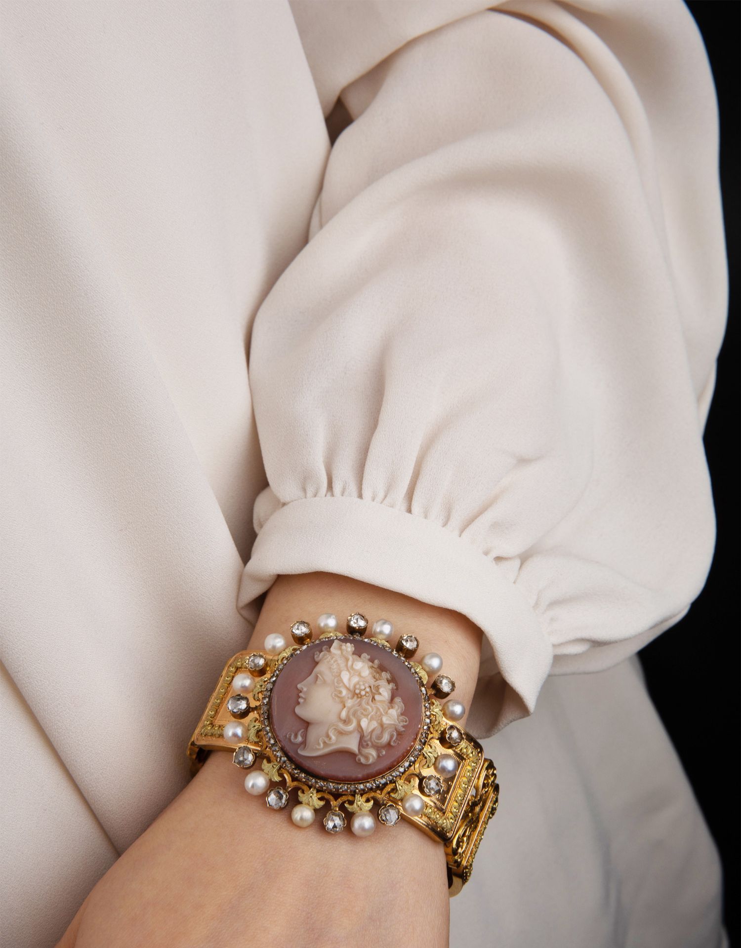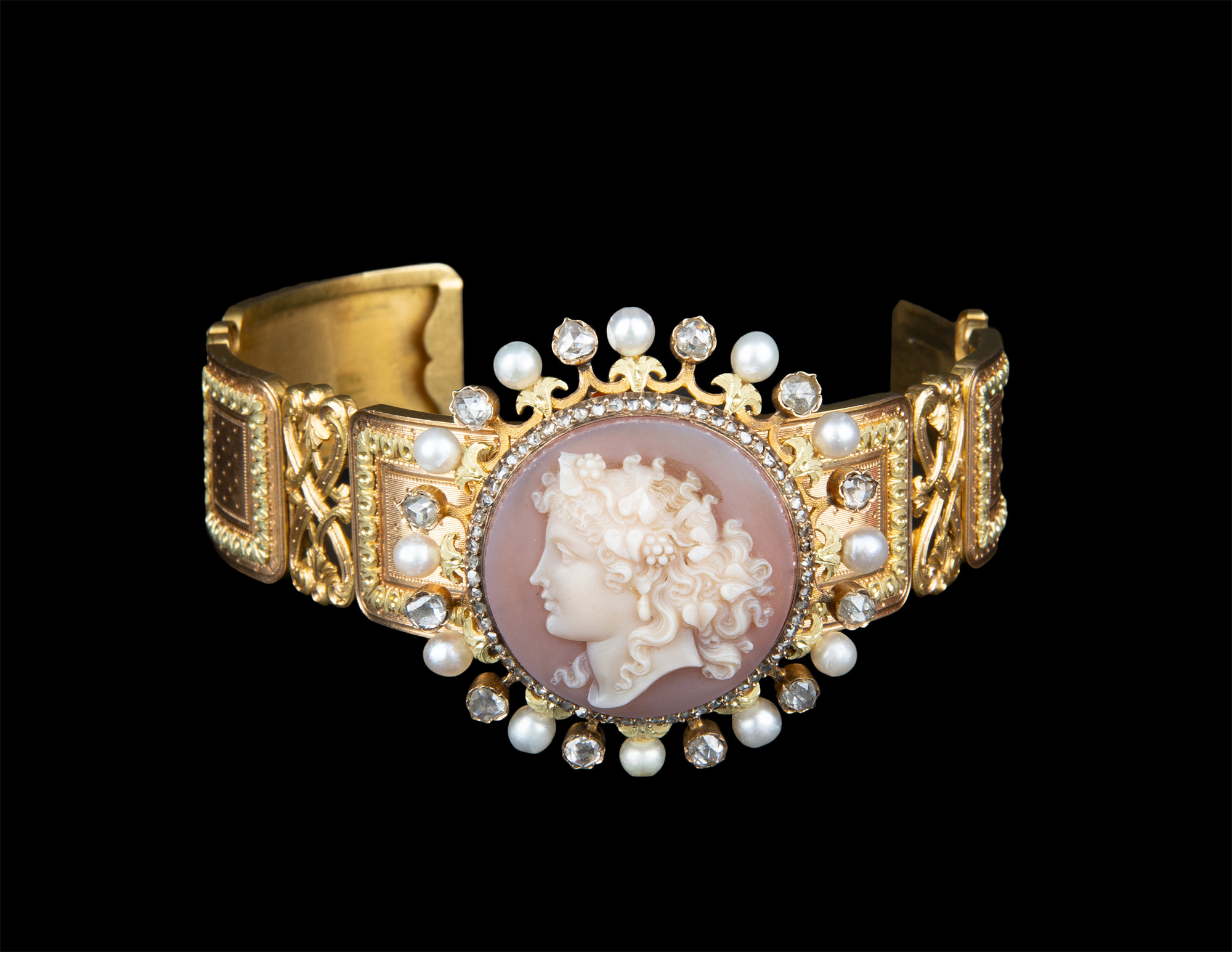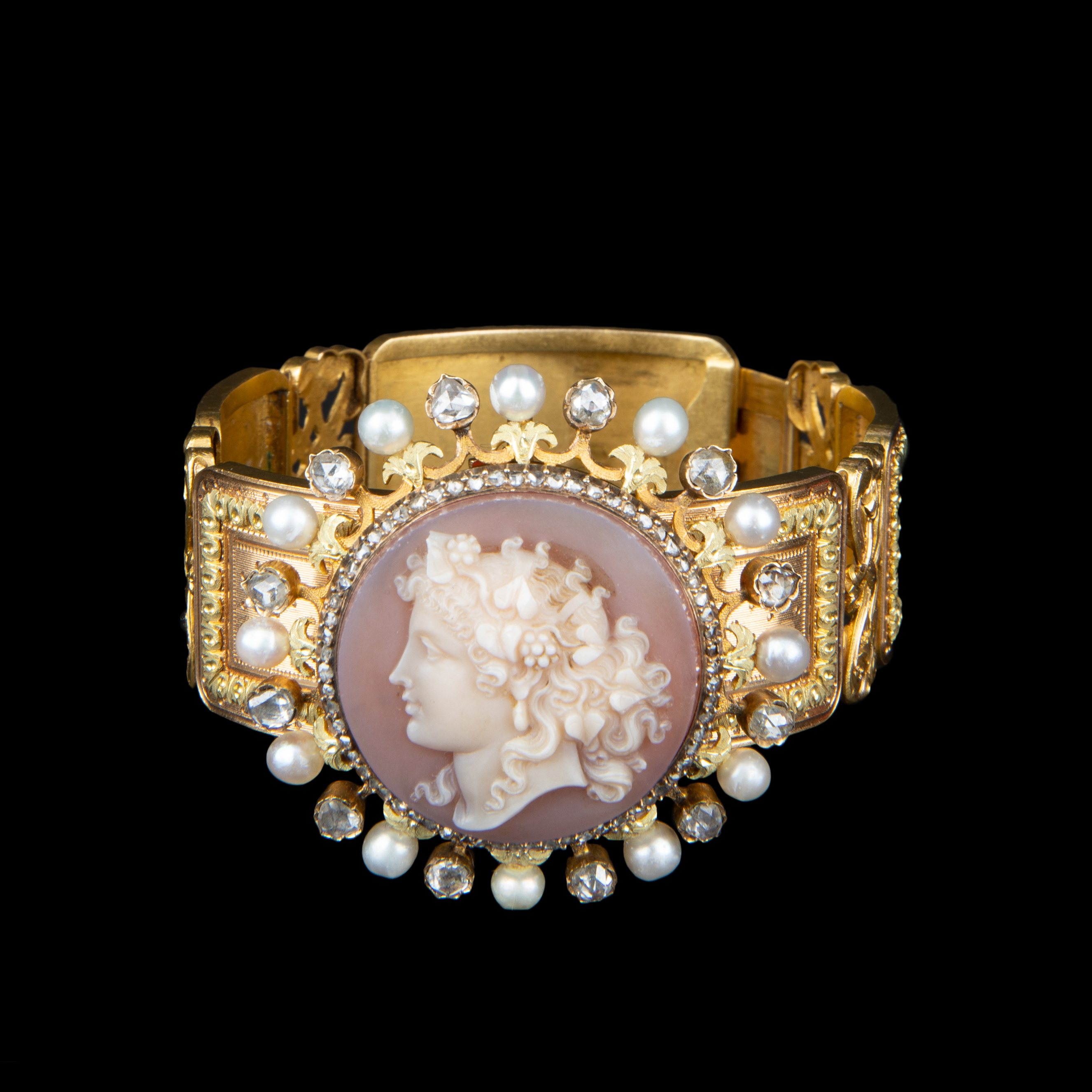 独角鹿西洋古董18K金镶嵌珍珠钻石玛瑙浮雕卡梅奥cameo手镯手链