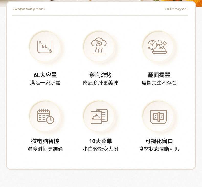 6.0~200℃控温,0~30分钟调节,不同食材选择专属方法