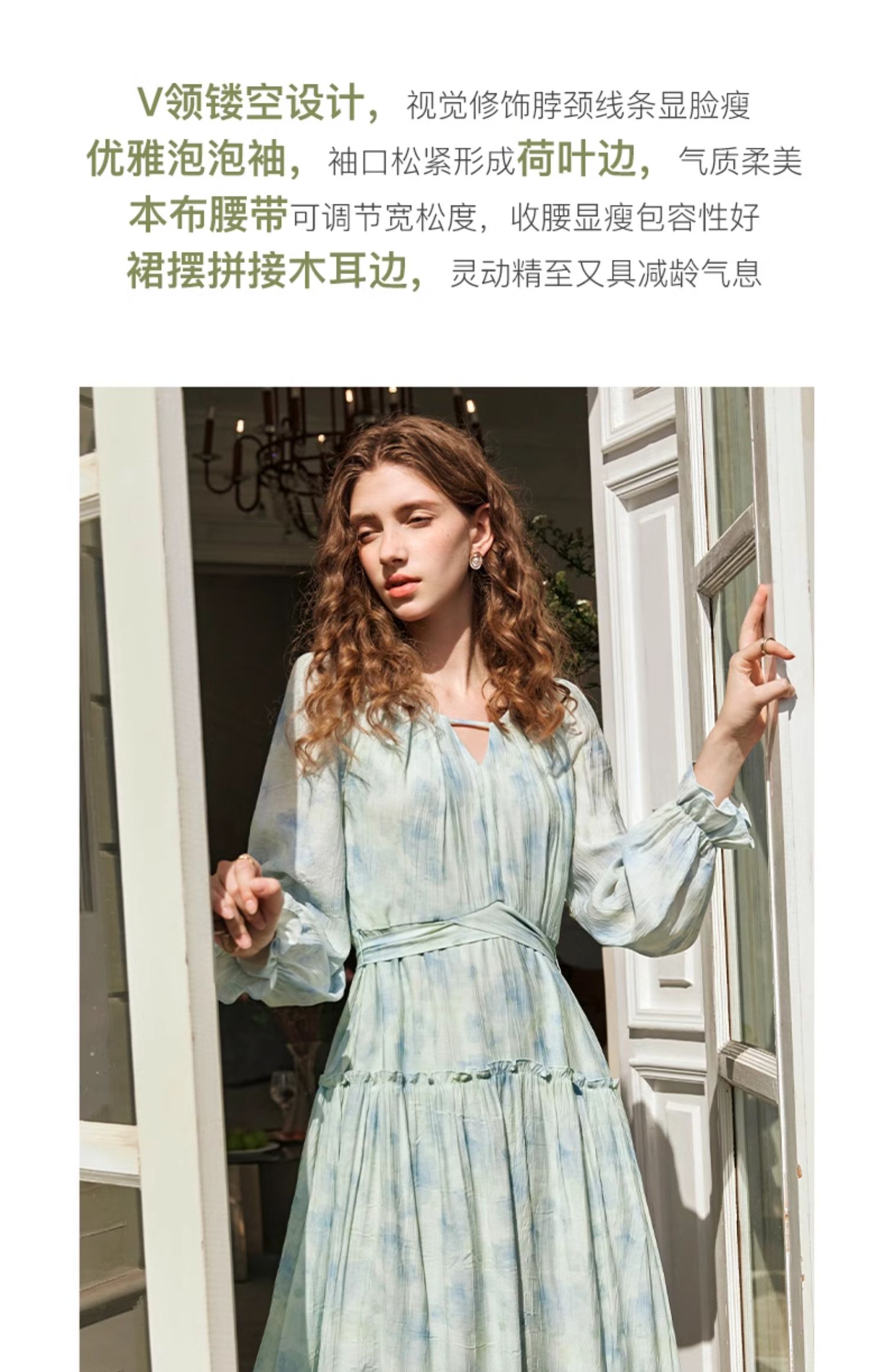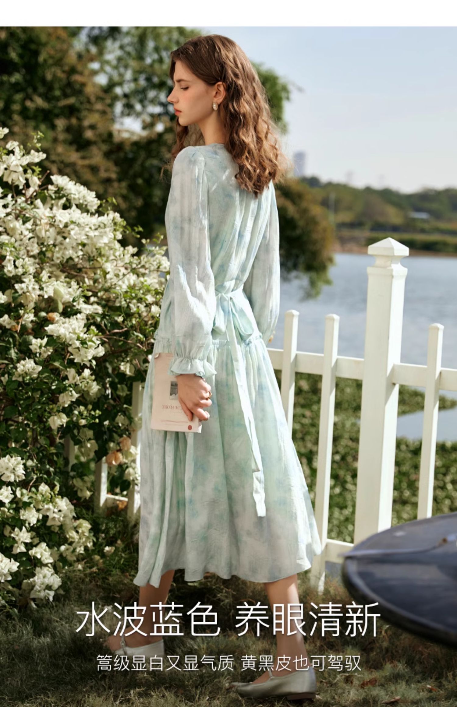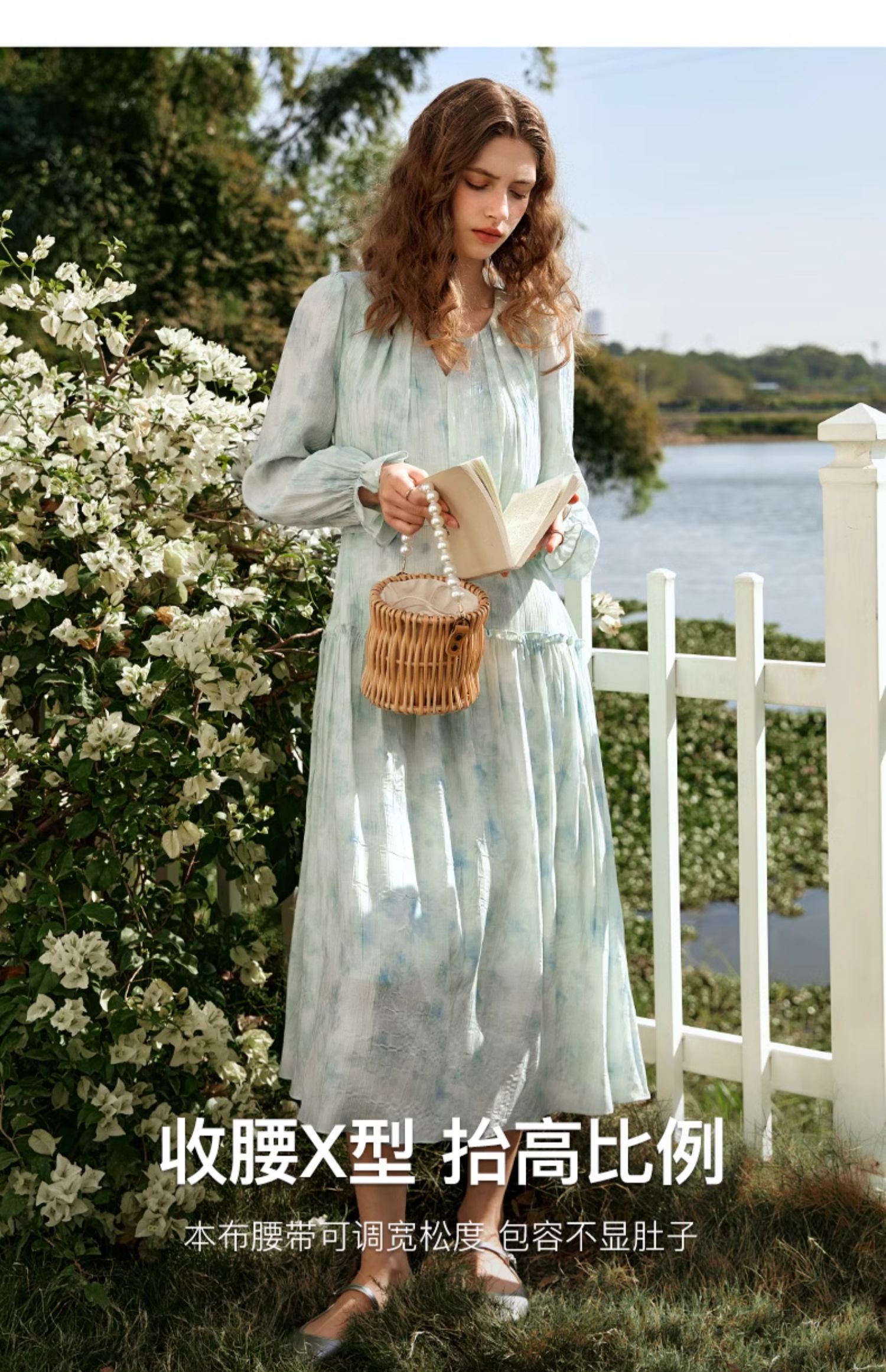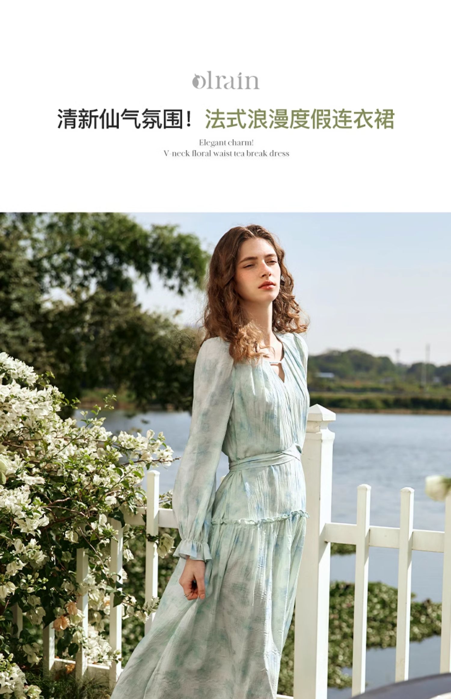 欧芮儿法式碎花连衣裙女初春2024新款v领蓝色浪漫气质茶歇长裙