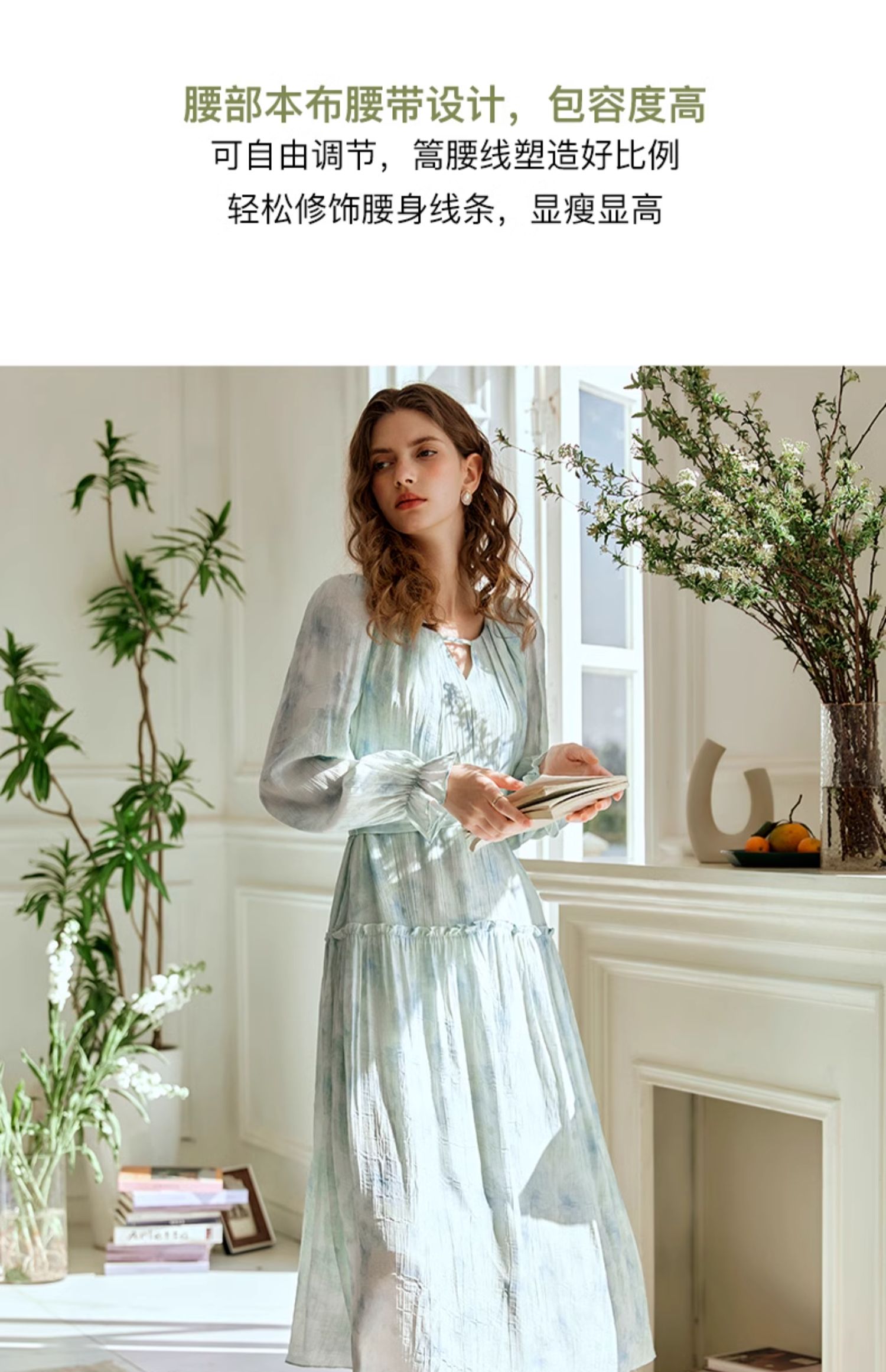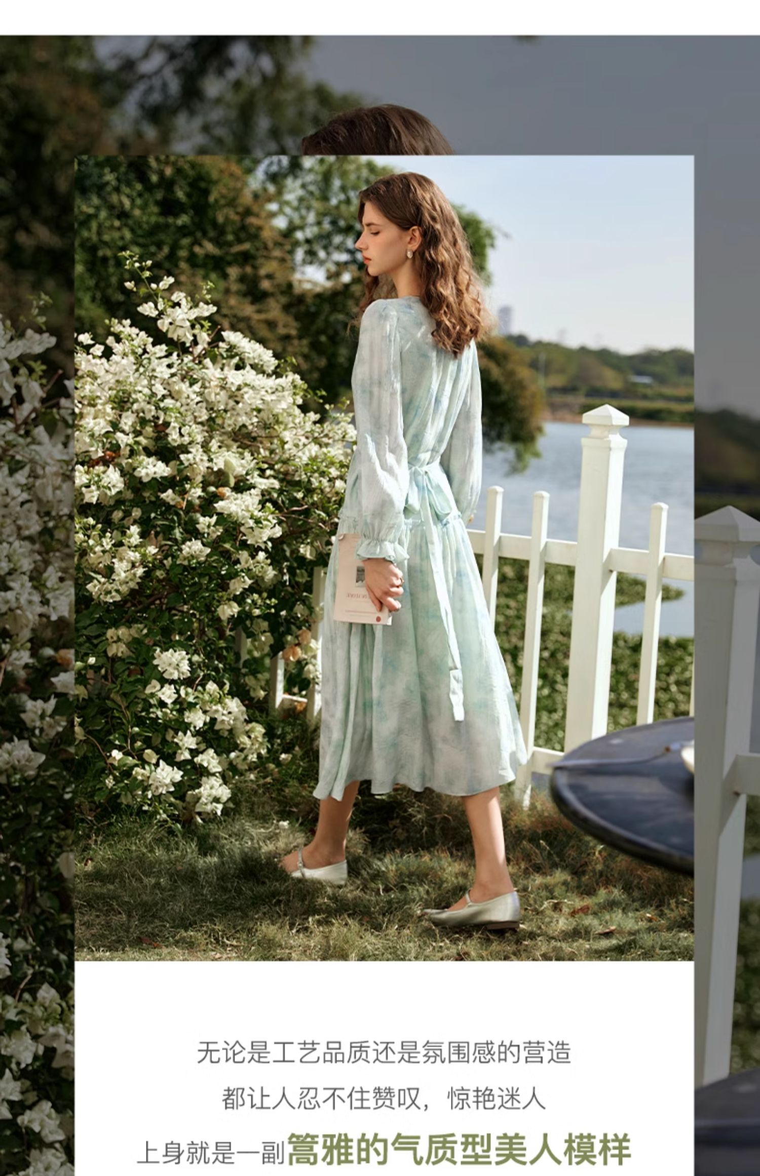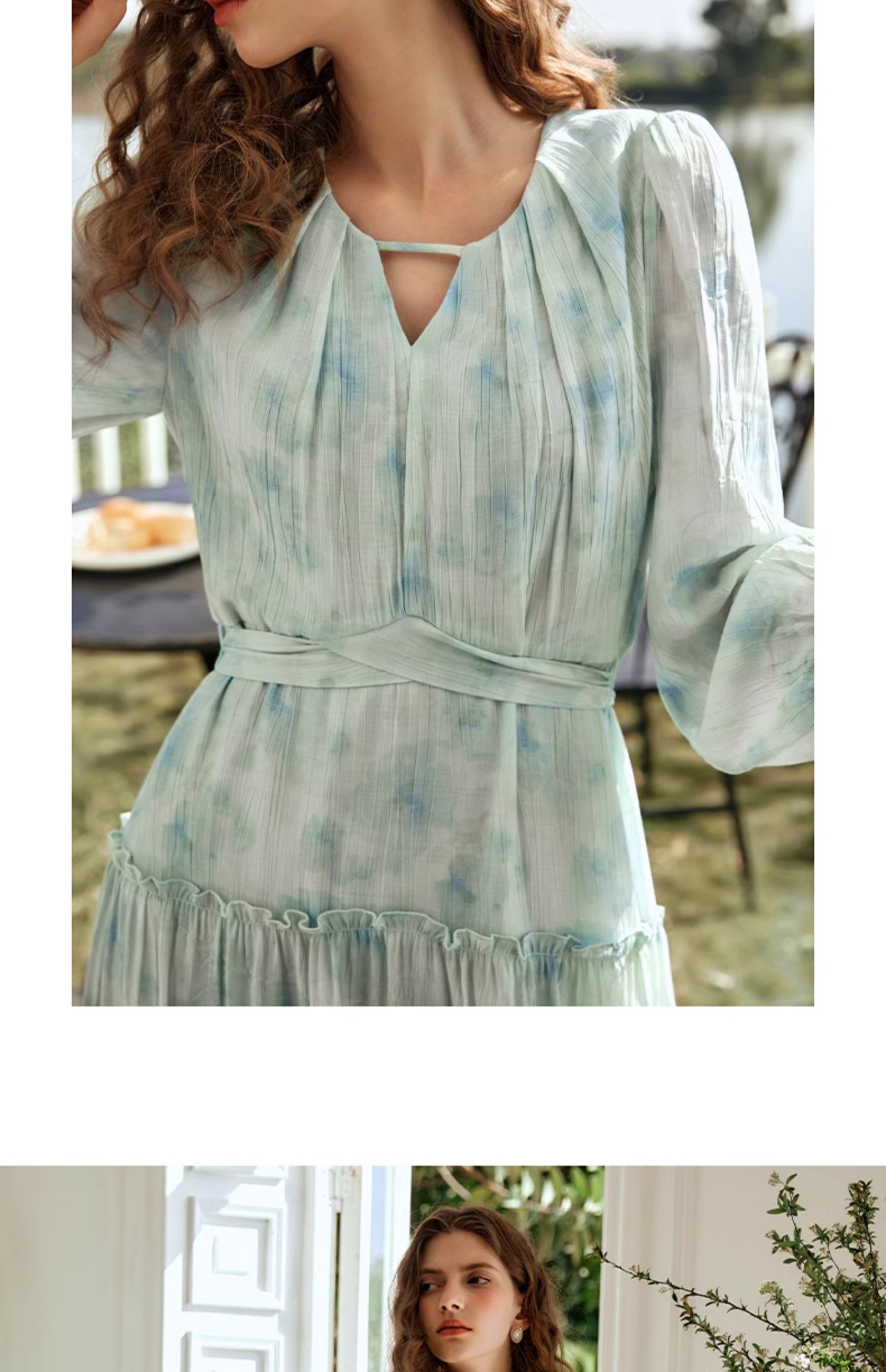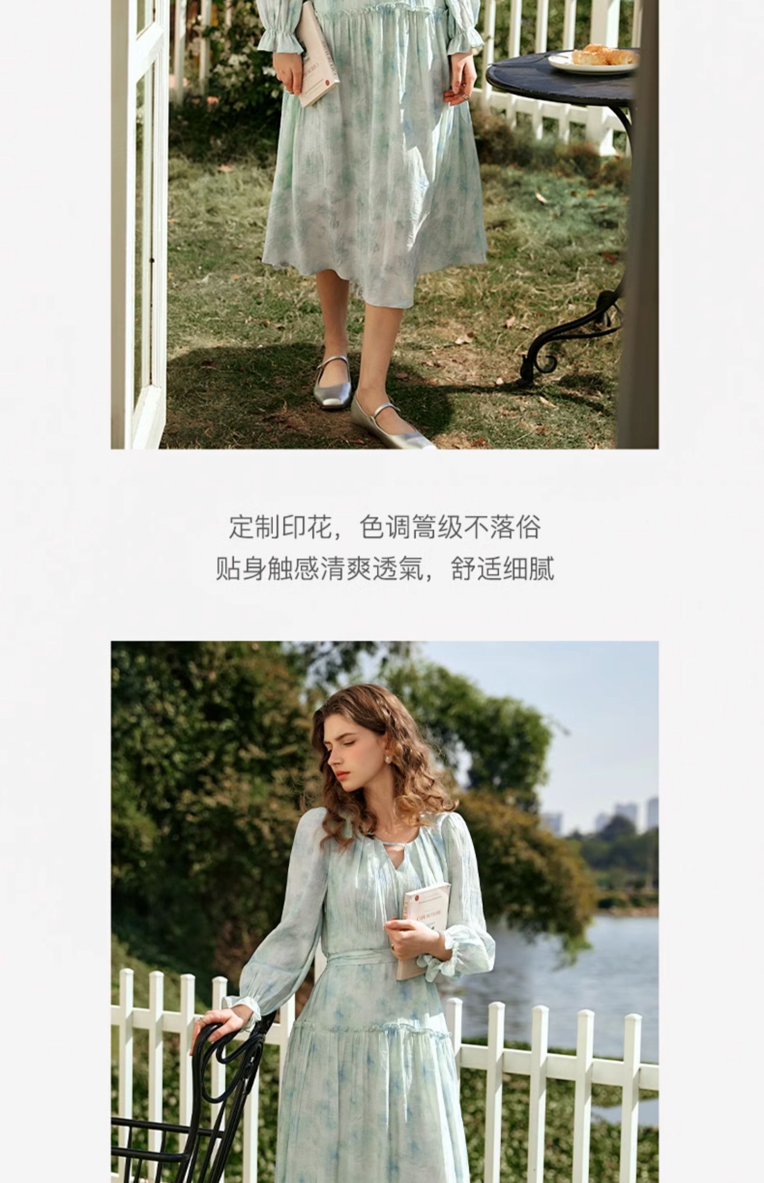 欧芮儿法式碎花连衣裙女初春2024新款v领蓝色浪漫气质茶歇长裙