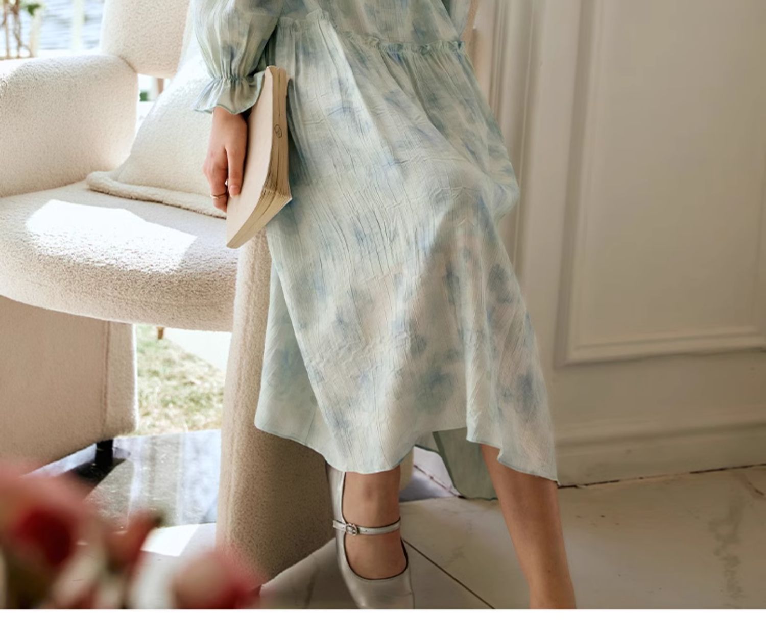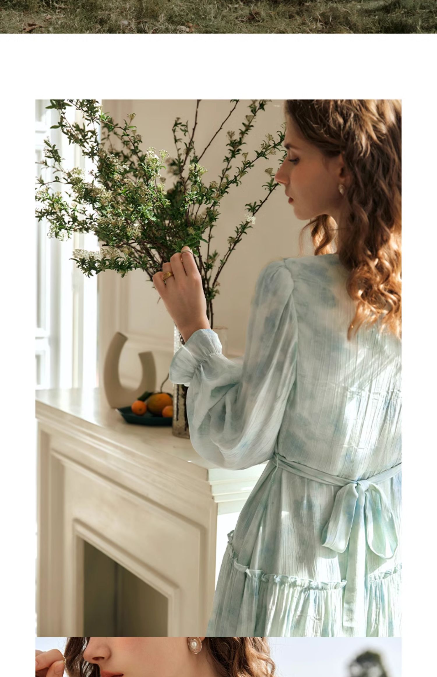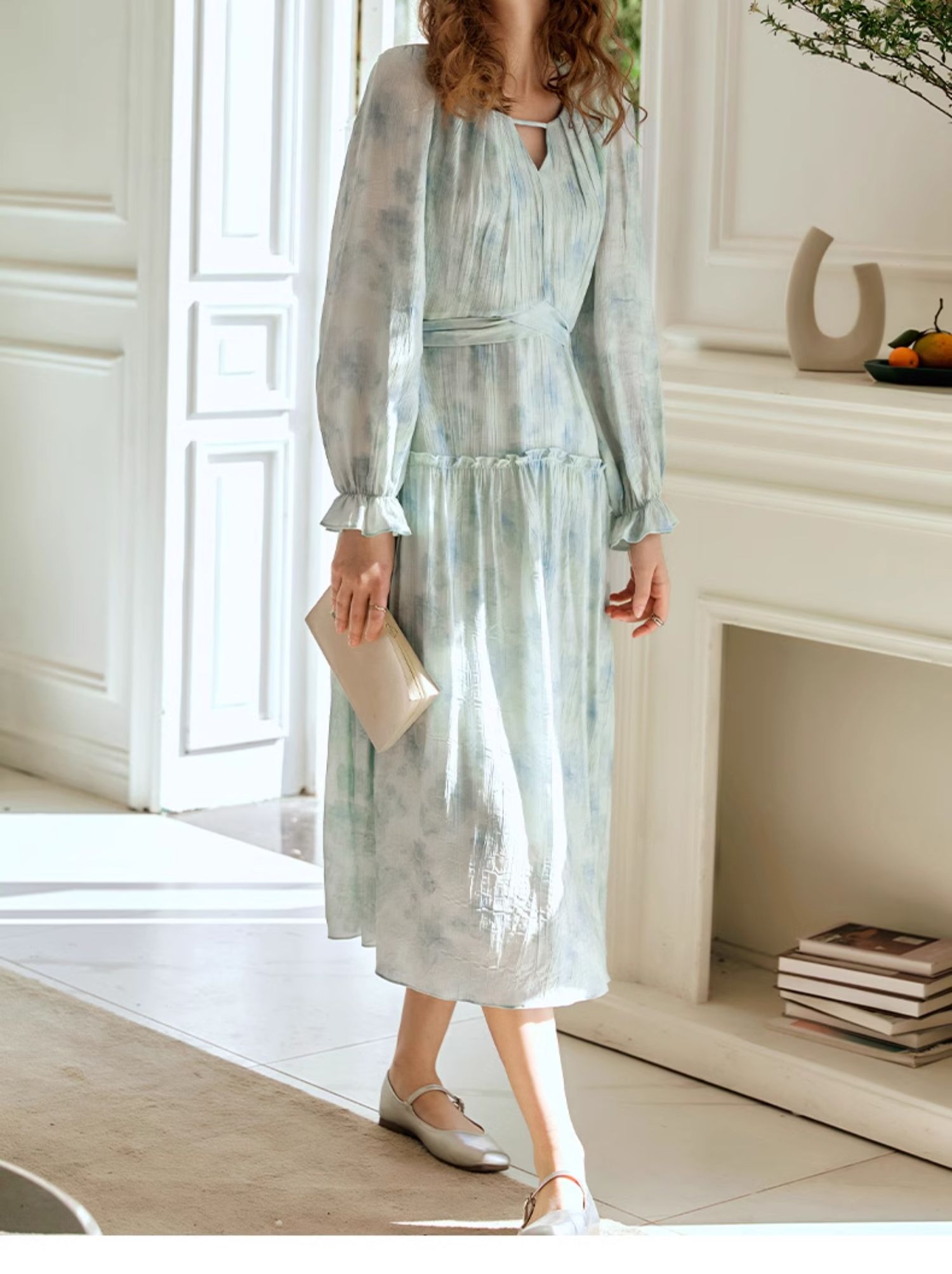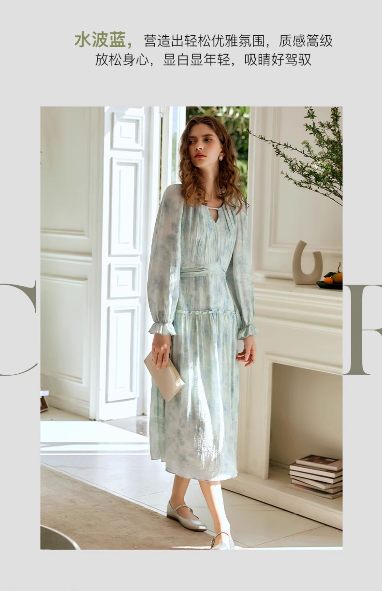 欧芮儿法式碎花连衣裙女初春2024新款v领蓝色浪漫气质茶歇长裙